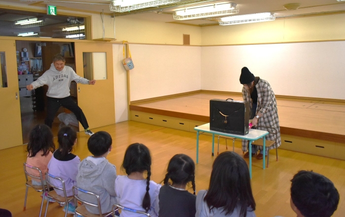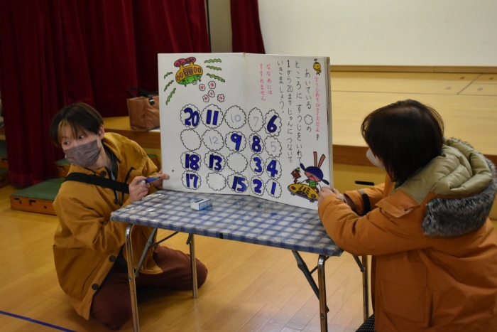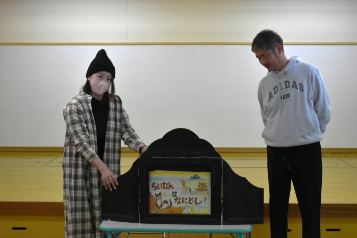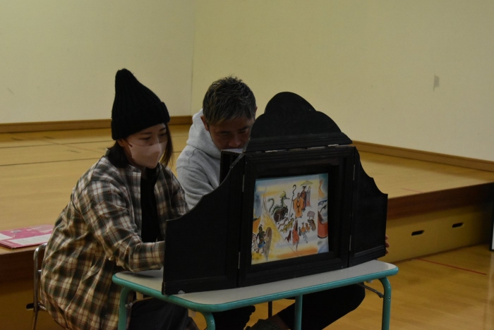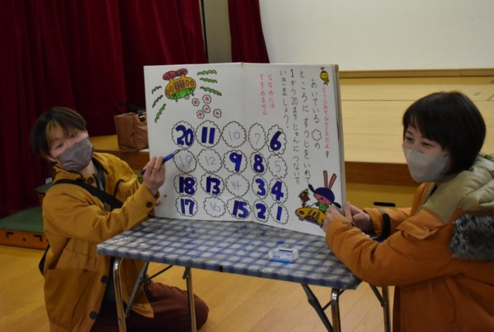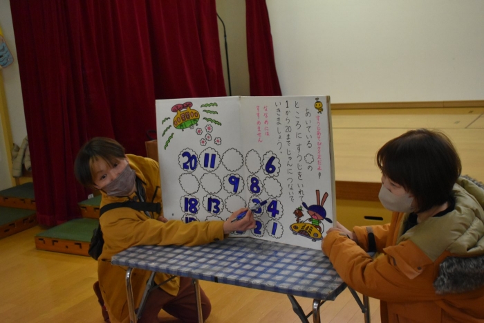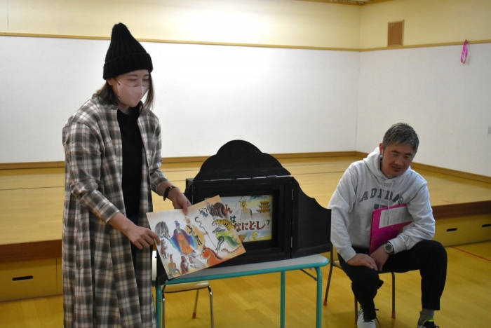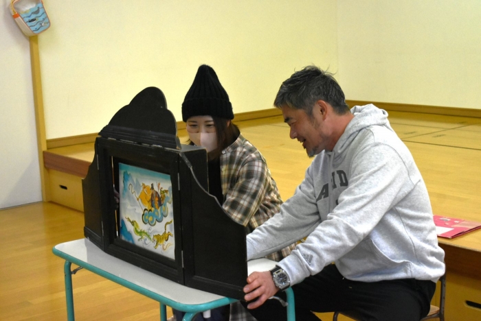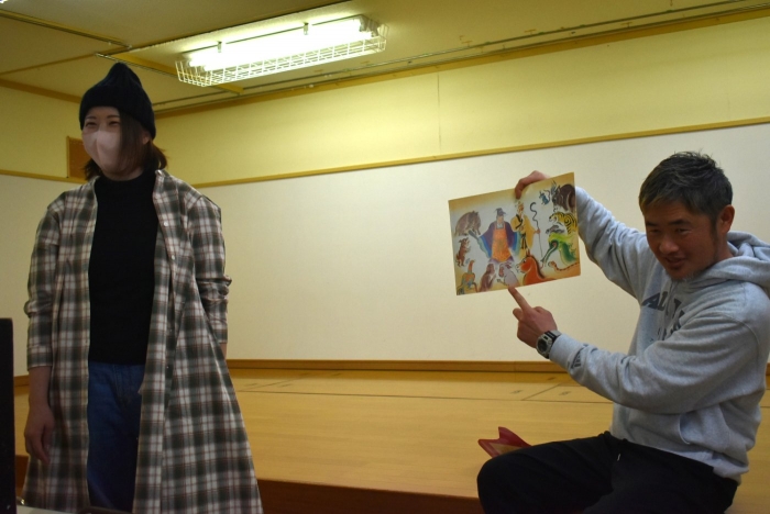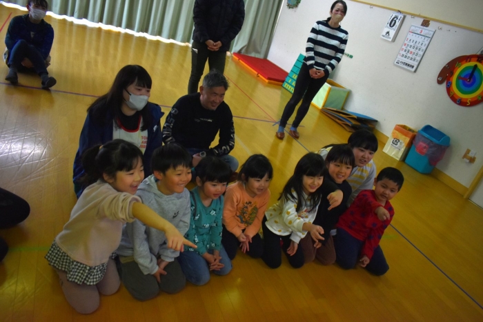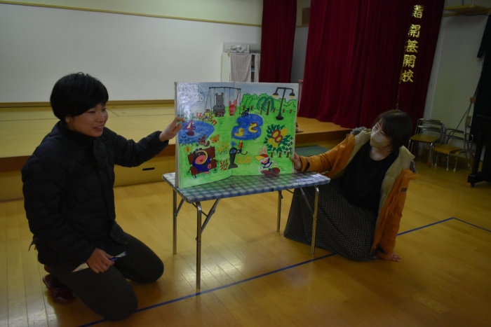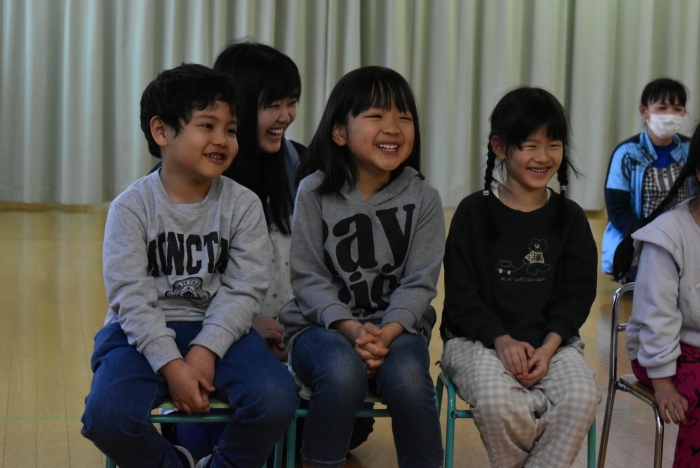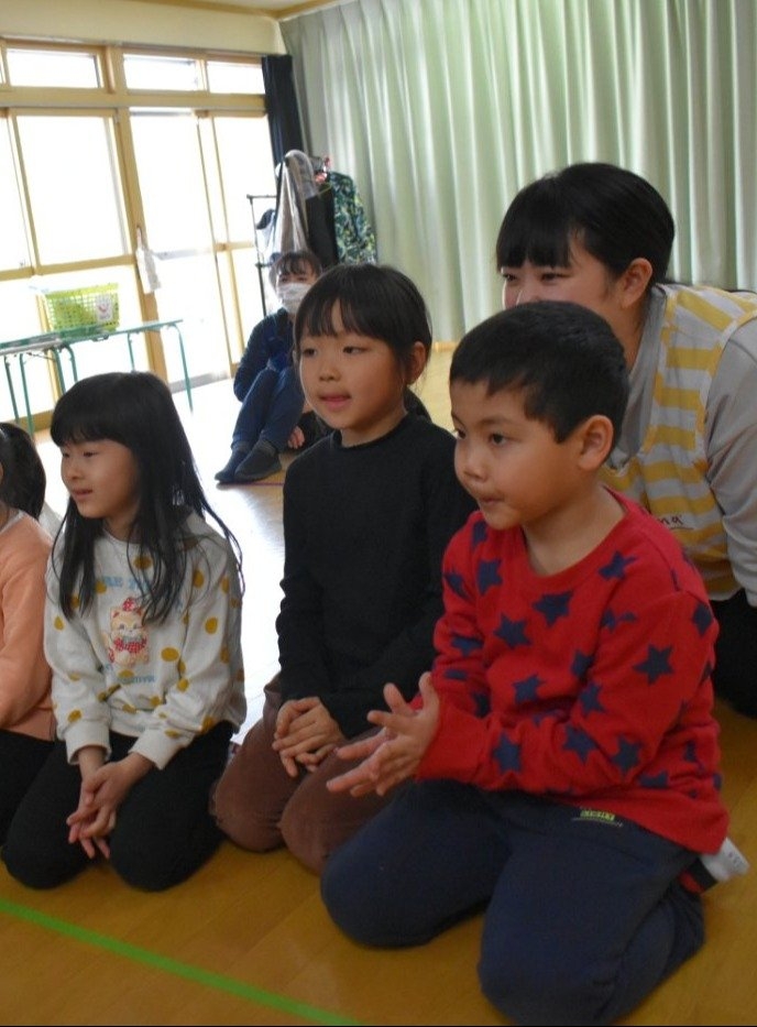 今回は,十二支の由来を題材にした『らいねんは なにどし?』という紙芝居を読み聞かせしてくださいました。お母さんの心地よい通る声と,全身全霊で役になり切るお父さんの見事な掛け合い。十二支+猫+王様+仙人と一人何役もこなさなければならない話でしたが,見事な演じ分けで すっかり物語の世界に引き込まれていた子ども達です。読み聞かせ後も,登場シーンでのお笑いネタをコラボしたり,自分・家族の干支の話をしたりと大盛り上がり! 気分も高らか,自分の干支の動物になり切って各教室へと戻りました。