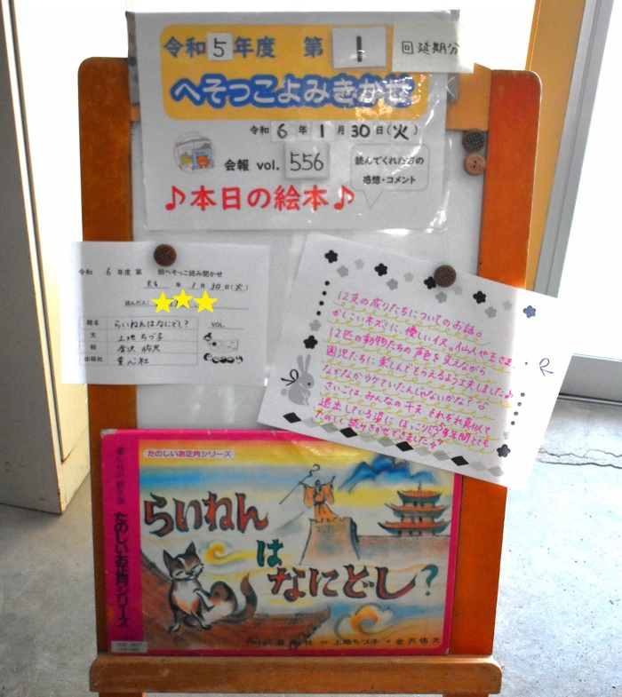 遅ればせながら,1/30 一家庭ずつ担当していただいた『へそっこ読み聞かせ』も最終回を迎えました。本年度は計5回,会としては累計556回もの読み聞かせをしていただきました。『合同読み聞かせ』も,どうぞ宜しくお願い致します。