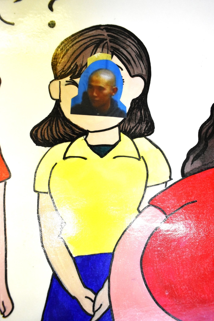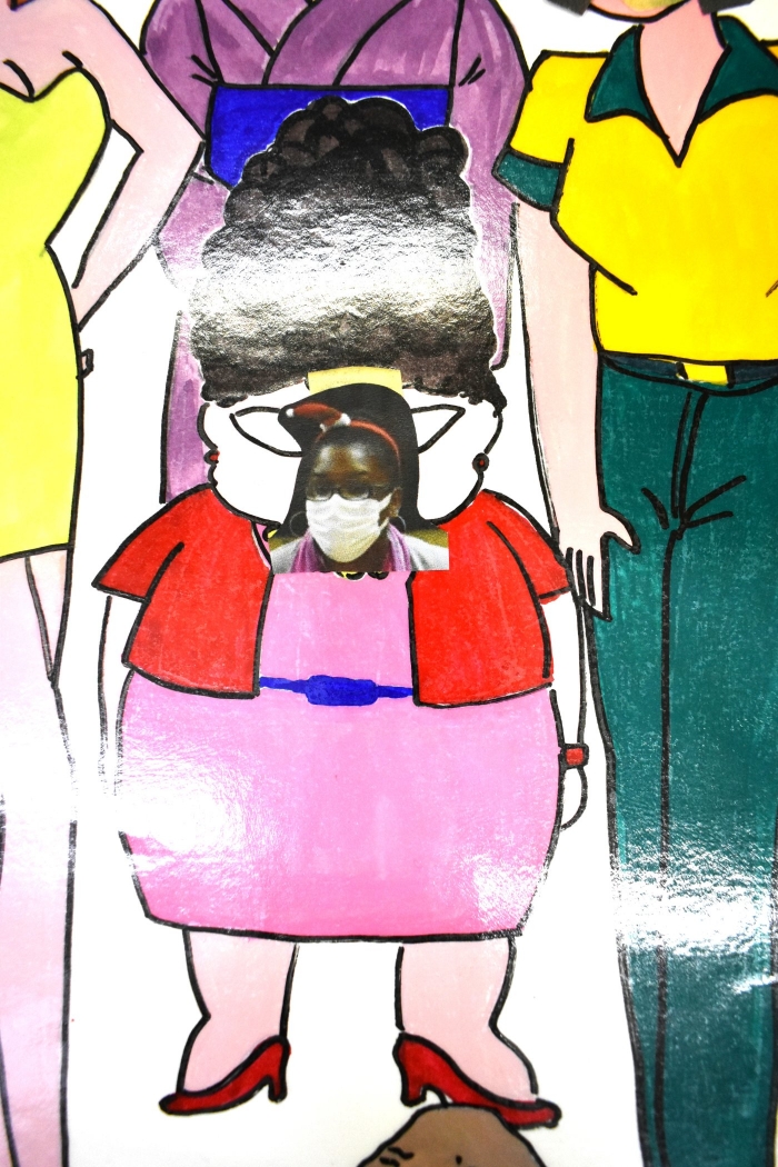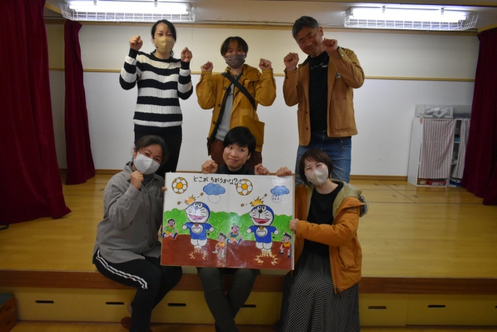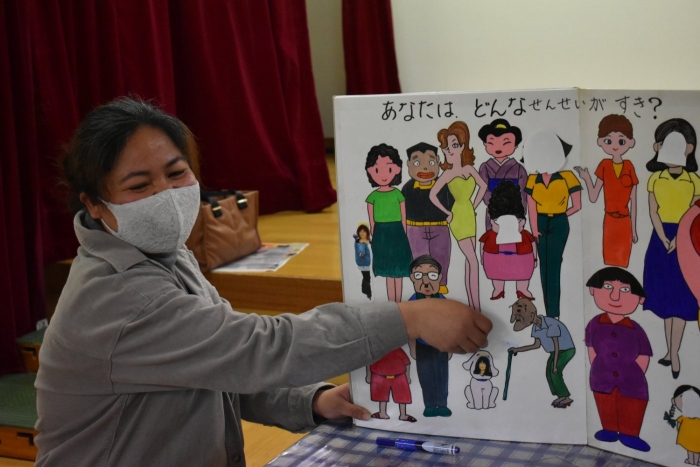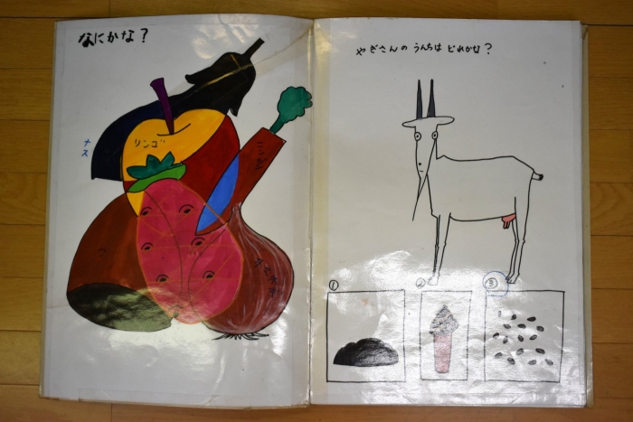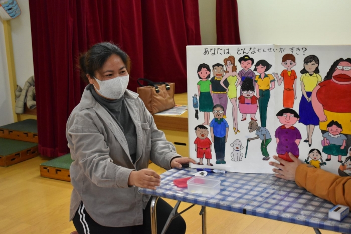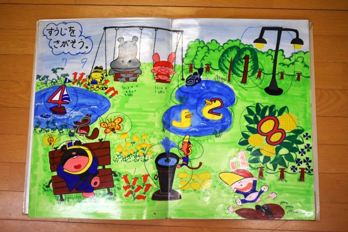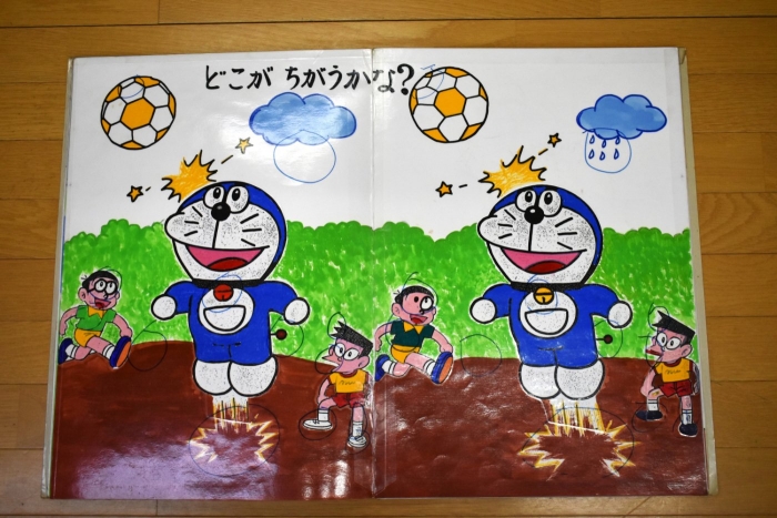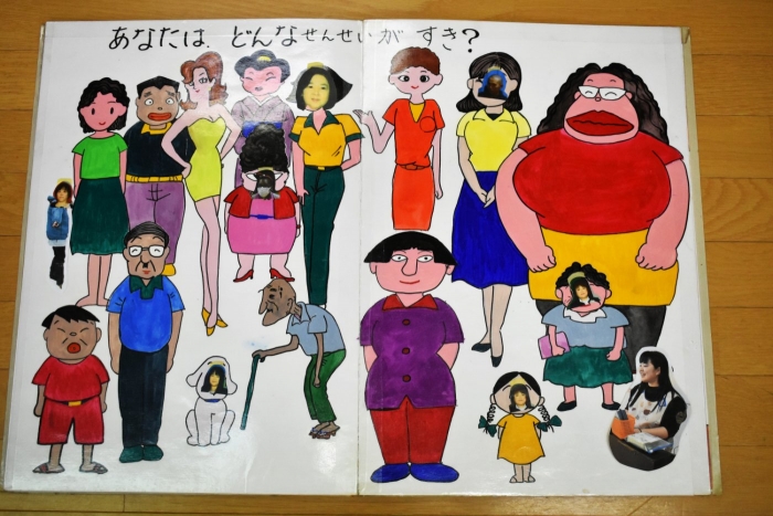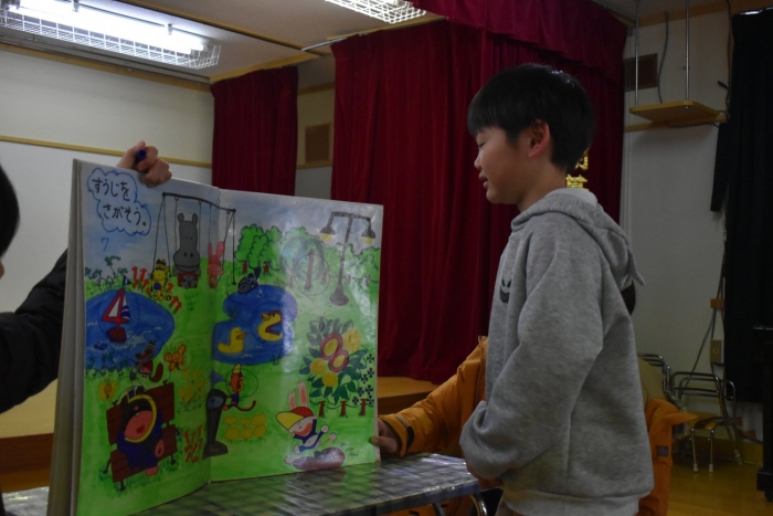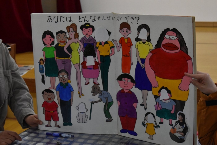絵の中に隠れている物・数字探しや間違え探し,迷路や数合わせなど,ページをめくるごとに様々な謎解きクイズがあり,その面白さにグイグイ引き込まれていた子ども達です。老若男女様々な人(動物)が描かれ「あなたは どんな先生はが好き?」と問い掛けているページでは,担任の先生方の写真も差し込まれていてビックリ! 更に,子ども達が「この先生!」と思う絵の顔部分に,上紙で隠された先生方の顔写真を次々に貼っていきました。上紙をペラッとめくると…,顔と体とのギャップに大爆笑(^^♪ 太鼓の武藤師匠や ALTのディー先生の顔写真まであり,大いに会場をわかせていました。 何といっても,お父さん&お母さん方の巧みな話術,プラスαの仕掛けが ,子ども達の心をわしづかみにしていました。