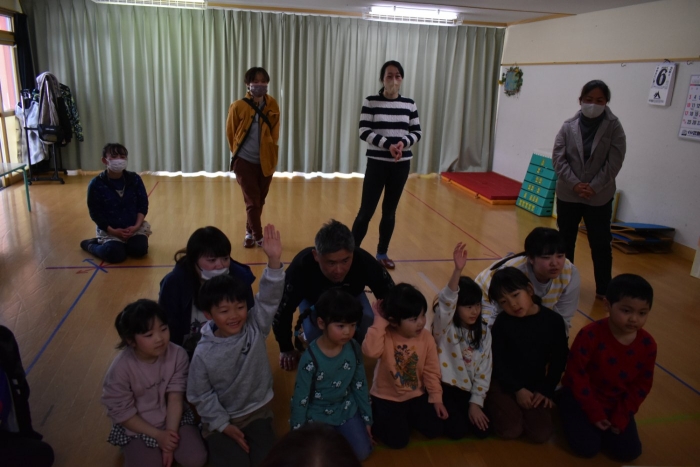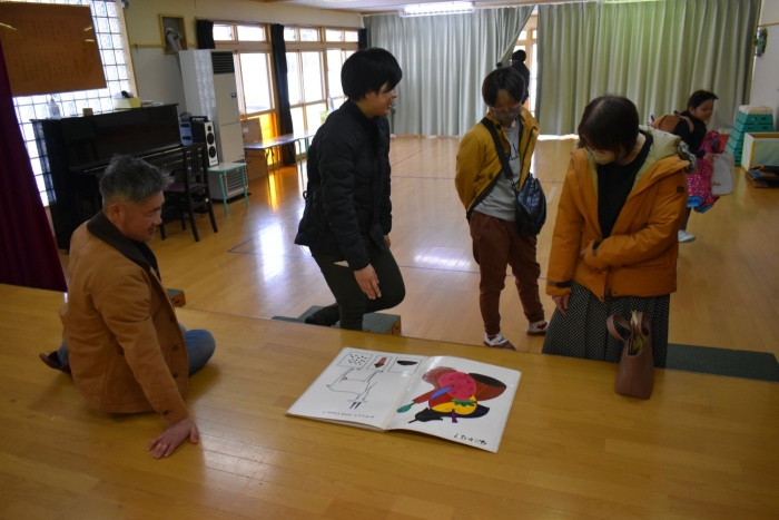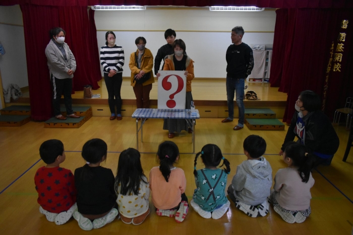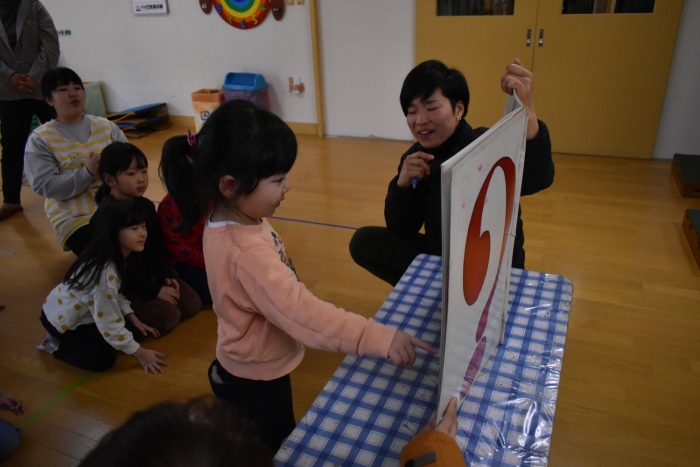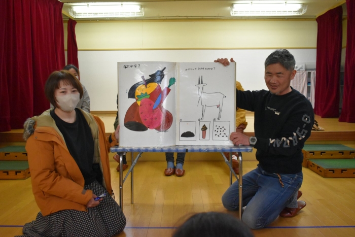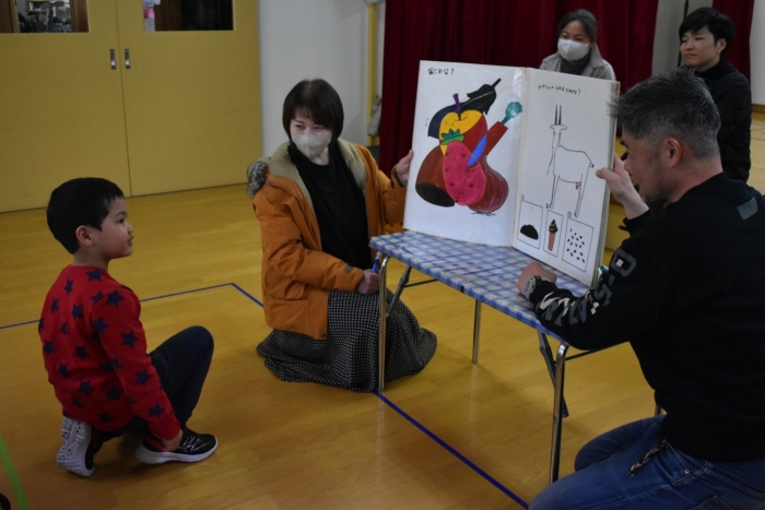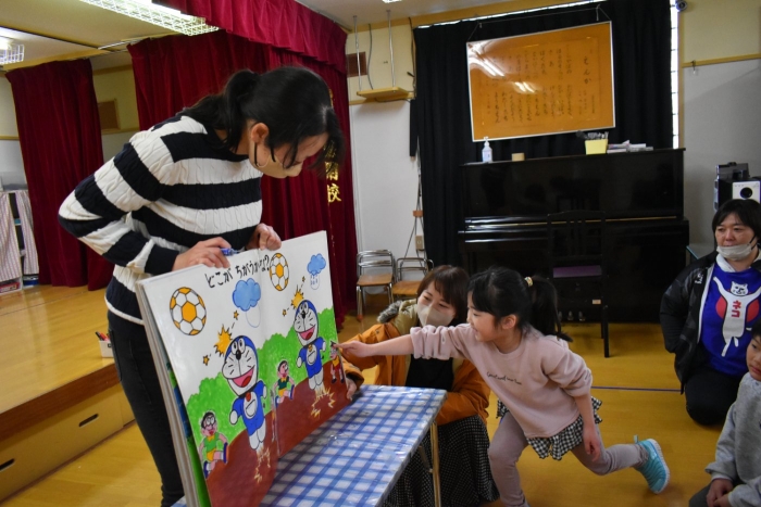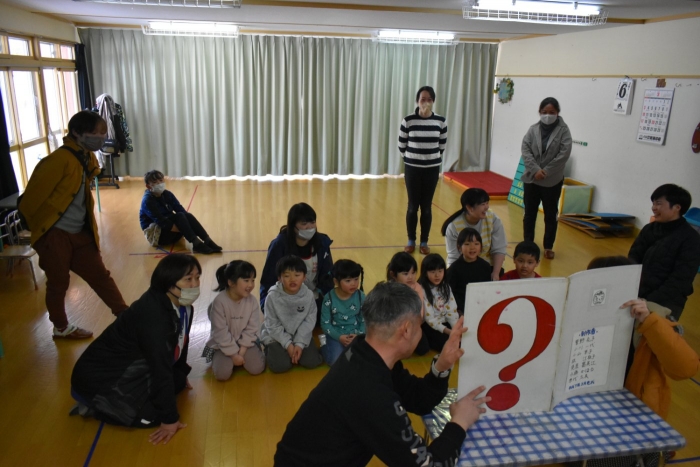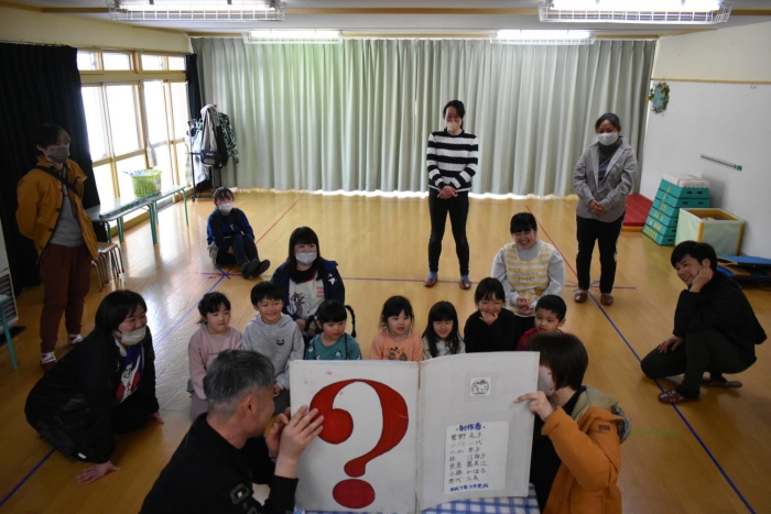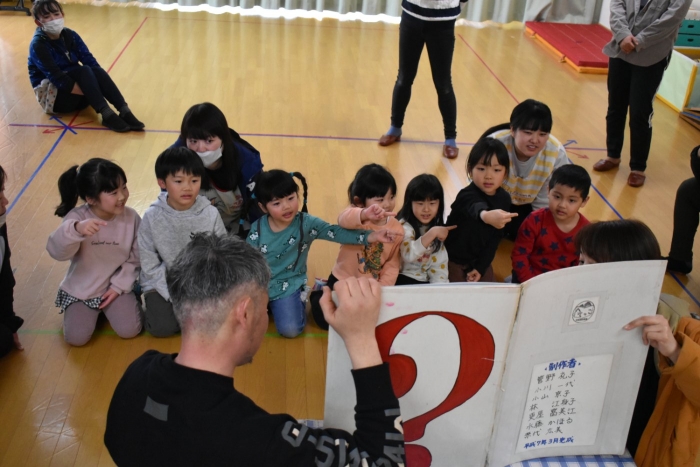 2/6…『親と子の絵本の会「へそっこ」』活動の締め括りとして『合同読み聞かせ』を実施。歴代の保護者の方が手掛けた大型絵本の中から『?』という参加型の絵本を読み聞かせしていただきました。