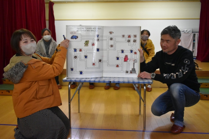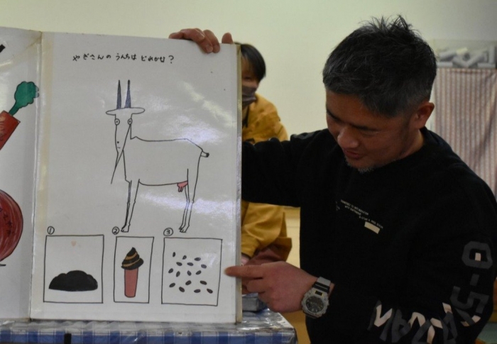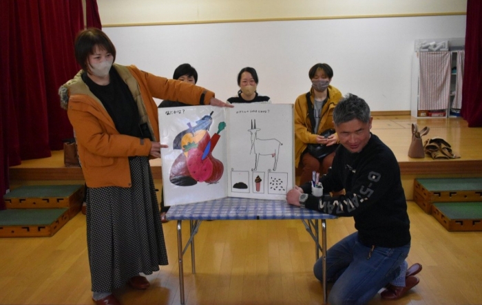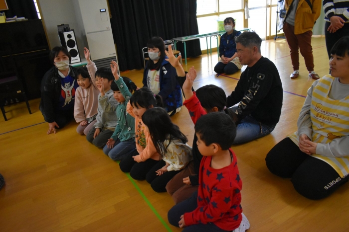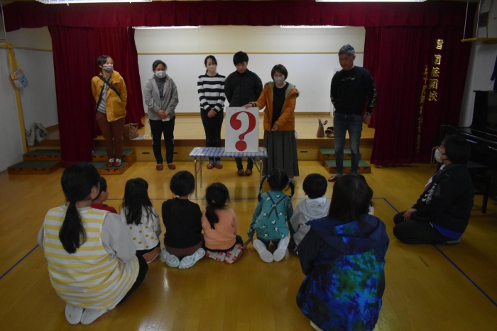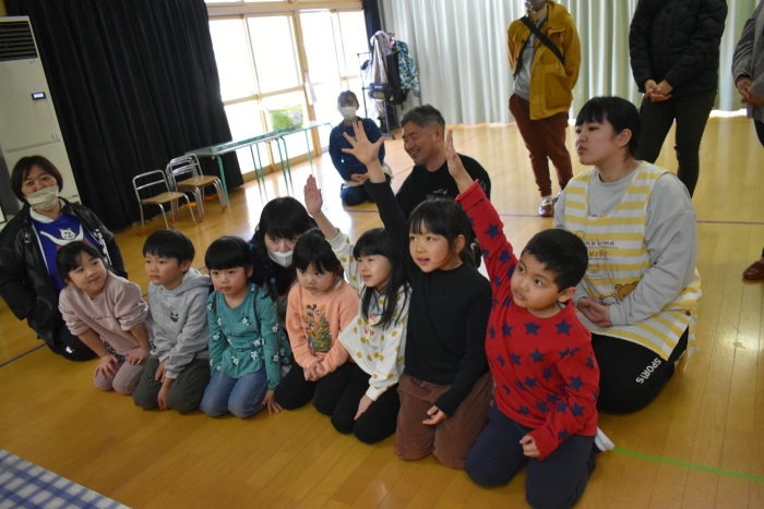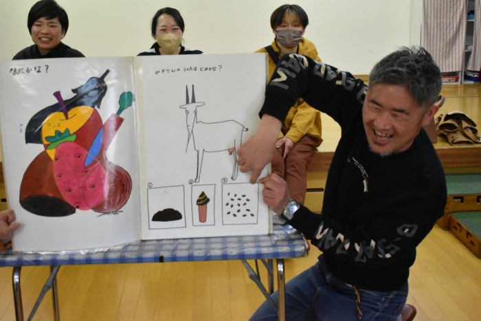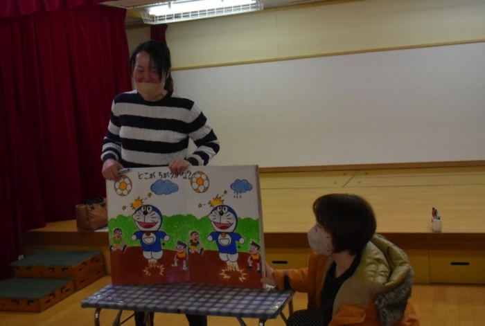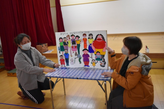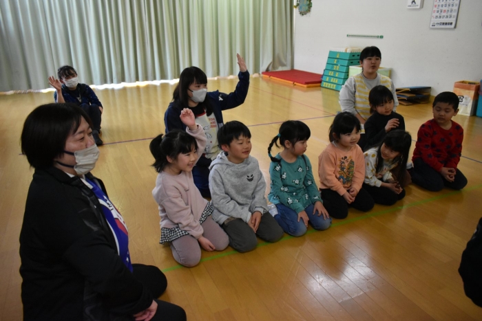 2/6…『親と子の絵本の会「へそっこ」』活動の締め括りとして『合同読み聞かせ』を実施。歴代の保護者の方が手掛けた大型絵本の中から『?』という参加型の絵本を読み聞かせしていただきました。