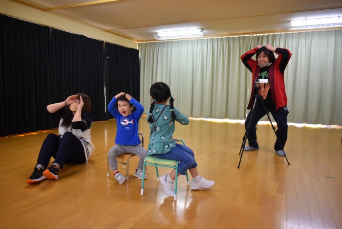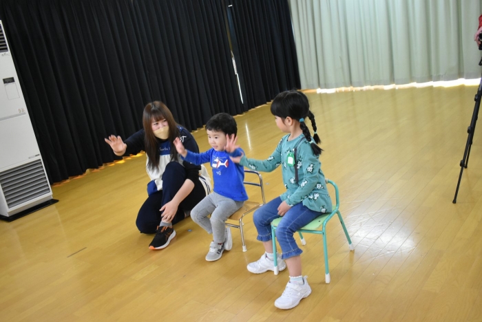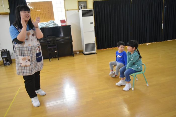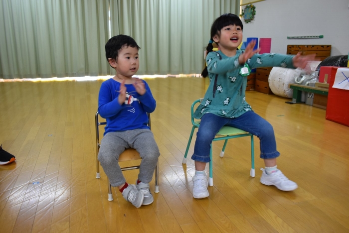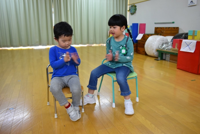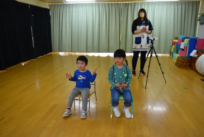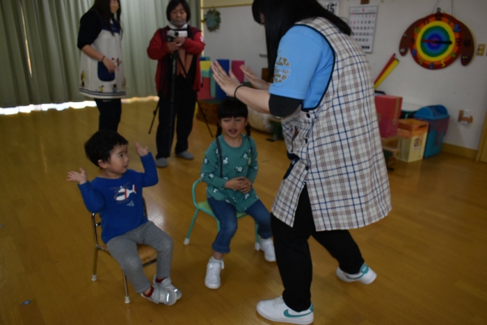 誕生会リハーサル風景① ~ 祝う側の拍手練習  年長児が年少児へ伝授