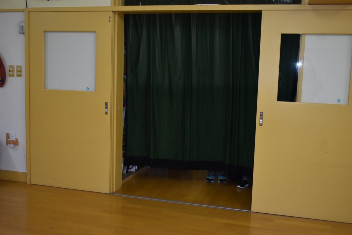 誕生児は廊下で待機中  カーテン裏でドキドキ ワクワク♪