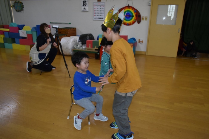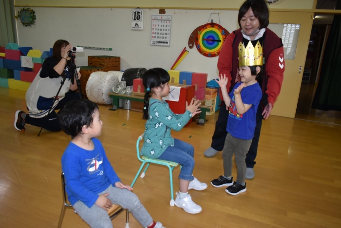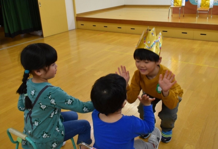 中西別幼稚園の誕生会では,誕生児の入退場を拍手&ハイタッチで祝福するのが恒例。年少児に合わせて姿勢を低くしたり,タッチのタイミングを合わせたりする年長児。ハイタッチの楽しさを知り笑顔がこぼれる3歳児。日頃からの温かな関係性を感じさせる ほのぼの場面でした(^^♪