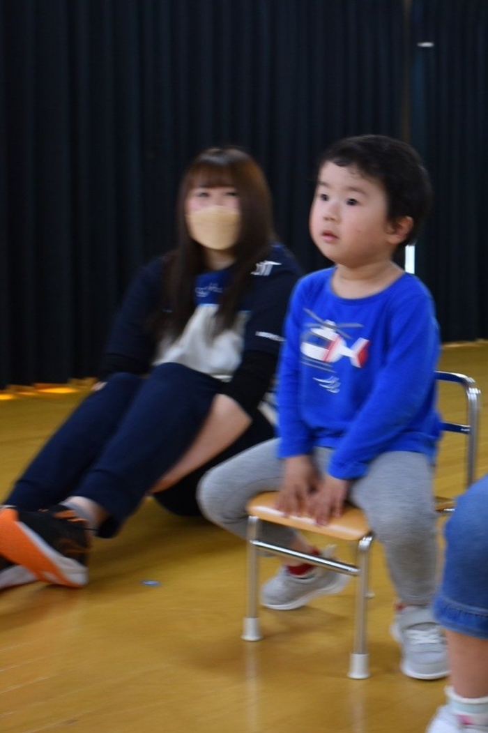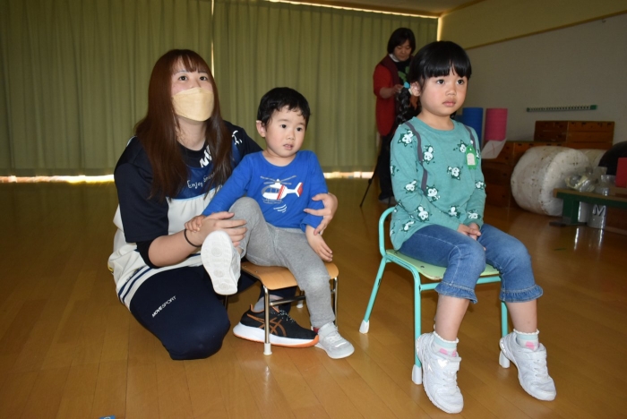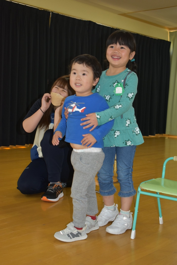 続いては,年少組誕生児の出番です! ドキドキがピークで,先生にぴったんこ(^^♪