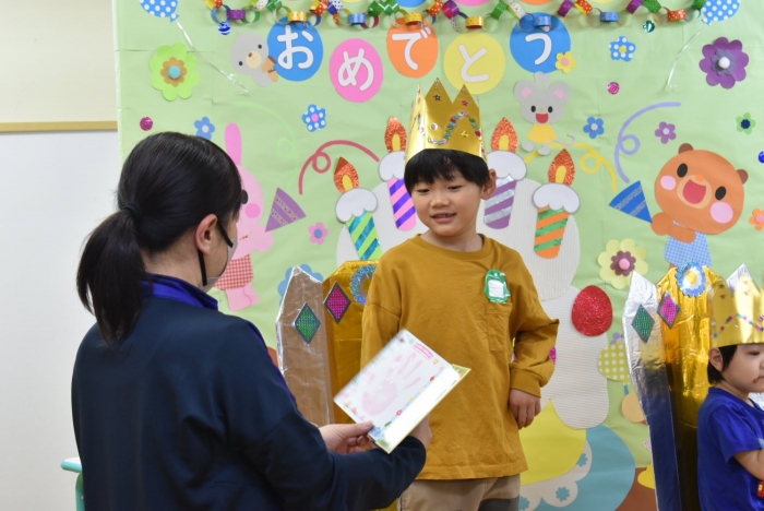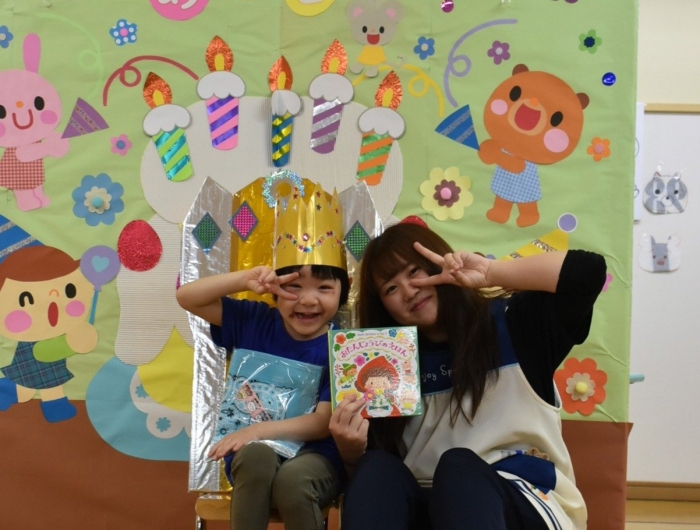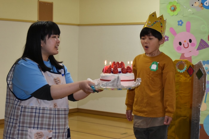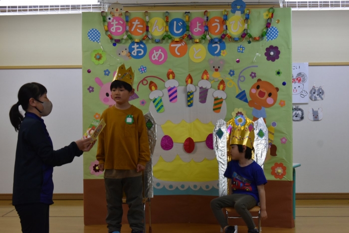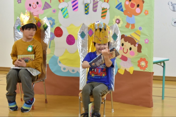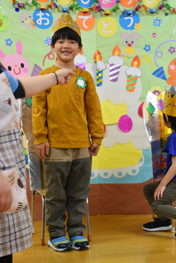 この日を心待ちにしていた年長組の誕生児は、ステージ上でも余裕の自己紹介や質問への受け答え。年少組の誕生児も,ドキドキしながらも しっかり受け答えをしていました。誕生日絵本やプレゼント,年の数だけ吹き消すケーキのロウソク,友達からの誕生日の歌のプレゼントに目を輝かせていた誕生児です。