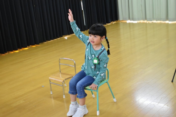 質問のある人は手を挙げて!  あら!? 隣が空席に…誕生児席(キラキラ椅子)に吸い寄せられていきました(笑)