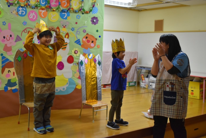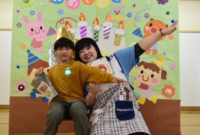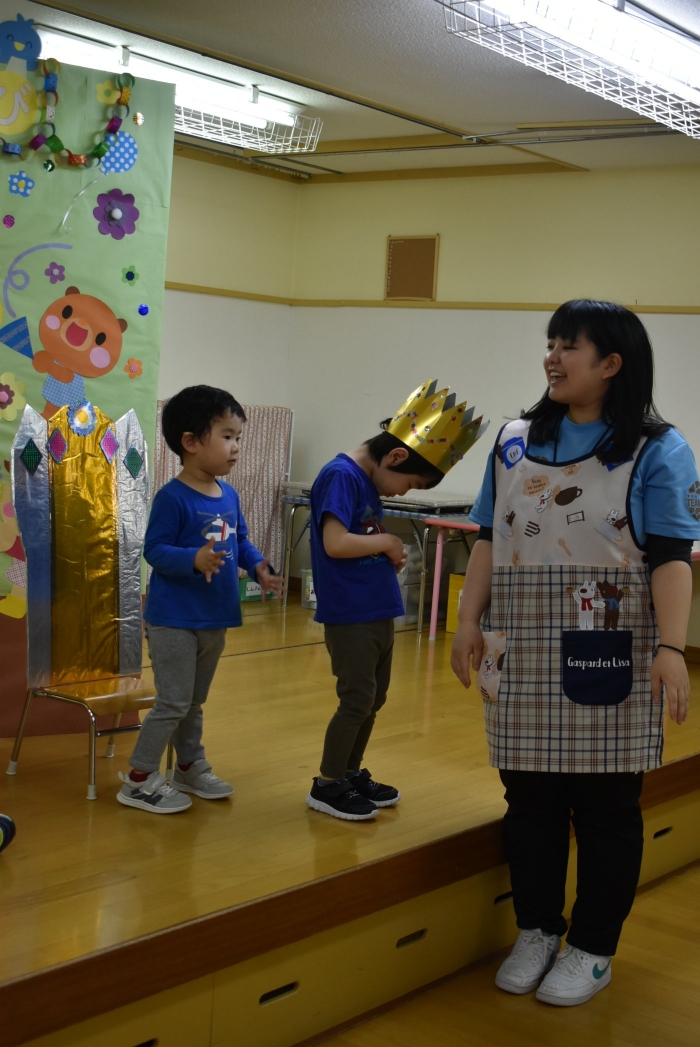 続いての誕生児は,せーの「Kくーん!」  年少組誕生児の入場☆彡
