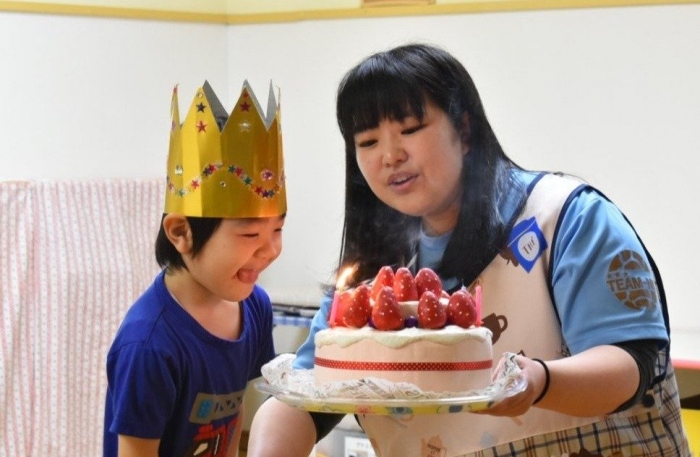 嬉しそうな誕生児の姿に,お祝いする友達もニッコニコ(^^♪