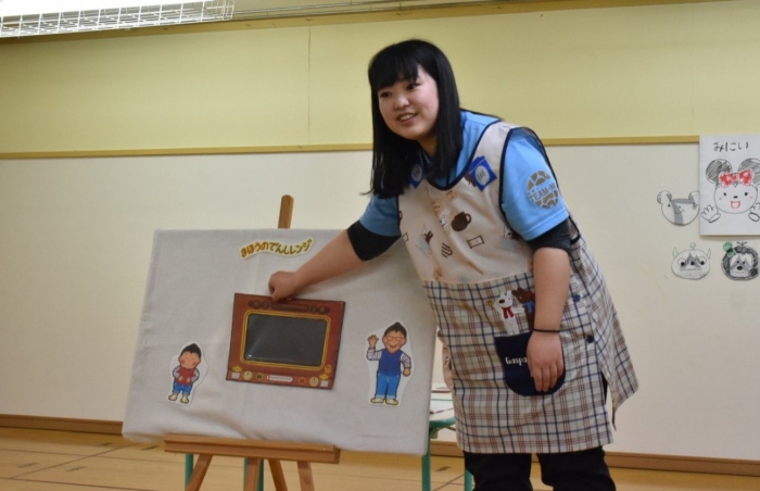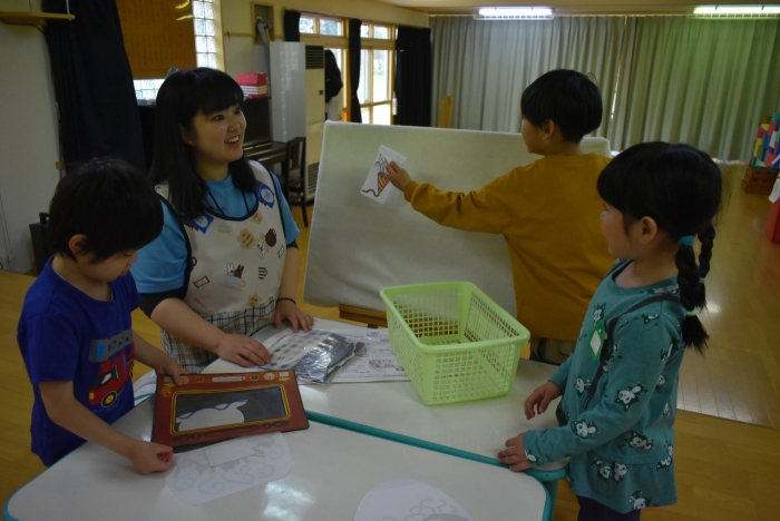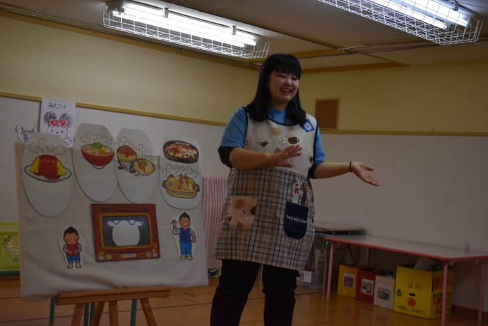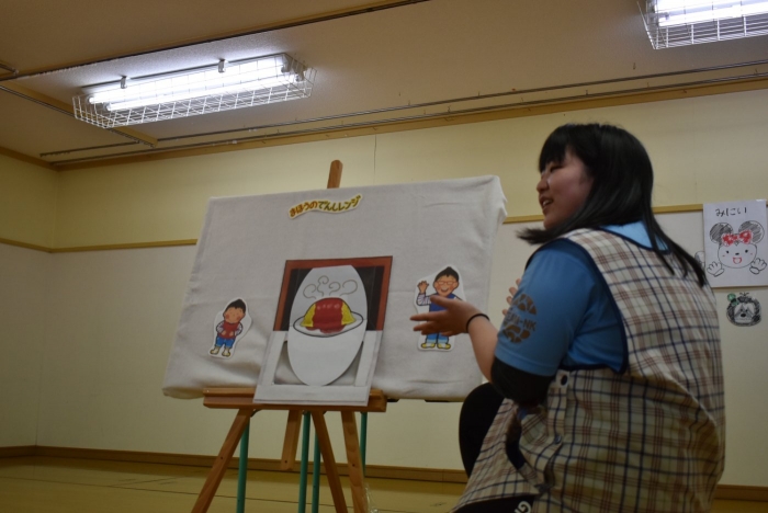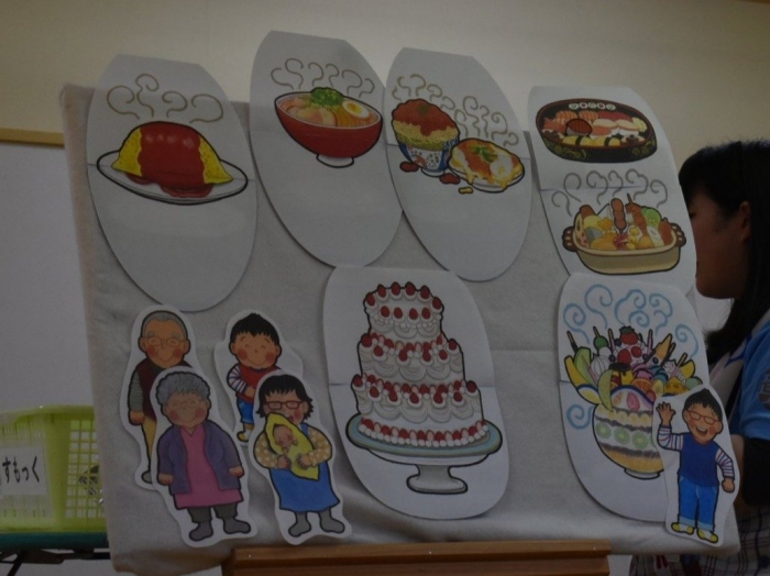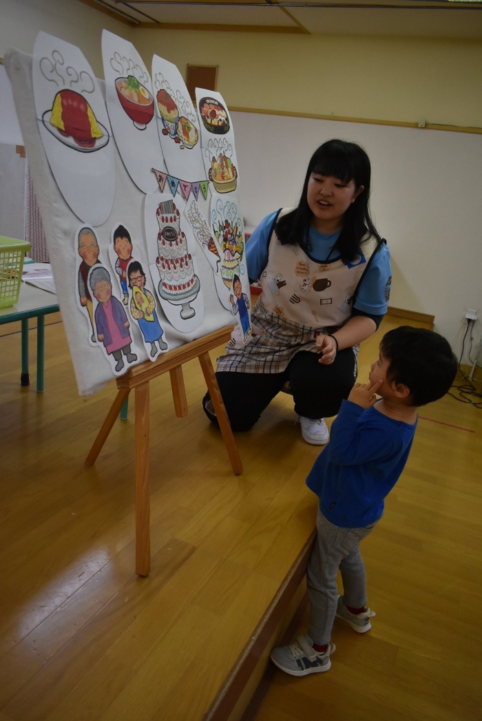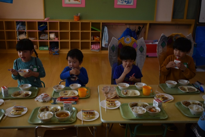 誕生児の紹介後は,お楽しみタイム! 今回は,仕掛けがいっぱいのパネルシアター『まほうのでんしレンジ』を楽しみました。魔法のレンジから,次々と出てくるご馳走に,「{なんで?  」「どうして?」「おいしそう♪」と目を輝かせていました。給食時には,誕生会おやつ『鯉のぼりパンケーキ』も味わい,特別・格別な一日を過ごした子ども達です。