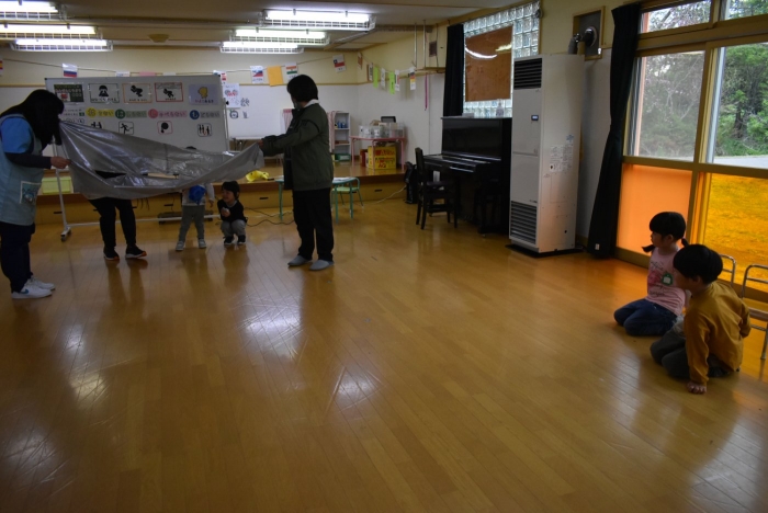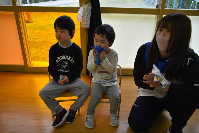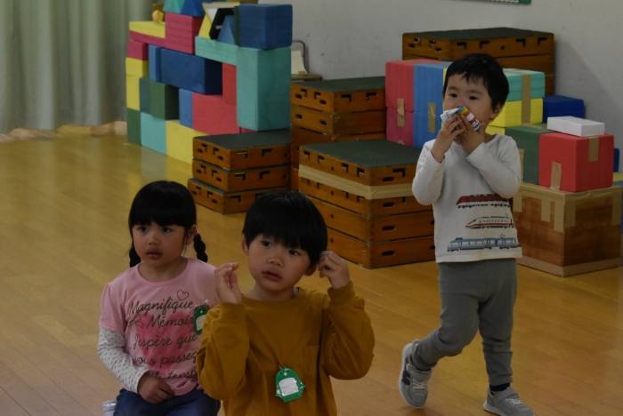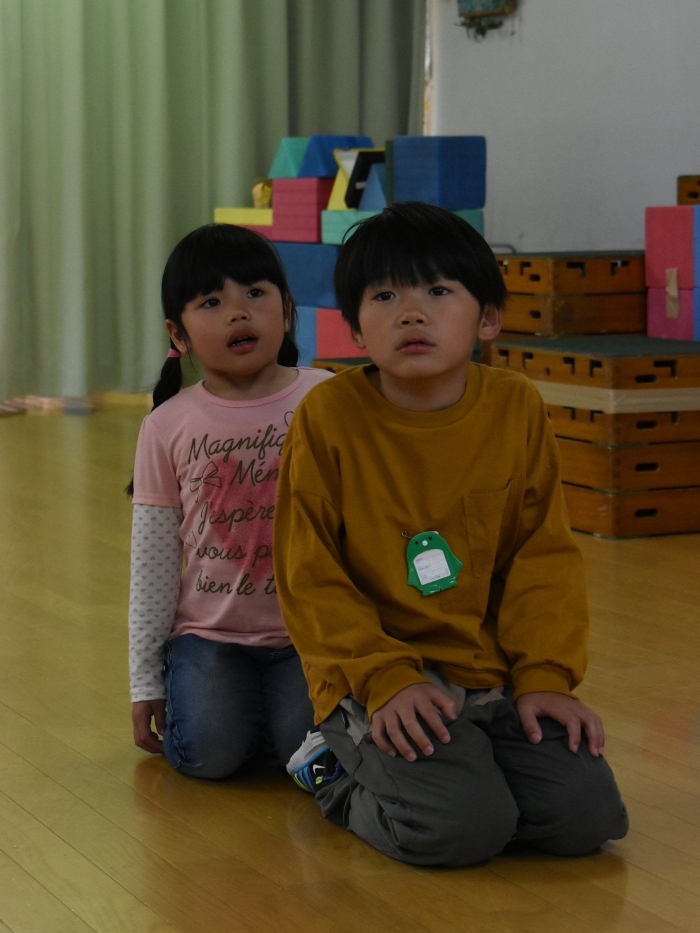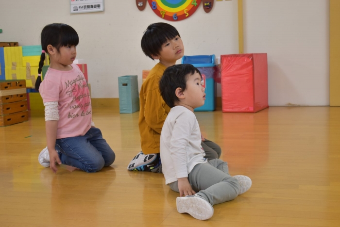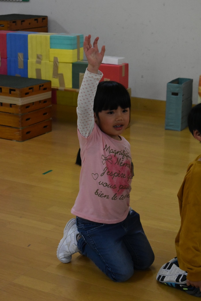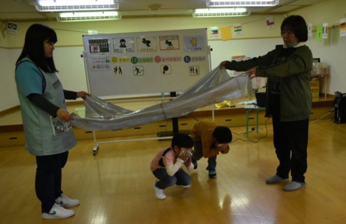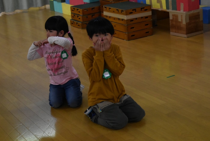 火災の時に怖いのが煙です。煙を吸わないようにするための安全行動について,年長組に手本を見せてもらい一人ずつ実施練習。ヒヨコ歩きを忠実に行っていた子ども達です。