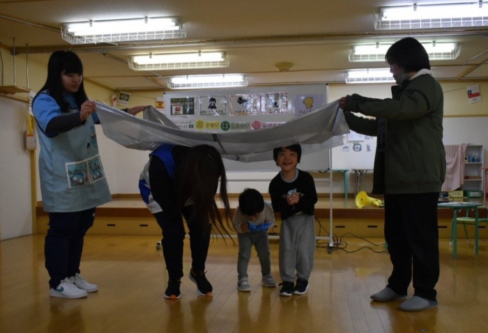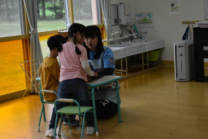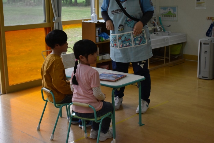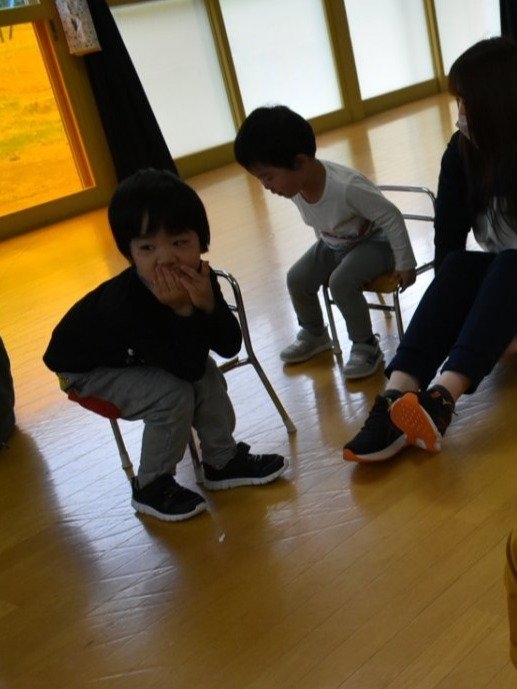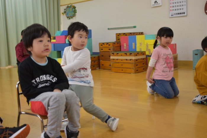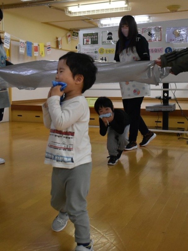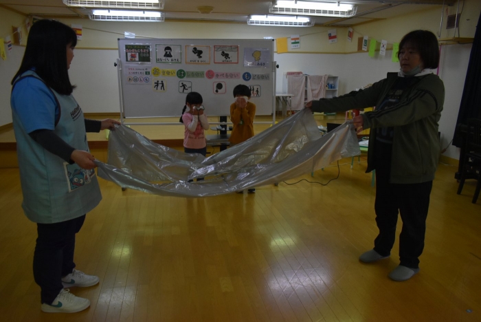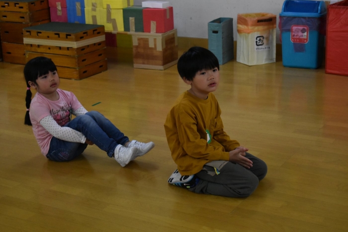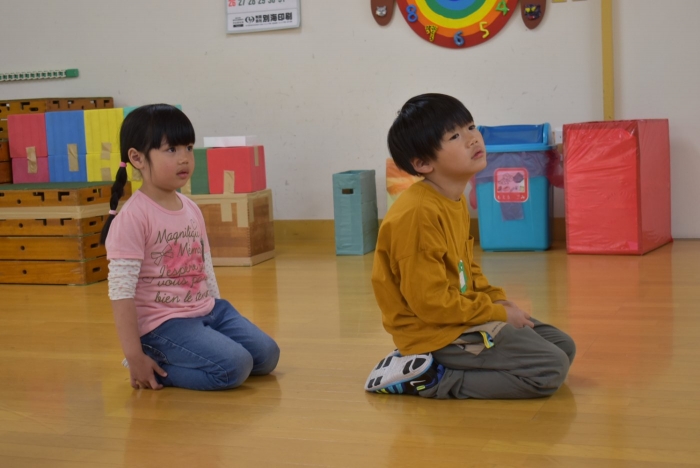 火災の時に怖いのが煙です。煙を吸わないようにするための安全行動について,年長組に手本を見せてもらい一人ずつ実施練習。ヒヨコ歩きを忠実に行っていた子ども達です。
