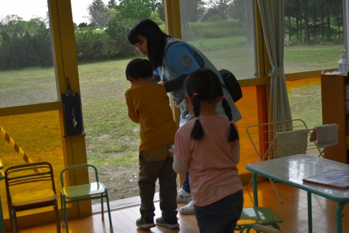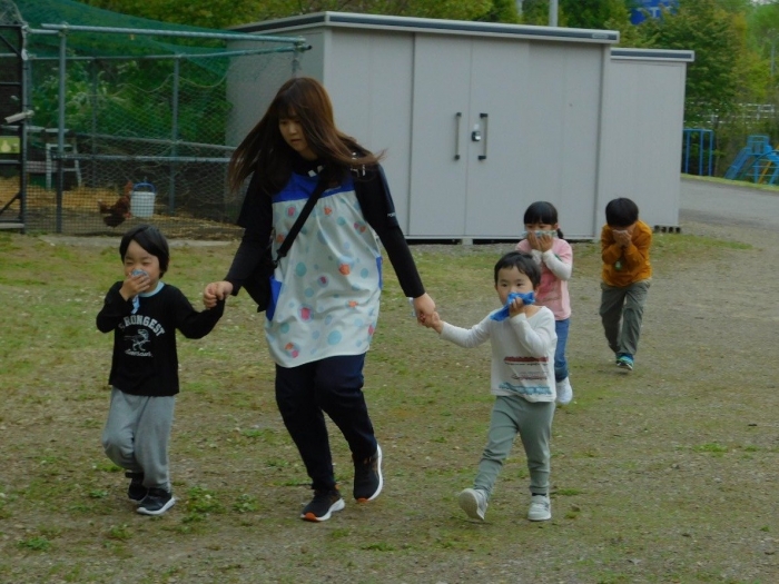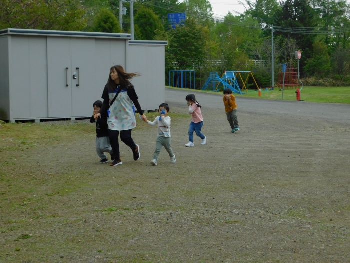 今回は,クラス時間に職員室から火災が起きる想定での避難訓練。非常ベルの音にも慌てずに,事前指導でのことをしっかりと活かしながら避難していた年長児。先生と一緒に手をつなぎ,頑張って速足で避難していた年少児。もしもの時に備え,今年度も定期的に,安全行動訓練や避難訓練を行っていきたいと思います。