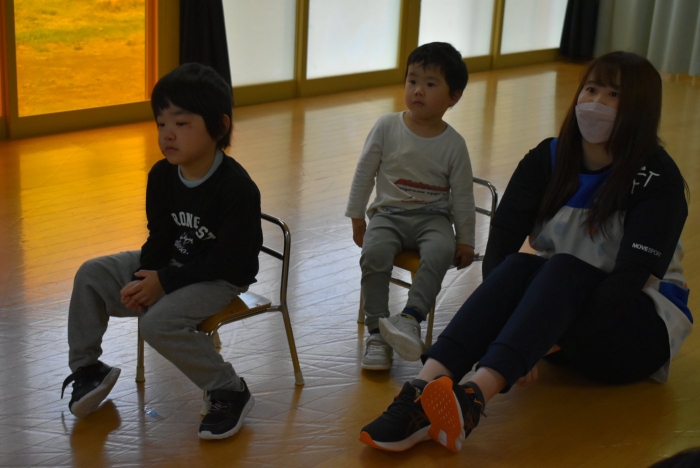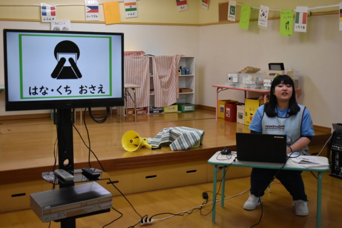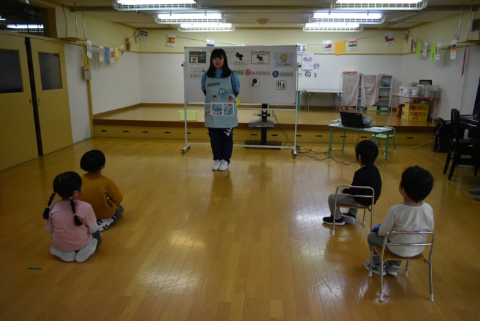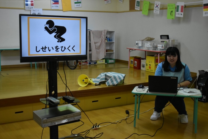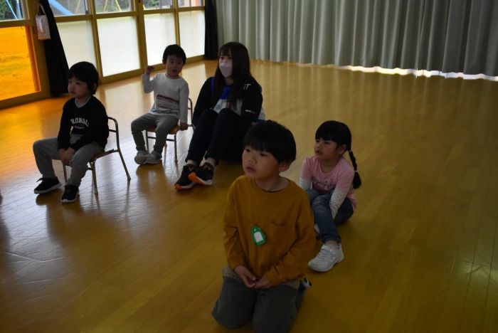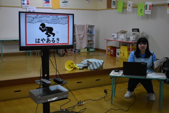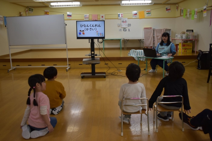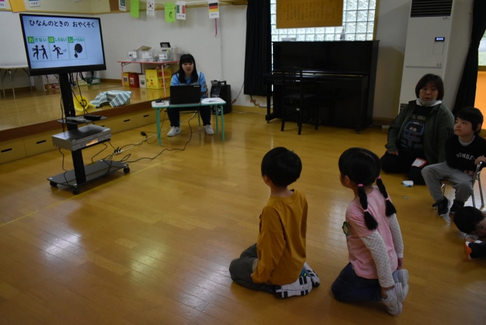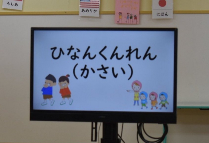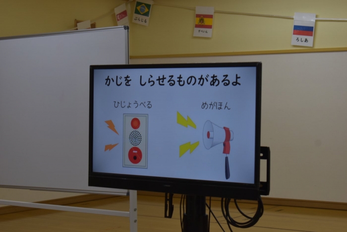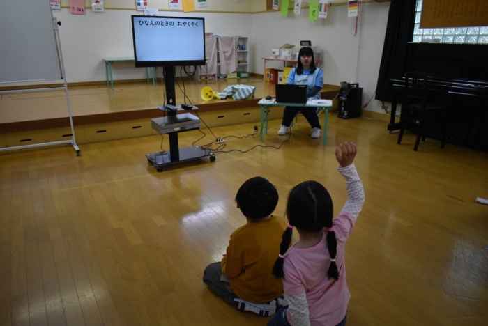 避難訓練に関わる問い掛けに対し,年長児は自信をもって挙手をし答える姿があり,これまでの経験が知識に結びついていることを感じました。年長児は,初めて目にしたパワーポイント画像に興味津々! 火災の映像を目にすると「助けて―!!」と声を上げたり,画像の安全行動をを真似たりする姿がありました。
