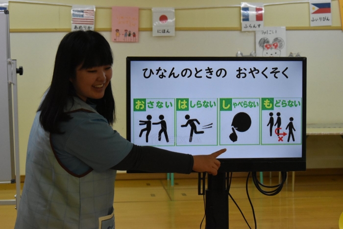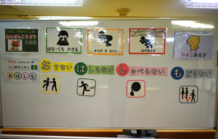 昨日は,第1回『避難訓練(火災想定)』を実施しました。事前指導では,パワーポイント画像を使い,火災時の安全行動(通称『ヒヨコ歩き』),避難行動『「おはしも」の約束』を確認し合いました。