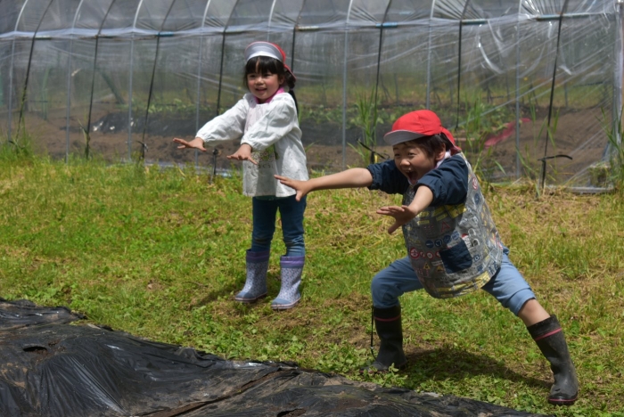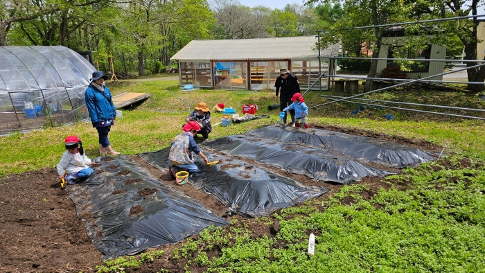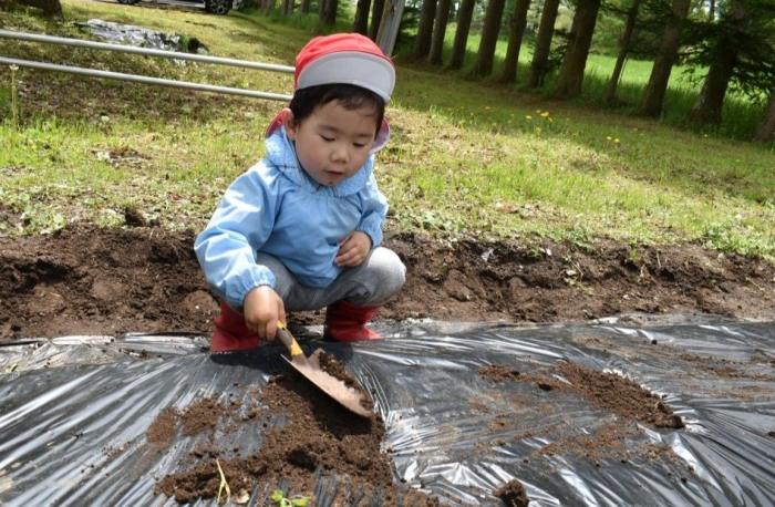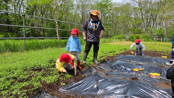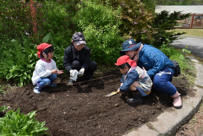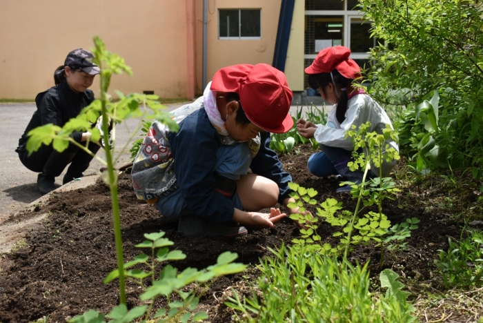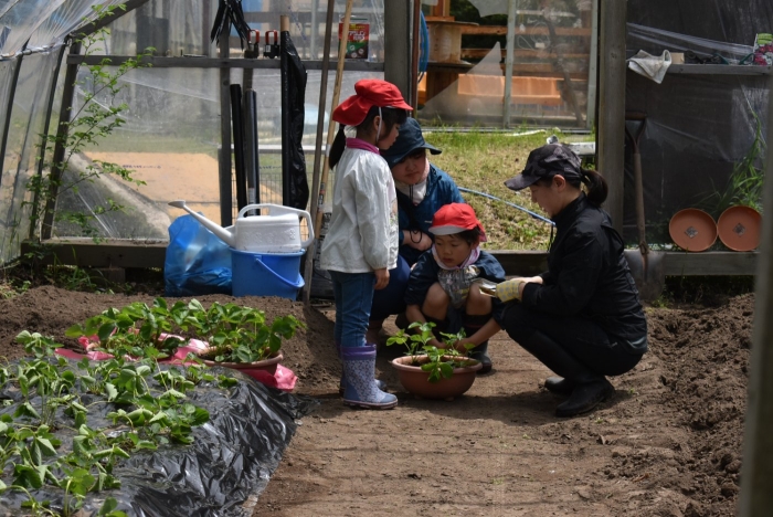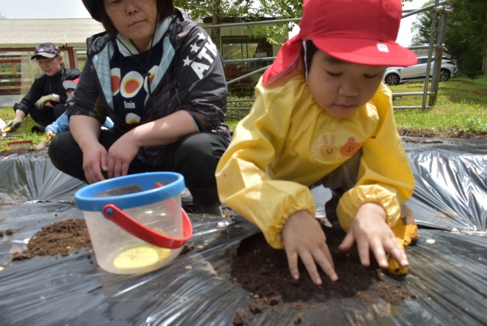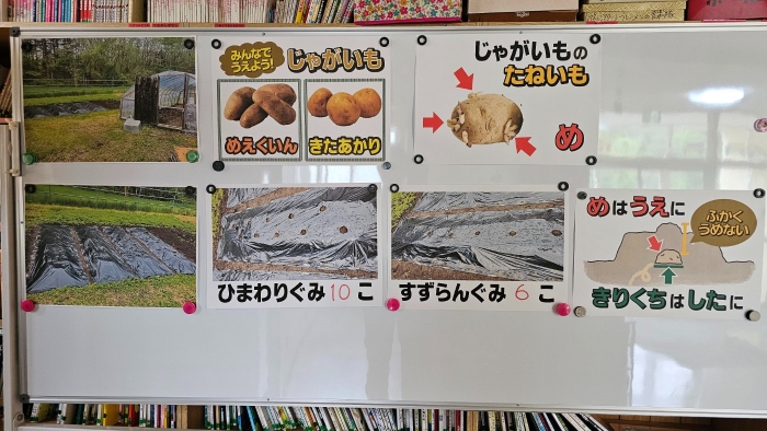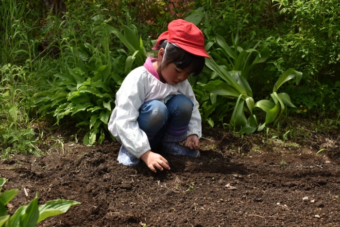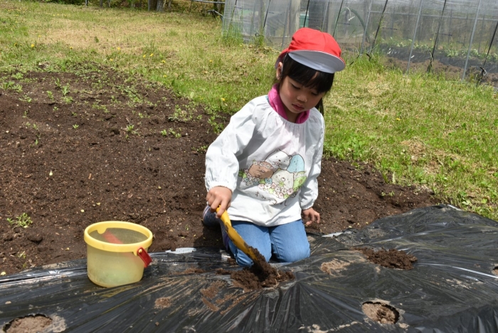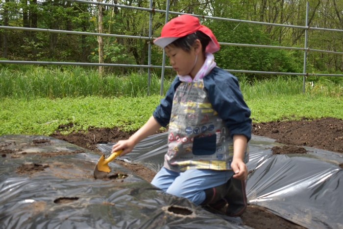 全園児でジャガイモ植え! 年長組伝統のヒマワリ植え,イチゴも育てます