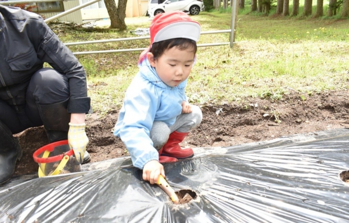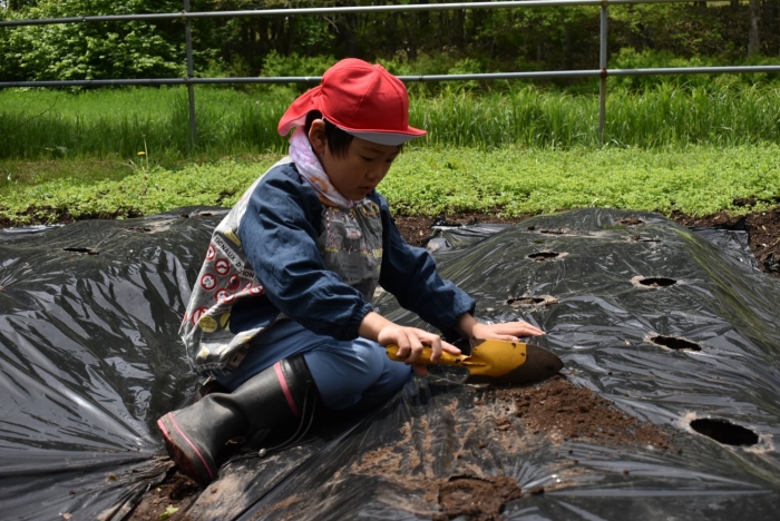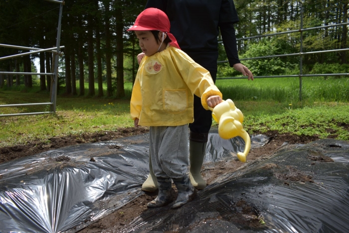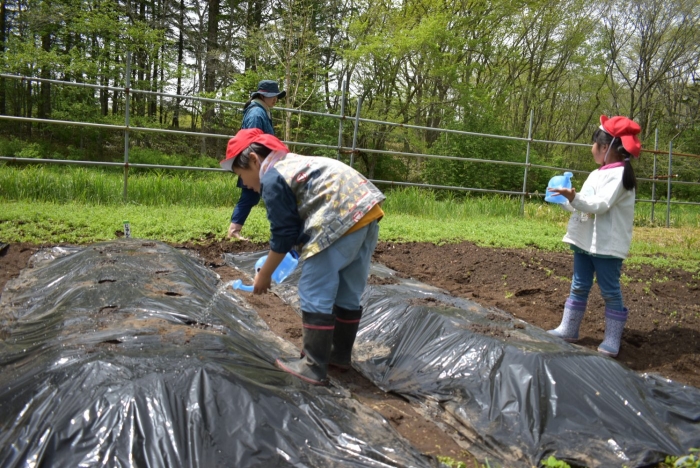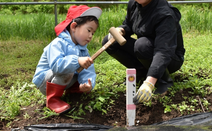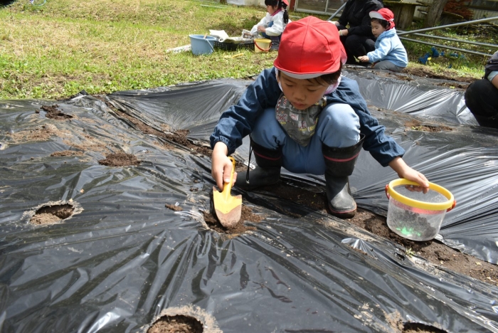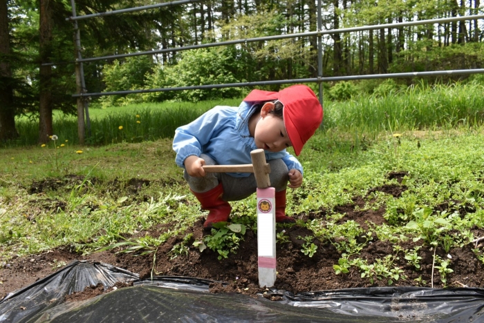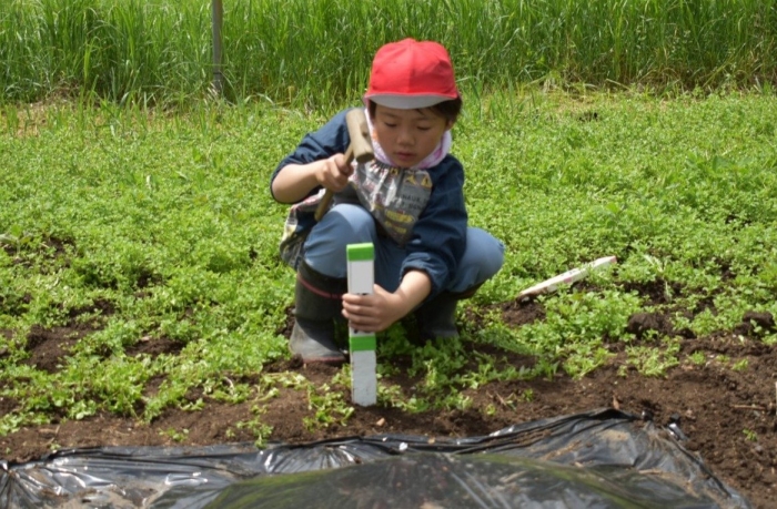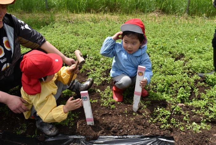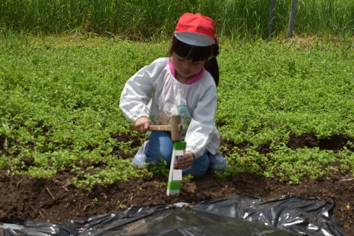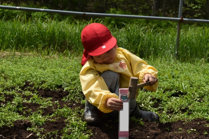 今年植えたのは,年長組のリクエストによる『メークイン』と,『キタアカリ』の2種類! 経験者の年長児に手本を見せてもらった後,年少児は6個,年長児は10個の種イモを植付けました。 家で体験したことがあるのか,年少児もなかなかの手際で植えていたのには驚きました。植付後,自分の名札プレートを木槌で打ち付けるのにも挑戦! とても楽しかったようで,打ち付けては引っこ抜きをエンドレスでしている姿,自分がビショ濡れになりながらも種イモにた~っぷりと水を注いでいる姿が何とも微笑ましかったです。