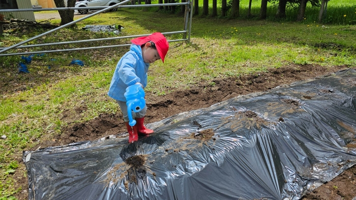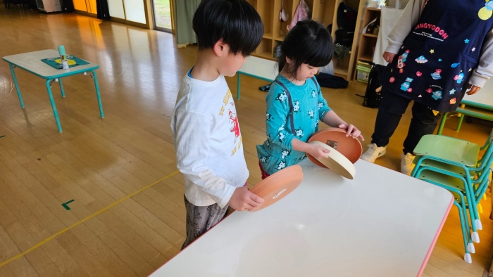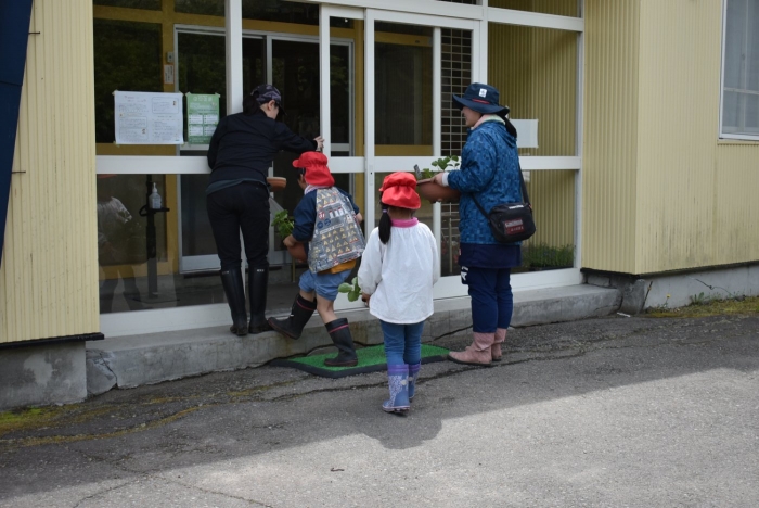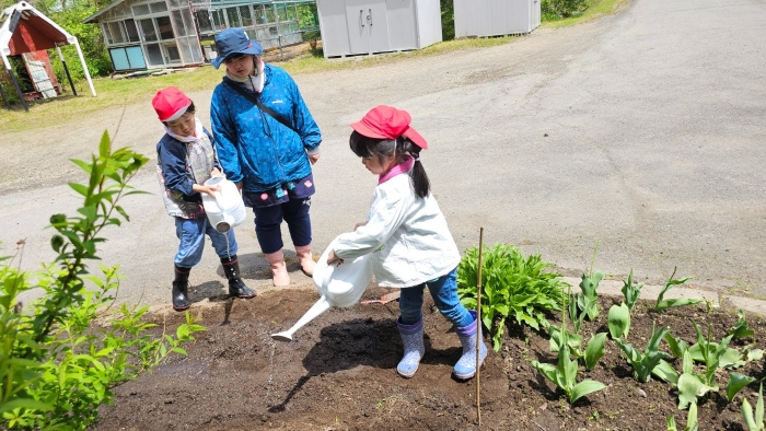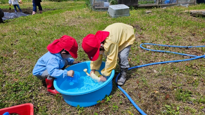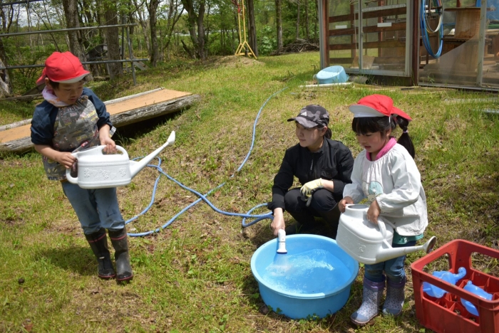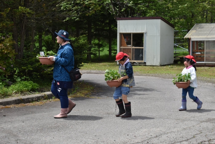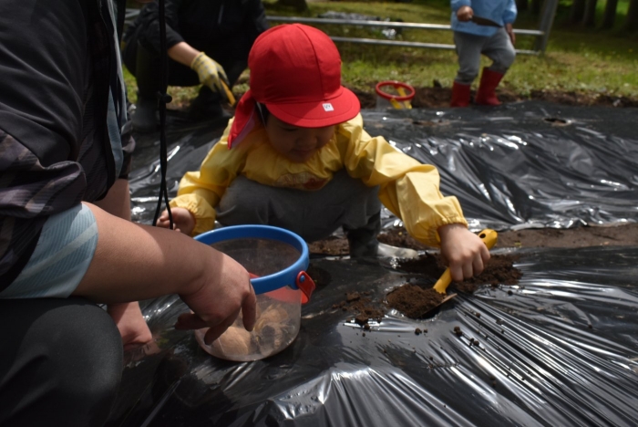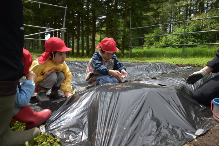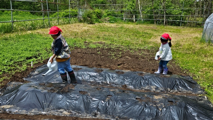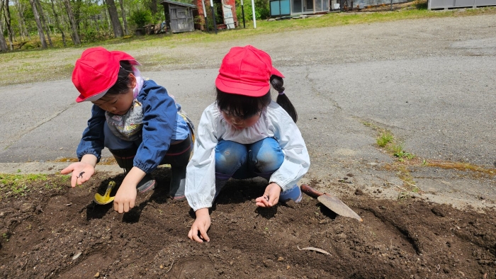 今年植えたのは,年長組のリクエストによる『メークイン』と,『キタアカリ』の2種類! 経験者の年長児に手本を見せてもらった後,年少児は6個,年長児は10個の種イモを植付けました。 家で体験したことがあるのか,年少児もなかなかの手際で植えていたのには驚きました。植付後,自分の名札プレートを木槌で打ち付けるのにも挑戦! とても楽しかったようで,打ち付けては引っこ抜きをエンドレスでしている姿,自分がビショ濡れになりながらも種イモにた~っぷりと水を注いでいる姿が何とも微笑ましかったです。