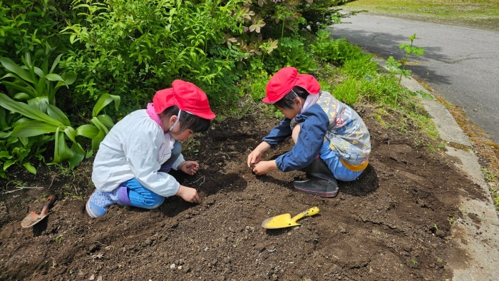 進級当初から「ヒマワリは,いつ植えるの?」と聞いていた年長児。『年長ひまわり組になったらヒマワリを植える』ことが,子ども達の中で伝統として根付いていることを感じました。ジャガイモ植えに引き続き,楽しみにしていたヒマワリ植えを行いました。今年は『大輪』ヒマワリと『バレンタイン』ヒマワリの2種類の種をロータリー花壇へ! 疲れも暑さもピークで,種がドバっと撒かさることもありましたが,間隔に気を付けながら丁寧に植えていた年長児です。大輪の花が咲くのを楽しみにしています。