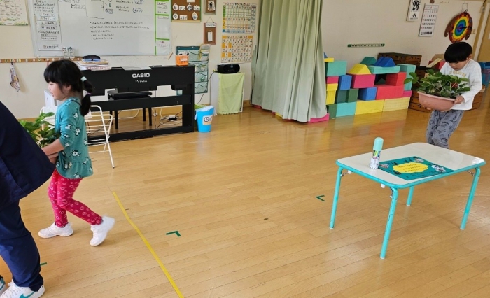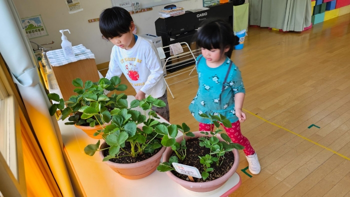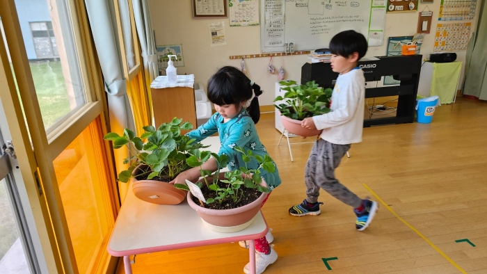 そして,昨年はハウス栽培をしていたイチゴ。嬉しいことに,どんどん株が増えてきたため,年長組で一人一鉢ずつ育てることにしました。教室の中で日当たりのいい窓辺に,イチゴの置場を設置。真っ赤なイチゴの実りを目指し,日々の観察・お世話を頑張ります!