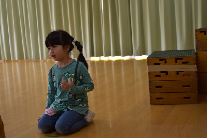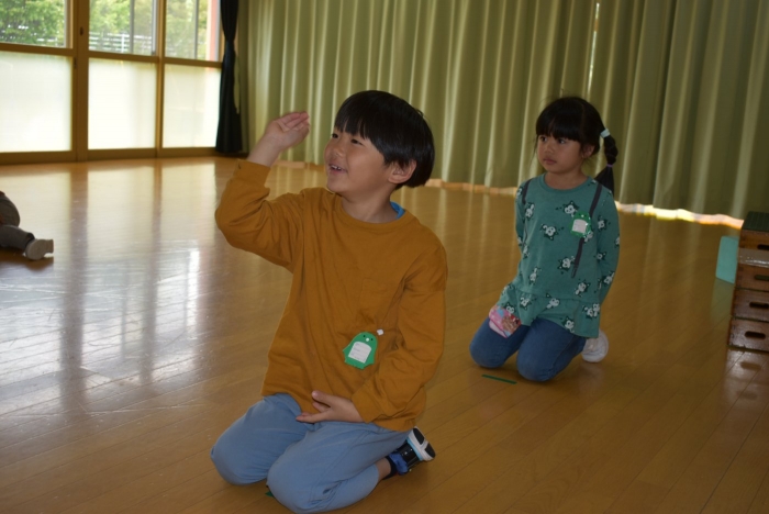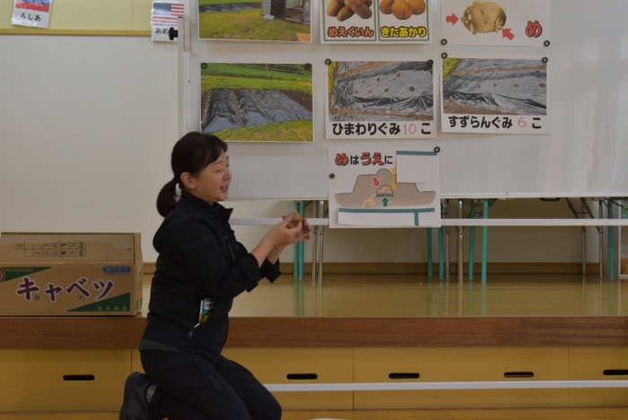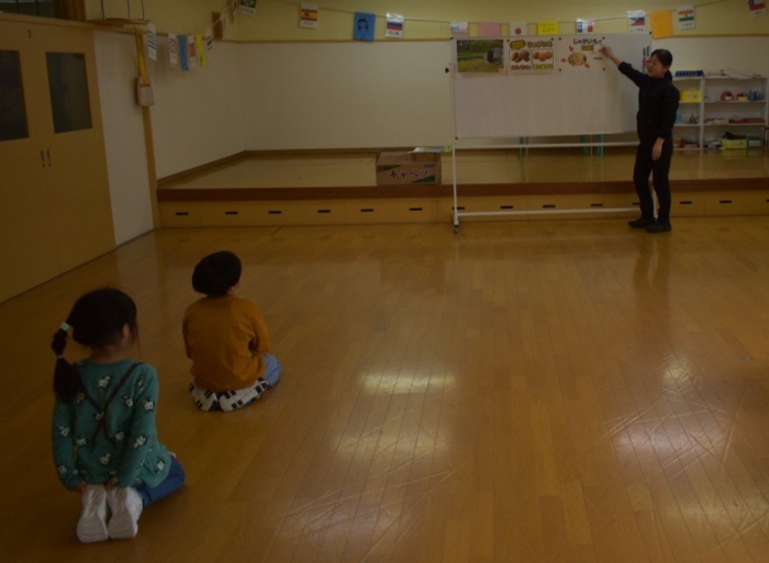 今日は,全園児でジャガイモ植えを行いました。戸外に行く前に,遊戯室に集合! 植付前に栽培への興味・関心を高めようと,ジャガイモに関する話をしました。昨年・一昨年のジャガイモ植えのことを覚えているか,年長組にはクイズを出題しましたが,見事な記憶力でした☆彡