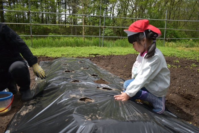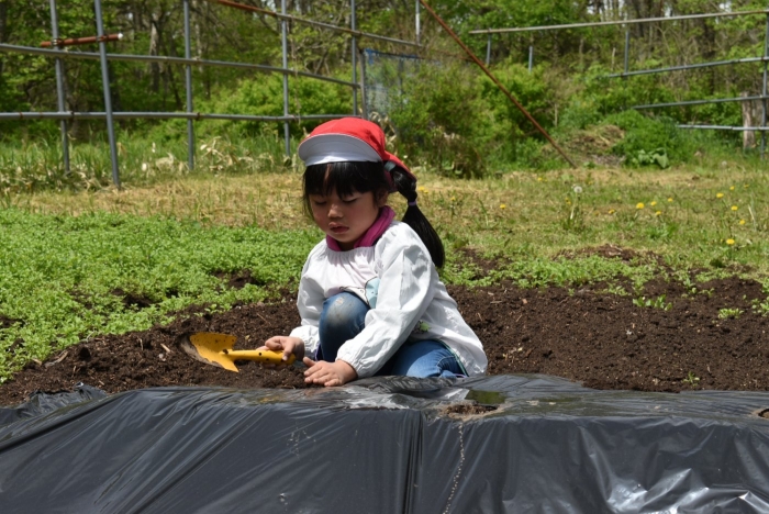 年長組は,種イモを自分で選び,切り口に草木灰を付ける作業から行いました。尚且つ,今までで一番多い数の種イモを植付けましたが,大変だけど頑張る!難しいことにも挑戦!! そんな意欲的な姿で最後まで自分の力で取り組んでいました。植え終わった後には何ともいえない達成感が☆彡 豊作への願いを込め,畑全面に全力パワーも注ぎ込みました。 ジャガイモの他,食べたい育てたいと言っていた野菜を10種類植える予定の年長組。栽培体験でも,様々な感情体験・感動体験を味わっていければと思います。