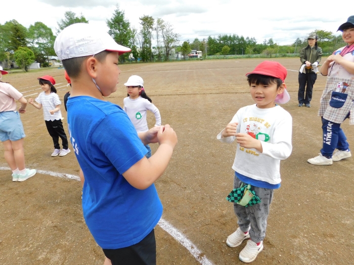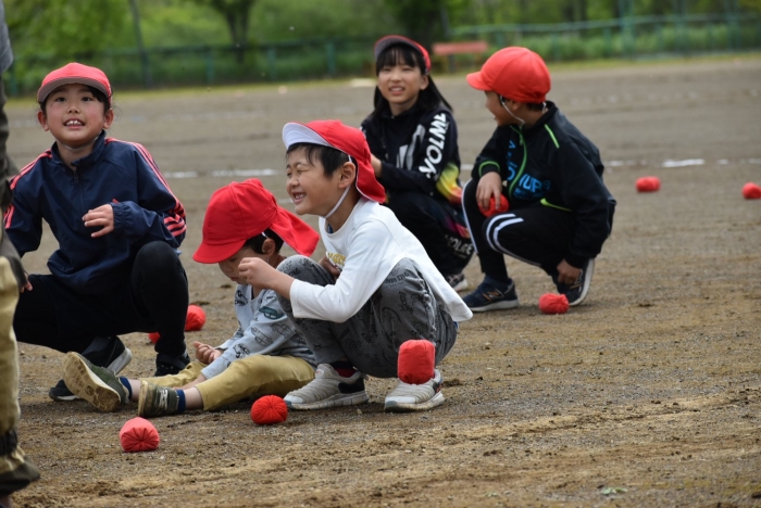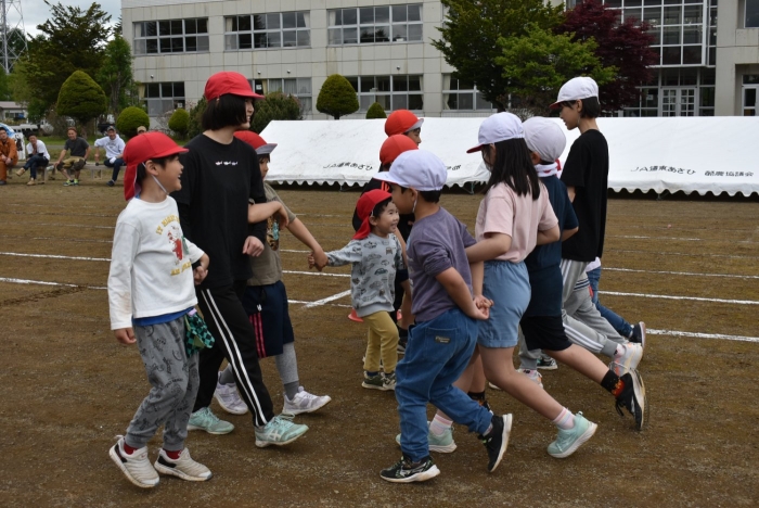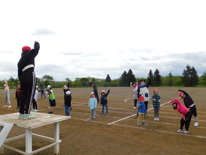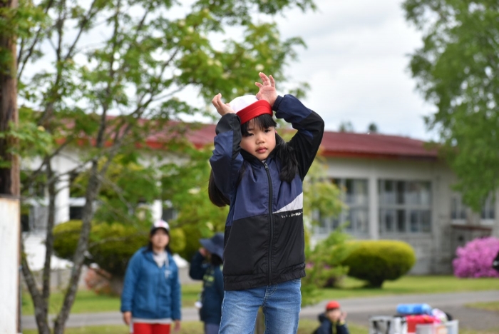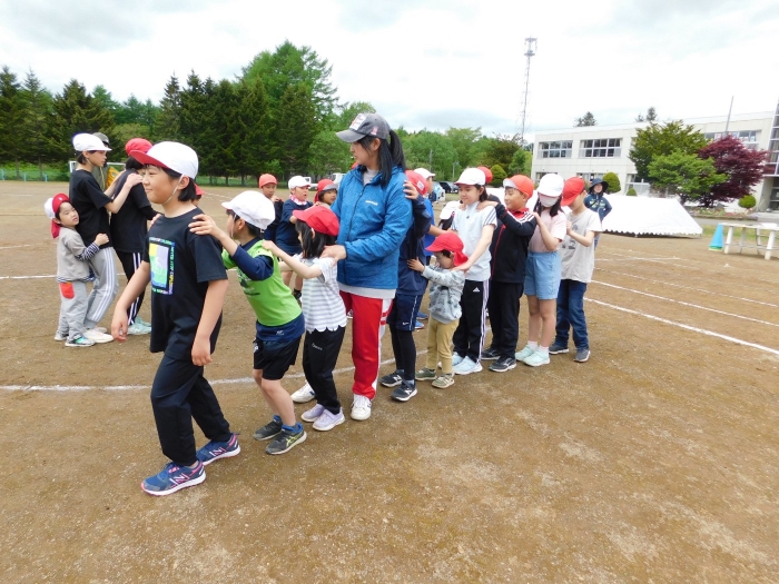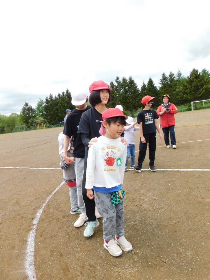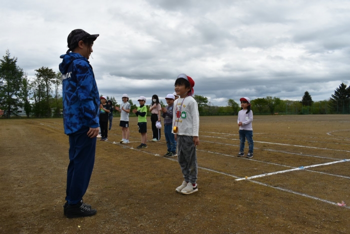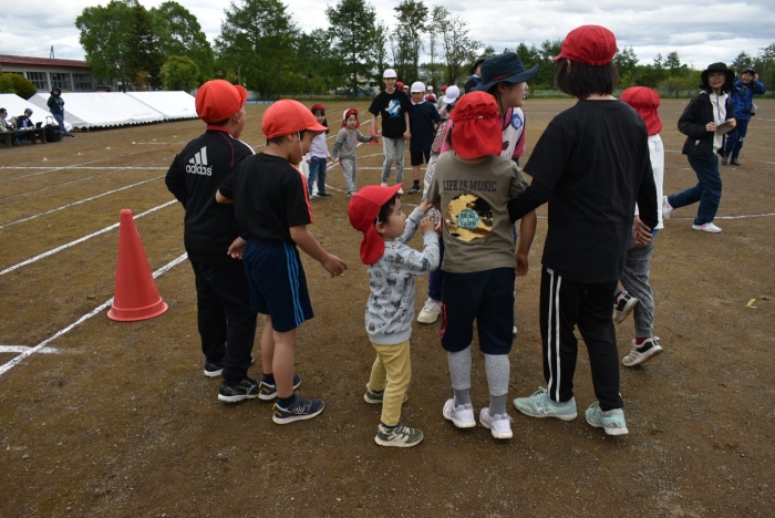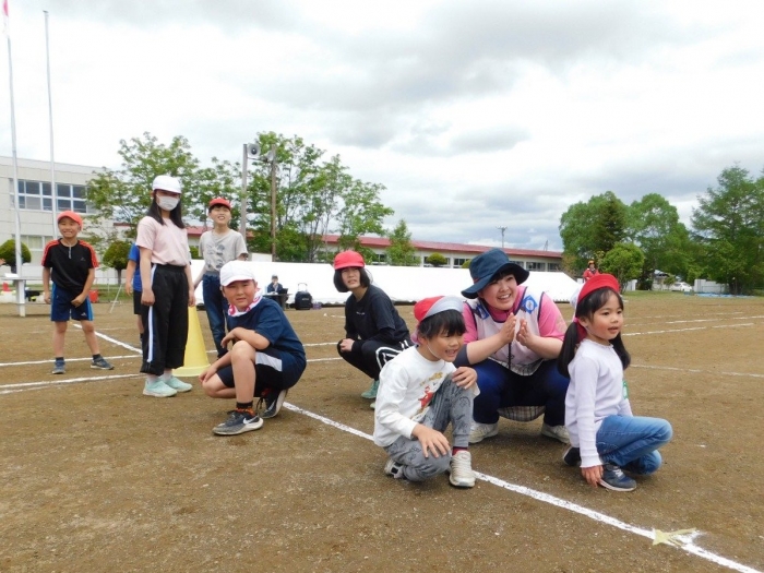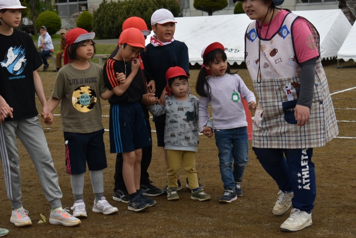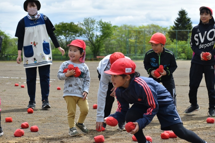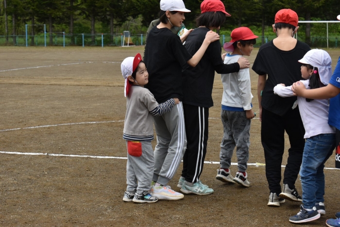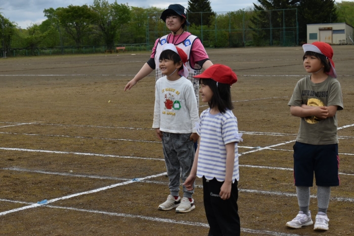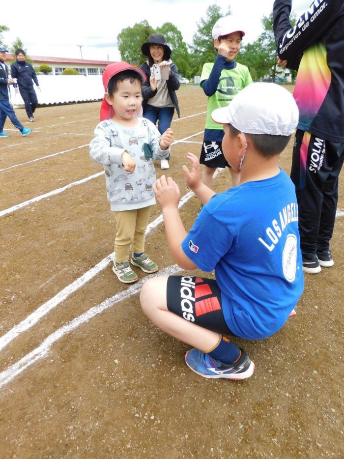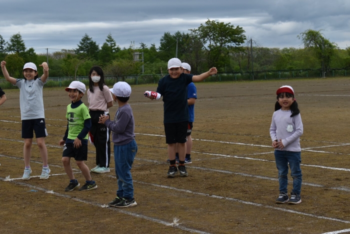 全体練習では,小学生の司会・進行の下,開・閉会式,ラジオ体操,ディズニー体操,かけっこ,フォークダンス,小学生企画3種目,紅白対抗リレーの10種目を実施! 通しでの練習は初めてでしたが,年長組は,年少児を気に掛けながら集合・退場をしたり,小学生とともに最後まで全力で取り組む姿がありました。緊張しながらも,代表としての意識・自覚をもって前に立つ姿も立派でした。年少児にとっては,ハードルの高い全体練習でしたが,集中が途切れても曲がかかると覚醒!?(笑),年長児や小学生に愛しまれながら競技を楽しんでいました。小学生との継続的な交流で,ほのぼの場面がたくさんみられている運動会練習です。