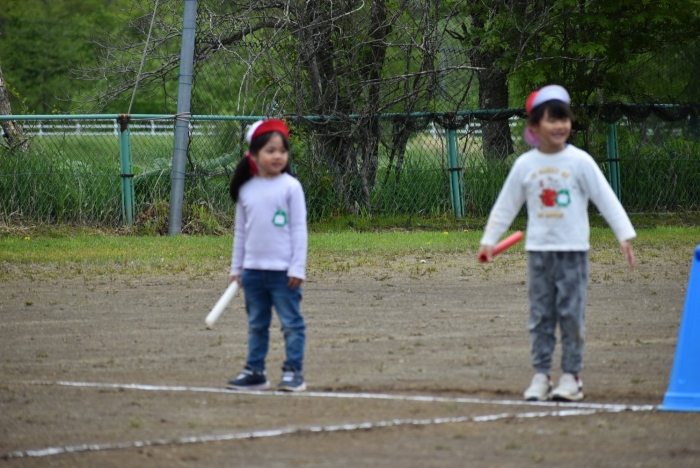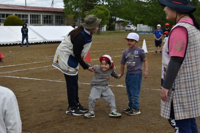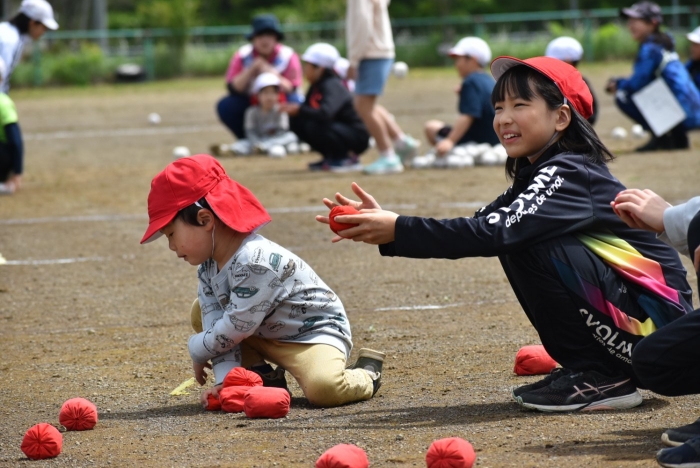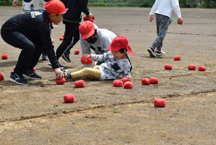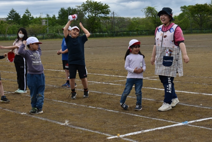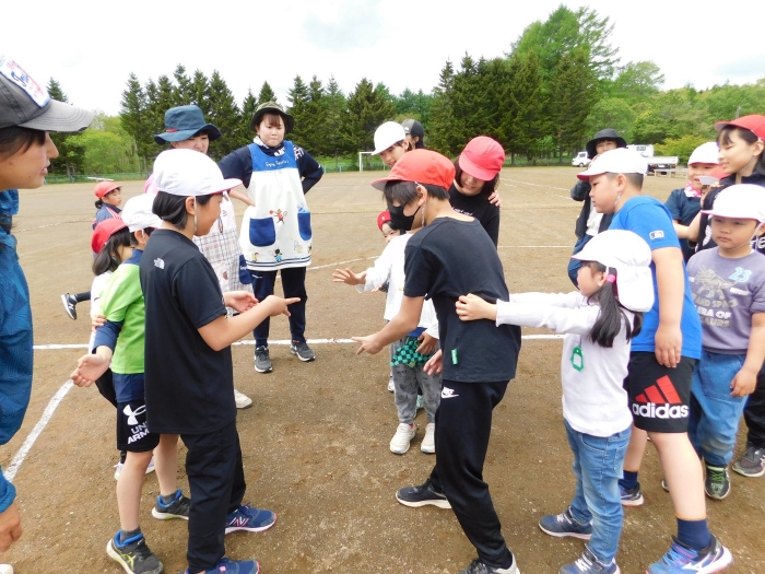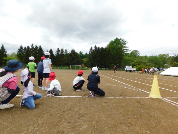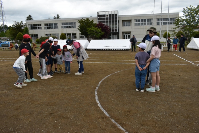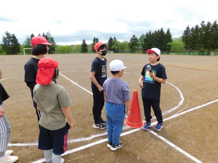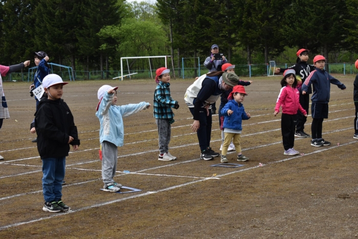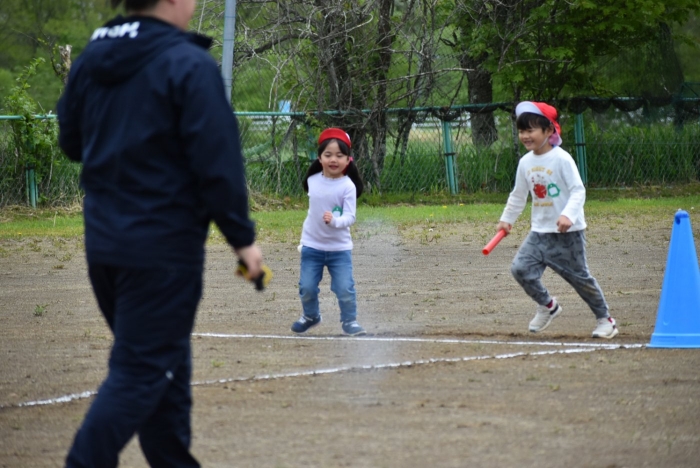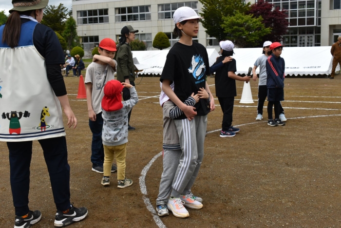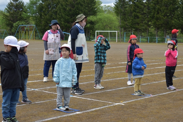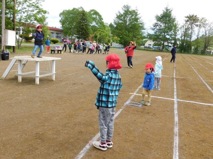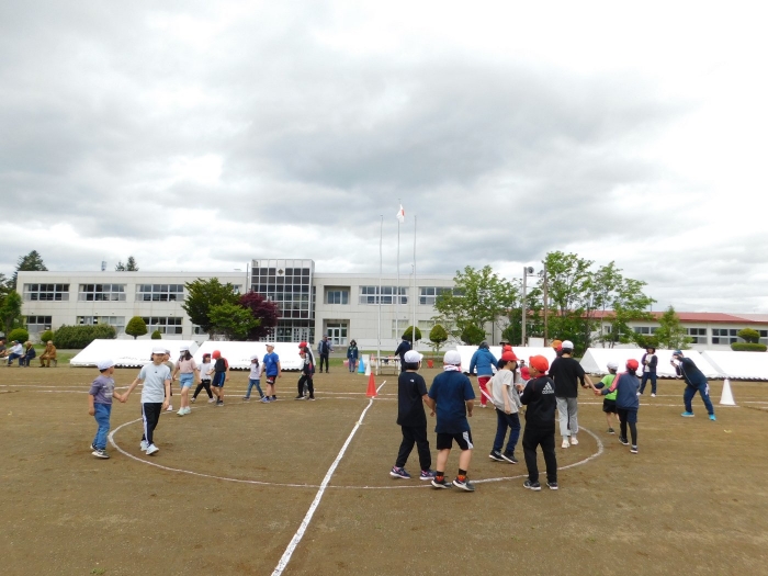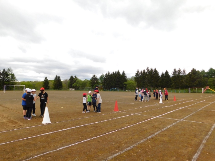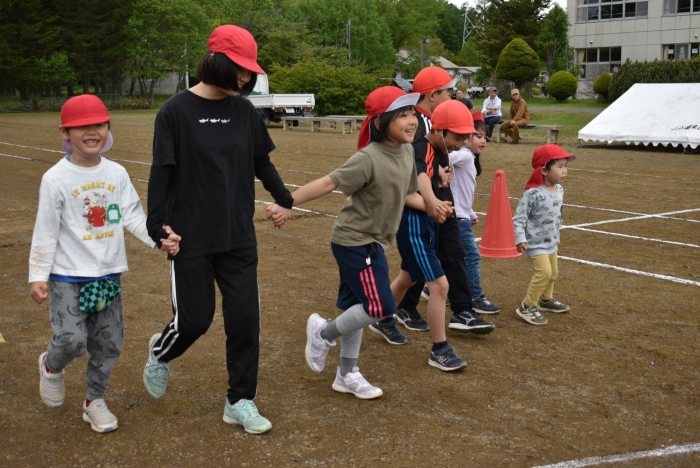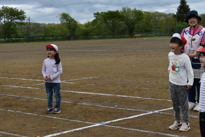 全体練習では,小学生の司会・進行の下,開・閉会式,ラジオ体操,ディズニー体操,かけっこ,フォークダンス,小学生企画3種目,紅白対抗リレーの10種目を実施! 通しでの練習は初めてでしたが,年長組は,年少児を気に掛けながら集合・退場をしたり,小学生とともに最後まで全力で取り組む姿がありました。緊張しながらも,代表としての意識・自覚をもって前に立つ姿も立派でした。年少児にとっては,ハードルの高い全体練習でしたが,集中が途切れても曲がかかると覚醒!?(笑),年長児や小学生に愛しまれながら競技を楽しんでいました。小学生との継続的な交流で,ほのぼの場面がたくさんみられている運動会練習です。