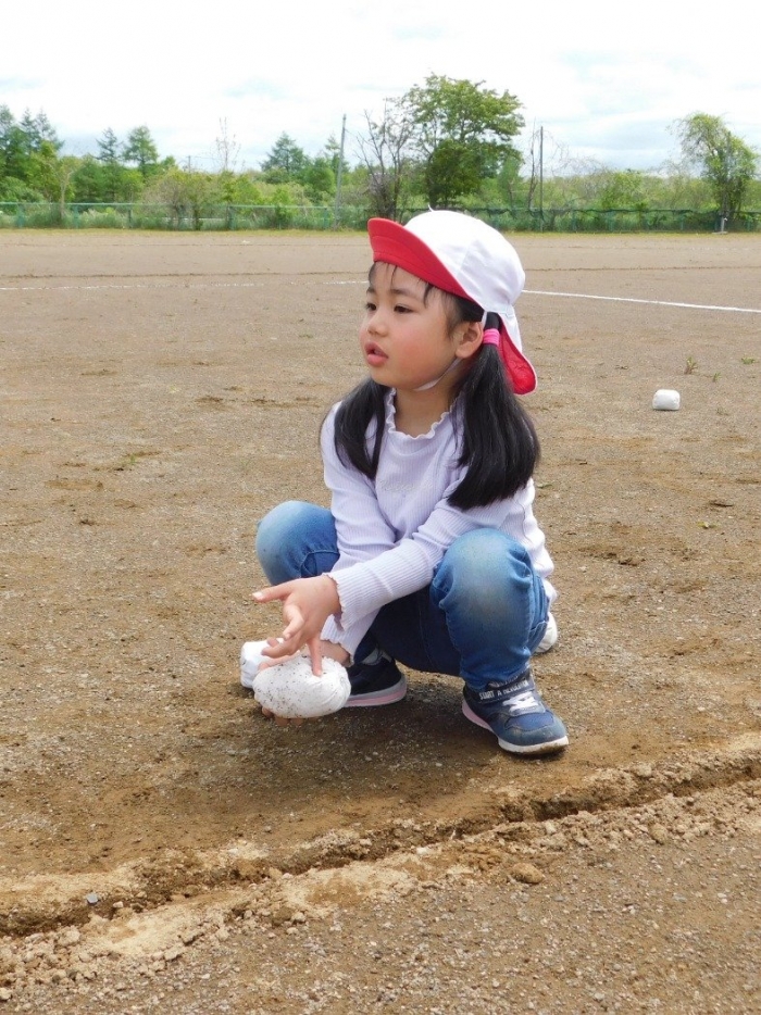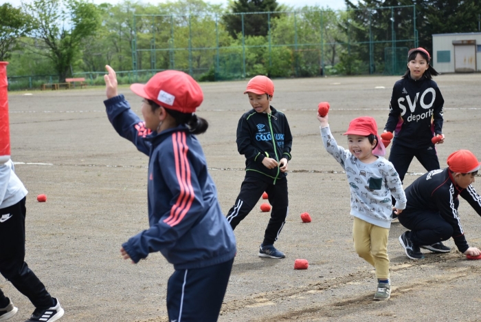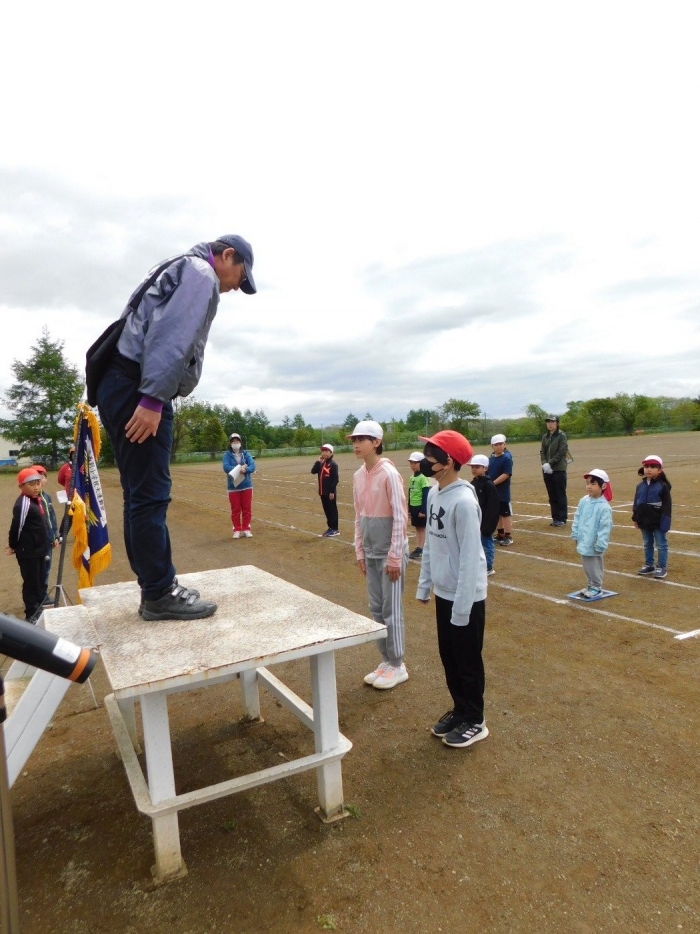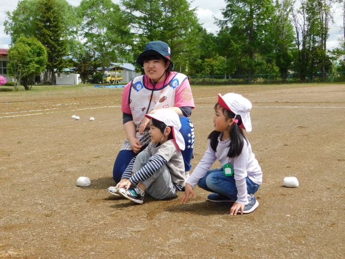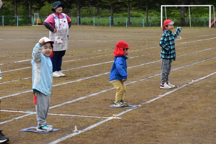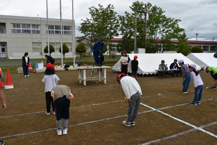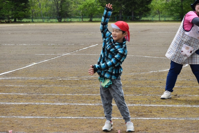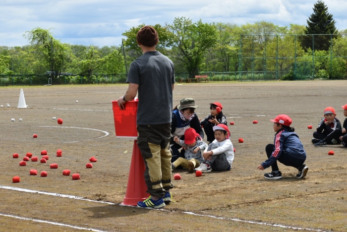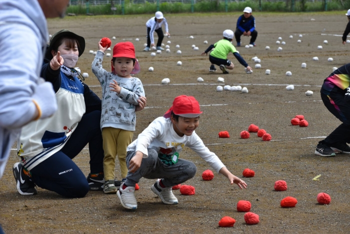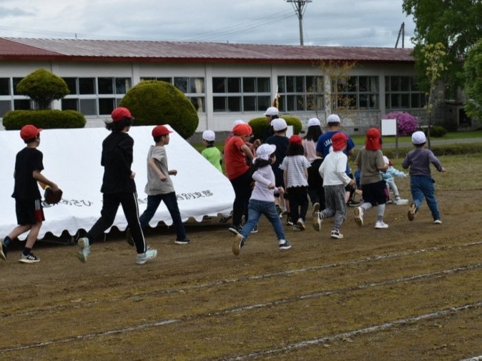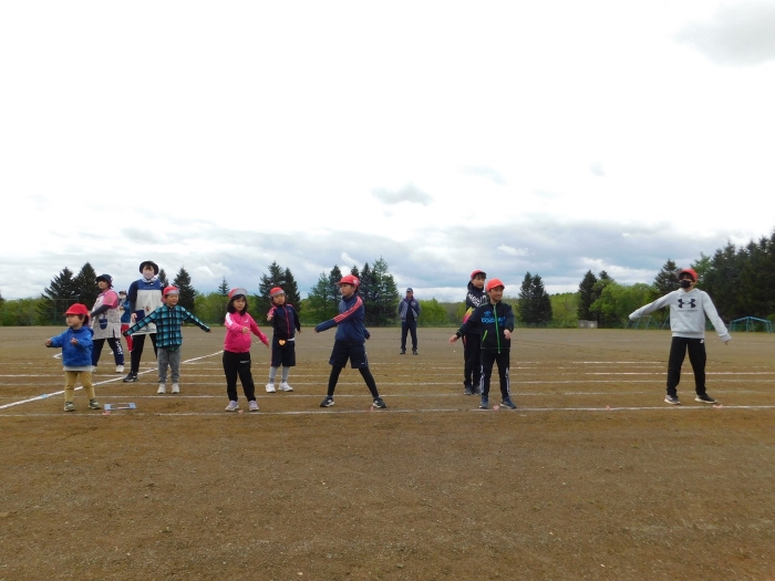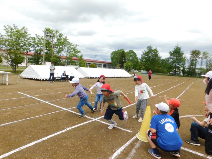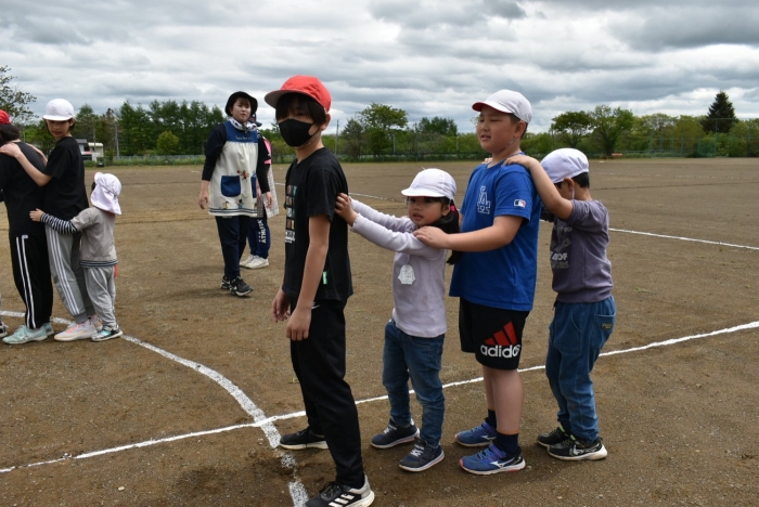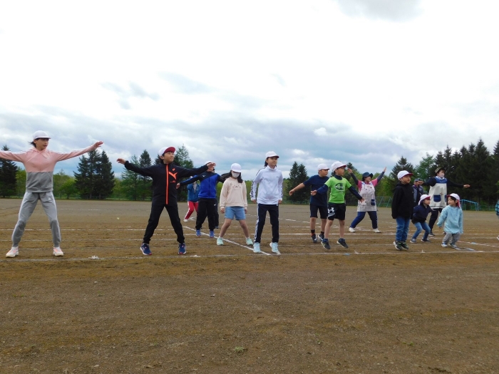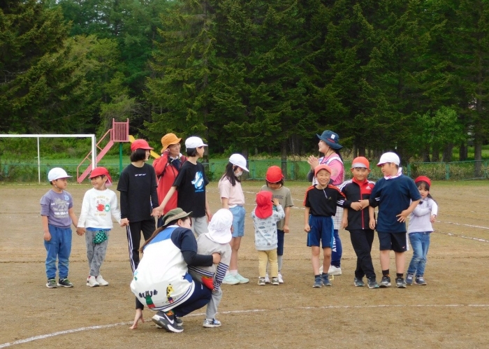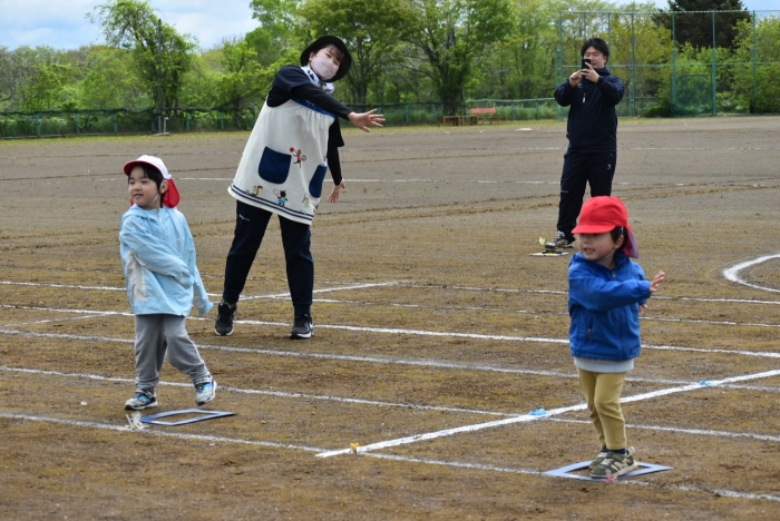 全体練習では,小学生の司会・進行の下,開・閉会式,ラジオ体操,ディズニー体操,かけっこ,フォークダンス,小学生企画3種目,紅白対抗リレーの10種目を実施! 通しでの練習は初めてでしたが,年長組は,年少児を気に掛けながら集合・退場をしたり,小学生とともに最後まで全力で取り組む姿がありました。緊張しながらも,代表としての意識・自覚をもって前に立つ姿も立派でした。年少児にとっては,ハードルの高い全体練習でしたが,集中が途切れても曲がかかると覚醒!?(笑),年長児や小学生に愛しまれながら競技を楽しんでいました。小学生との継続的な交流で,ほのぼの場面がたくさんみられている運動会練習です。
