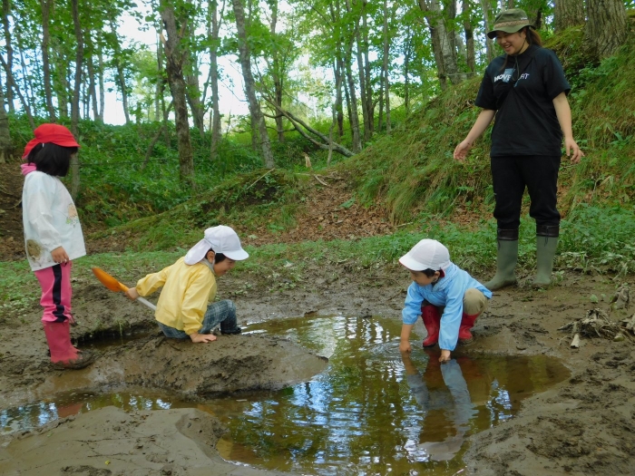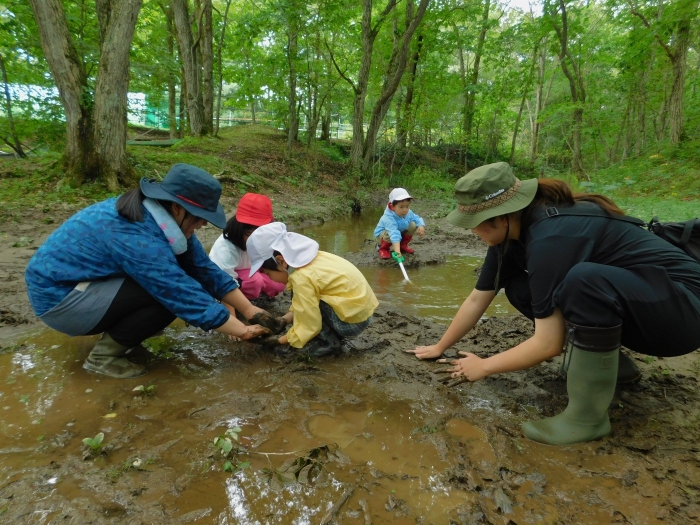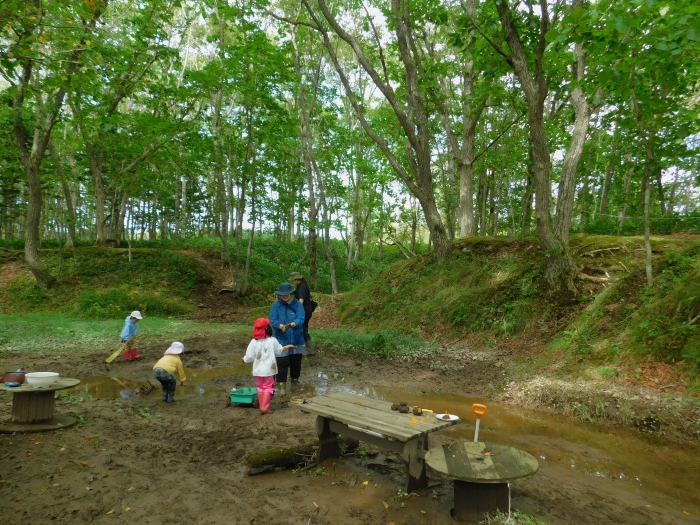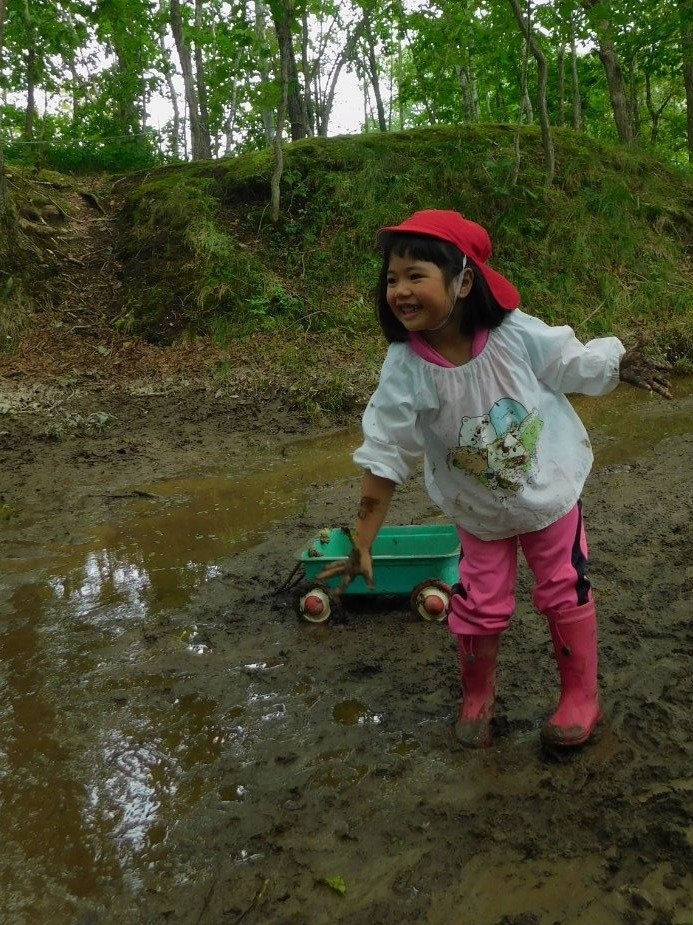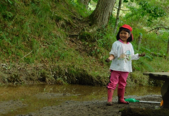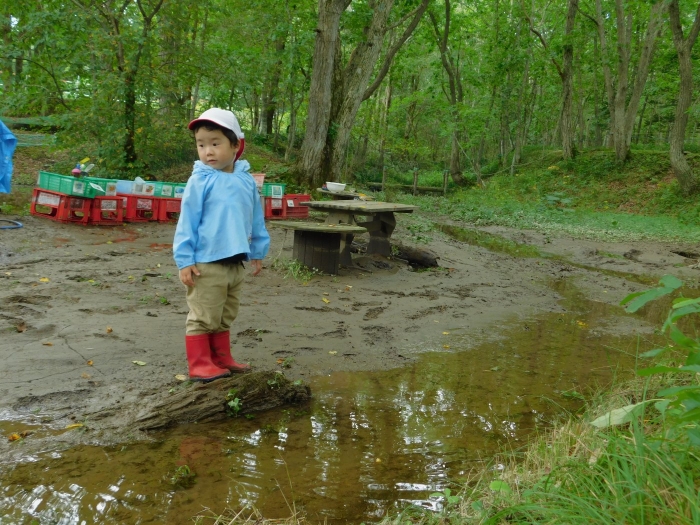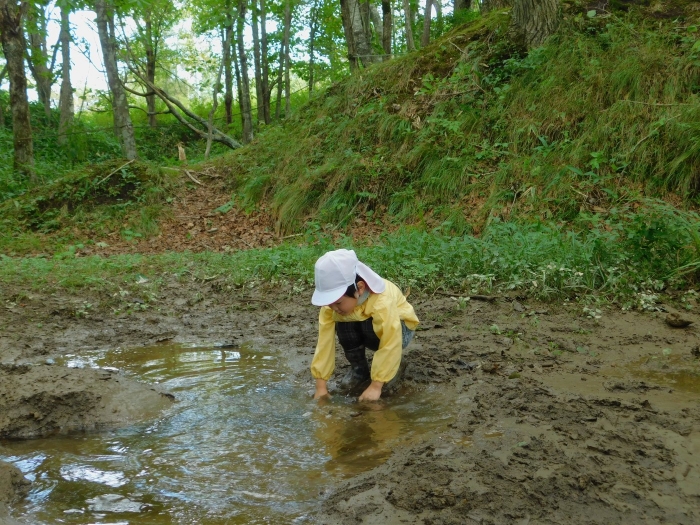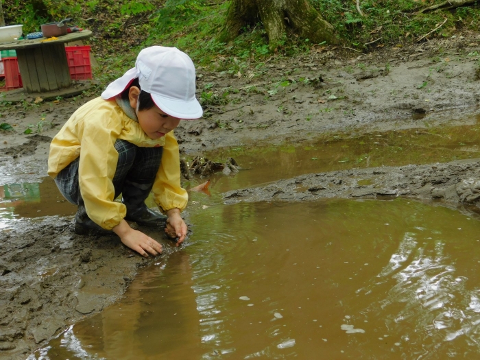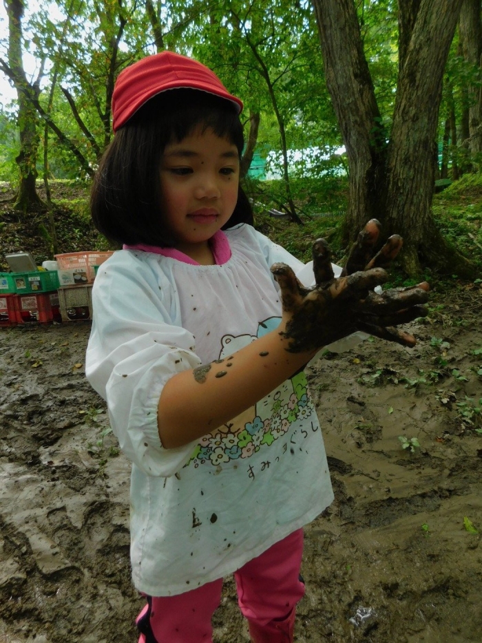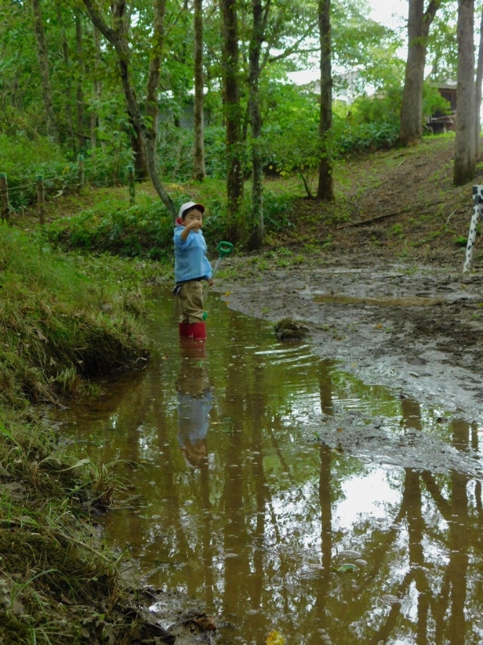 8月の最終日は,台風の影響でもの凄い暴風雨でしたね。畑の野菜や花壇の花が倒れたり,水浸しで腐ったりもしましたが,わくわくジャングルには恵みの雨に! 久し振りに川が出現し,子ども達の目はキラキラ☆彡心はウキウキです♪ 川の中を歩いたり,魚が居ないか探したり,泥の心地よさを味わいながら泥パックや泥合戦!?を楽しんでいました。まさに,自然は遊びの宝庫です。