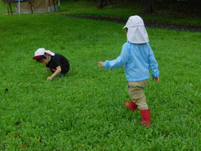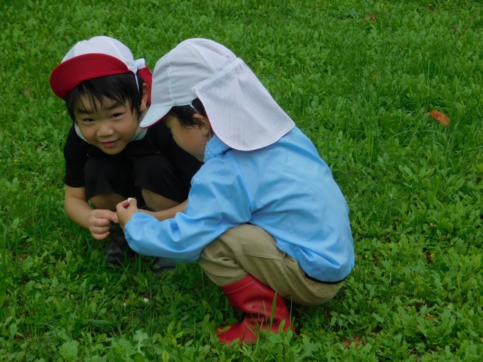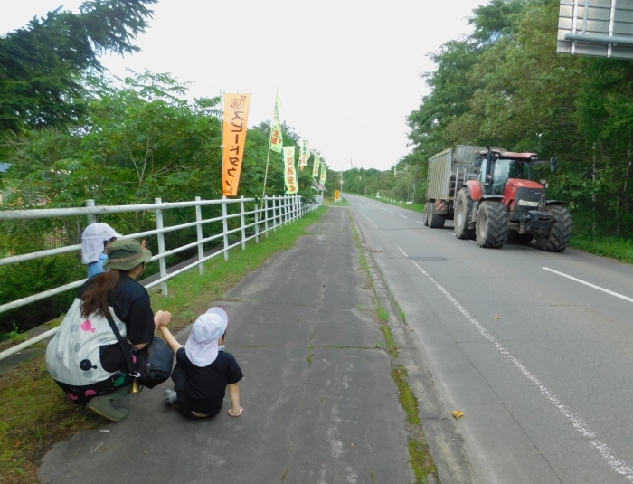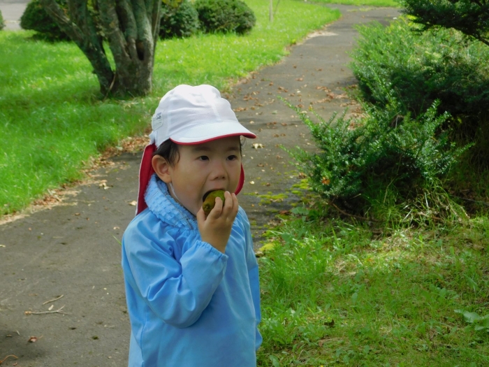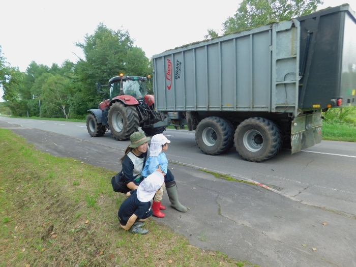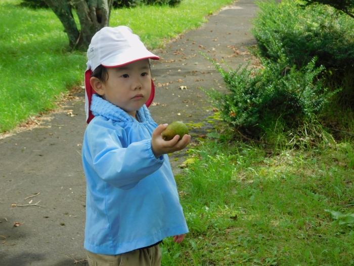 梨やクルミ,サクラの実,バッタなど,様々なモノ・コトとの出会いを楽しみ,触ったり味わったり,日頃から五感をフル回転しながら遊んでいる力が発揮されたようです。6月のピクニックの時に,公園のハスカップを食べたことを思い起こして探しに行ったり,以前は大きな揺れを怖がっていたブランコにスイスイ乗れるようになったりと,体験してきたことが経験として結び付いていることを感じさせる場面も…。一番大興奮だったのは道路を行き交うトラクター!?(笑) 年少児たちの小さな大冒険でした。