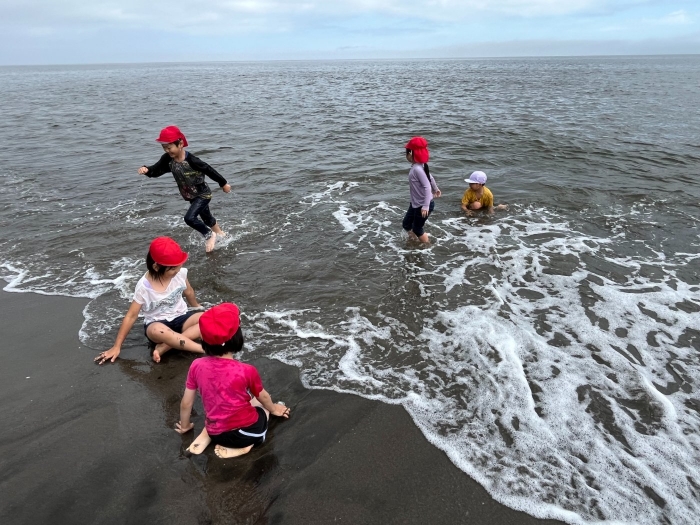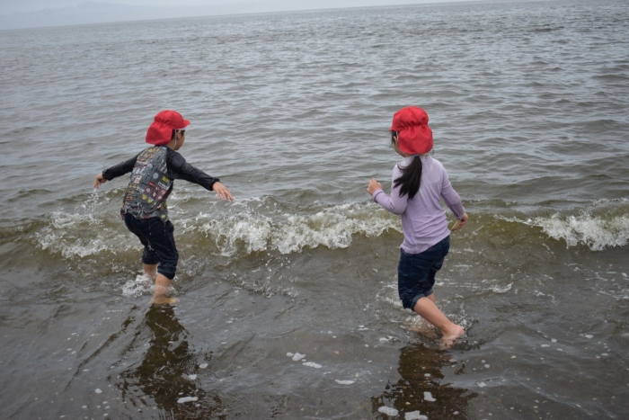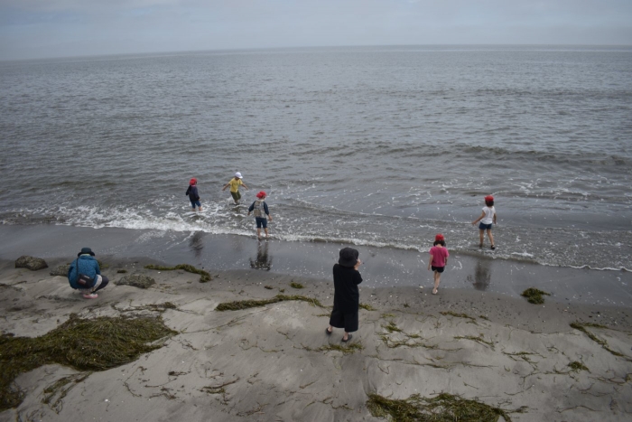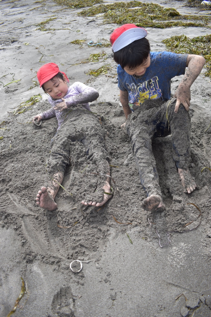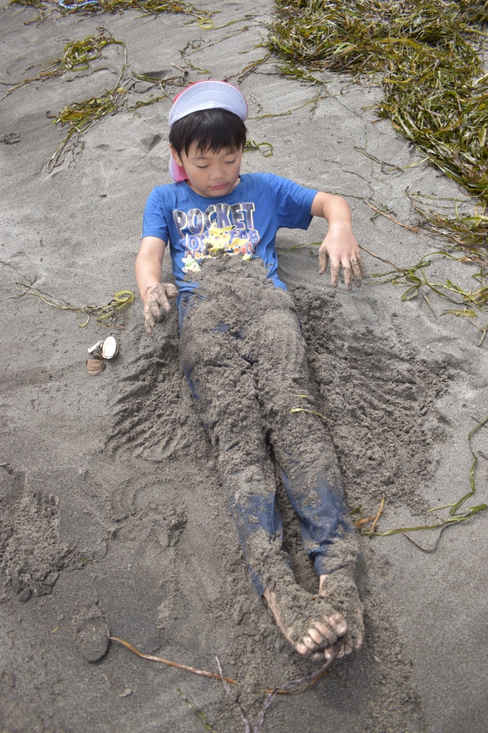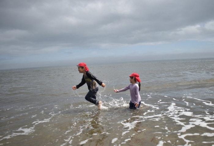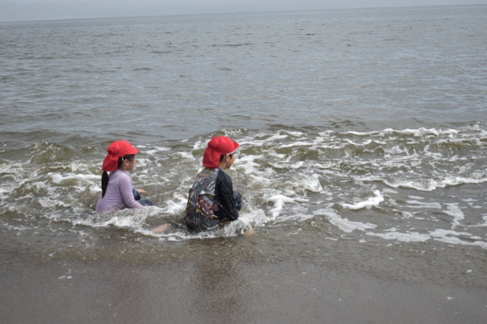 前日から,わくわくしながら自分たちで必要なものを準備,1年生との再会に笑顔を輝かせ,バスの中でも話に花を咲かせていたそうです。目的地に着くと,中西別とは違う海辺の景色に大興奮⤴ サンダルに履き替え,波や砂の感触,貝殻集めを楽しんでいましたが,1年生のダイナミックな動きに感化され,海水の掛け合い,波越えジャンプ,温泉のように浸かる,砂埋めなど,海辺でしか味わえない遊びを満喫していました。