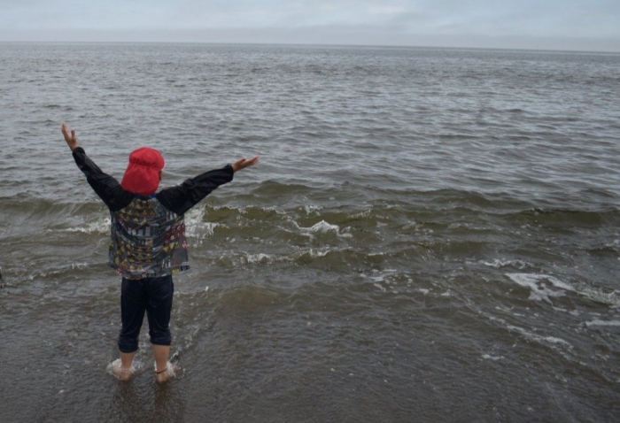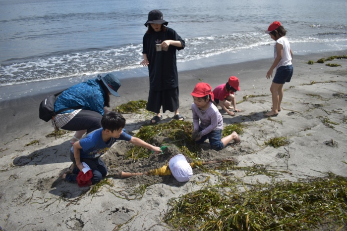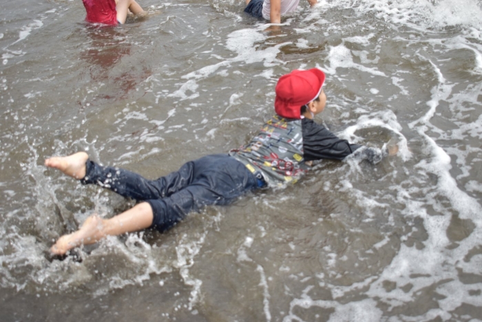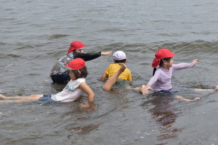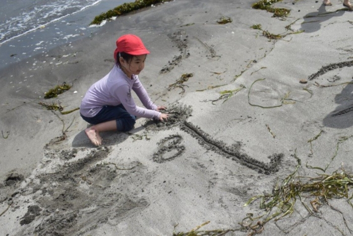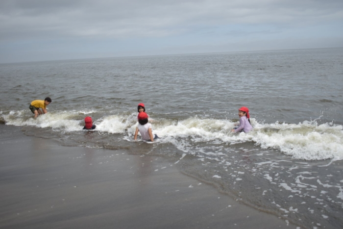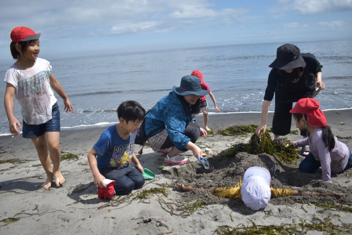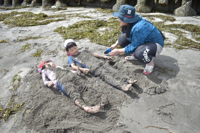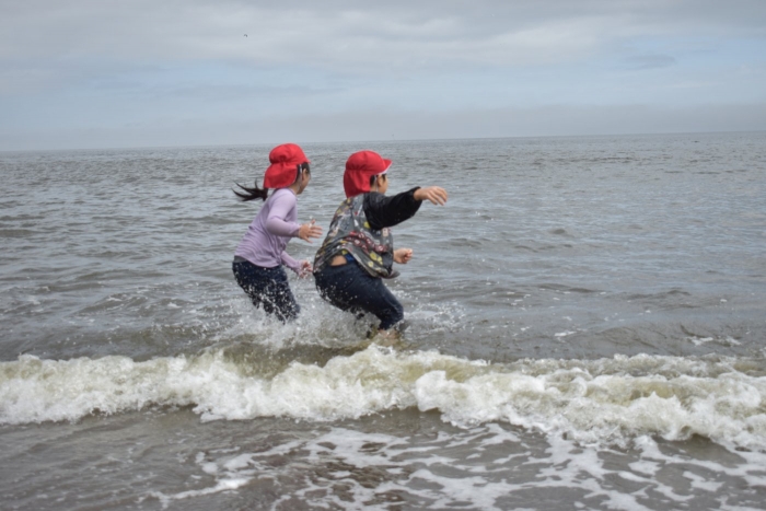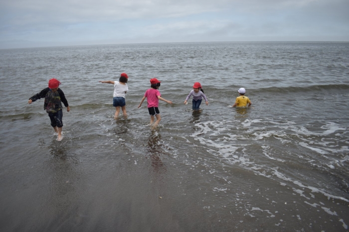 前日から,わくわくしながら自分たちで必要なものを準備,1年生との再会に笑顔を輝かせ,バスの中でも話に花を咲かせていたそうです。目的地に着くと,中西別とは違う海辺の景色に大興奮⤴ サンダルに履き替え,波や砂の感触,貝殻集めを楽しんでいましたが,1年生のダイナミックな動きに感化され,海水の掛け合い,波越えジャンプ,温泉のように浸かる,砂埋めなど,海辺でしか味わえない遊びを満喫していました。