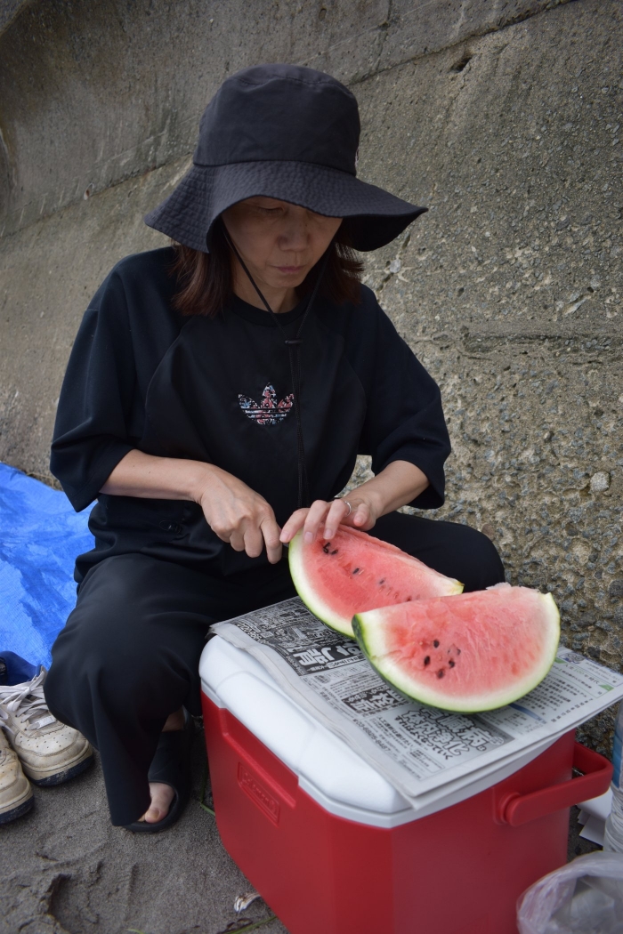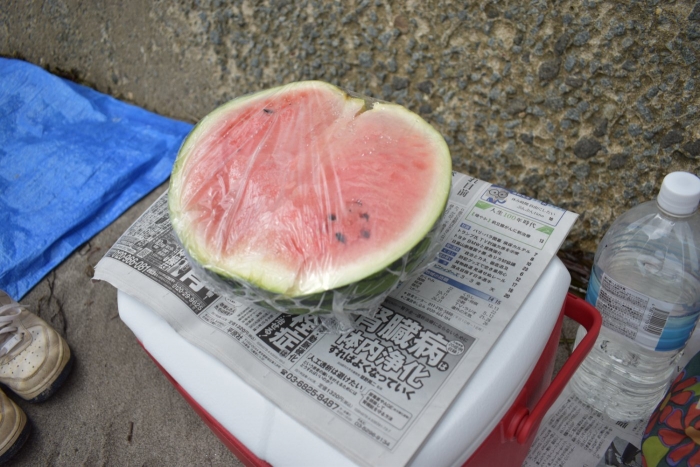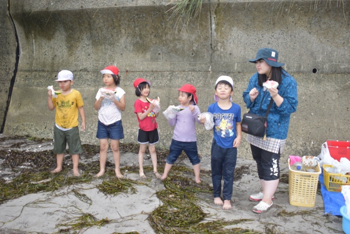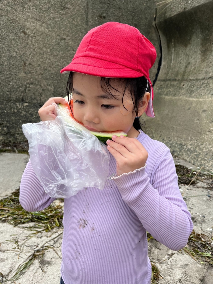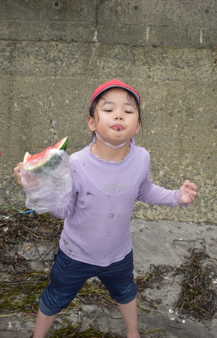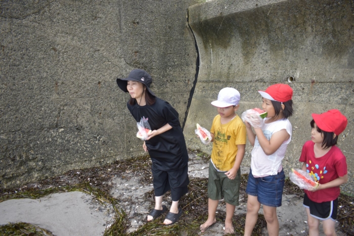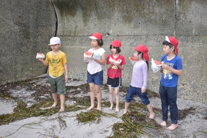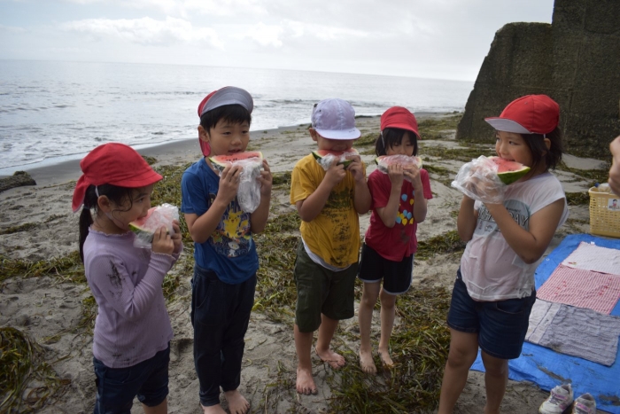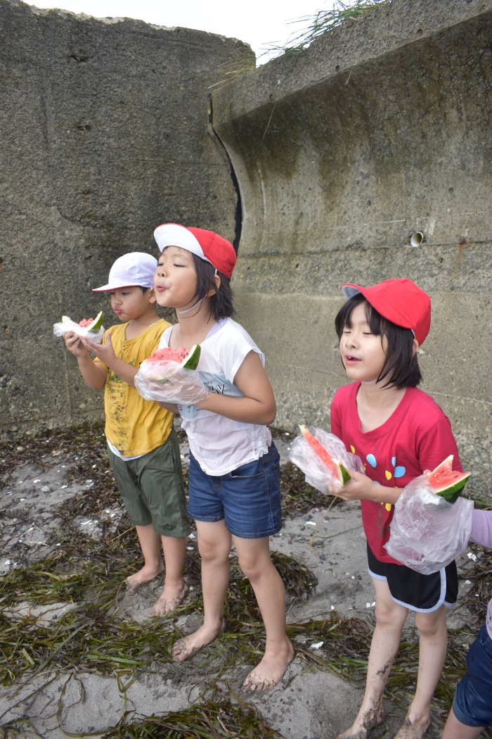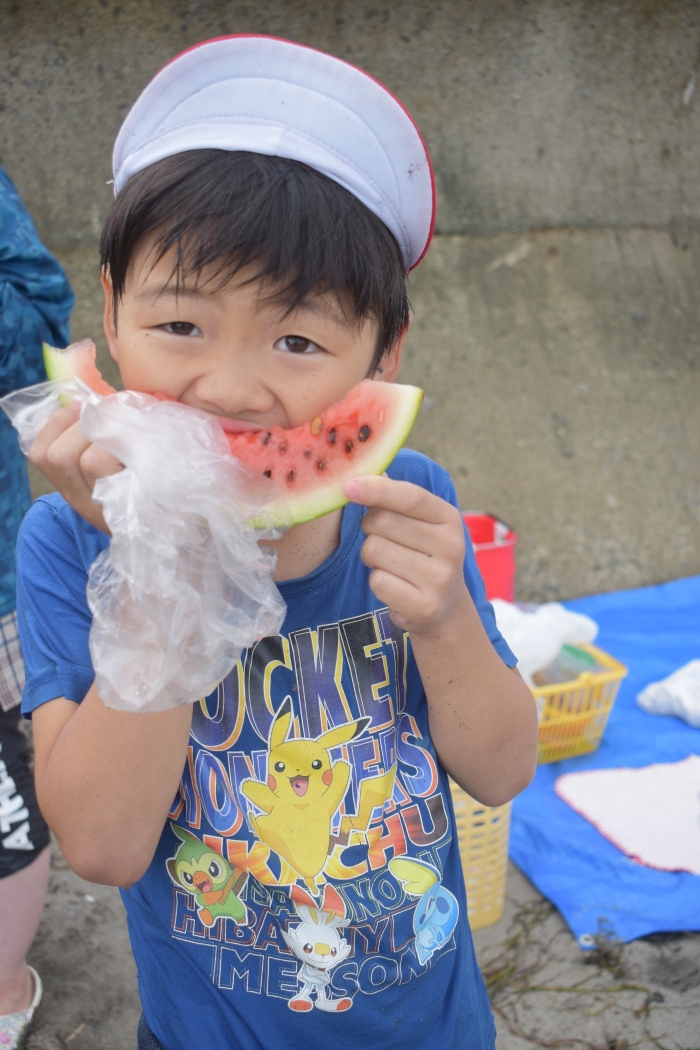 1年生が育てたスイカを味わい,1年生が考えた『スイカ種飛ばし大会!?』も開催☆彡 交流を通して,新たな体験をすることができた年長児たちです。