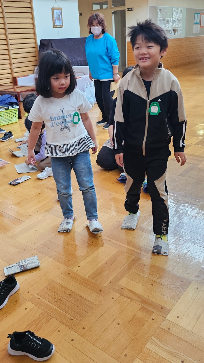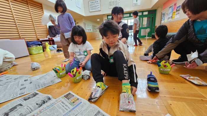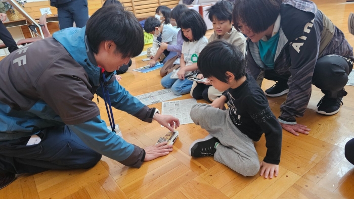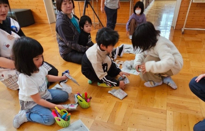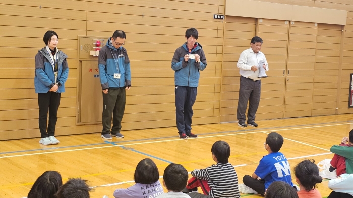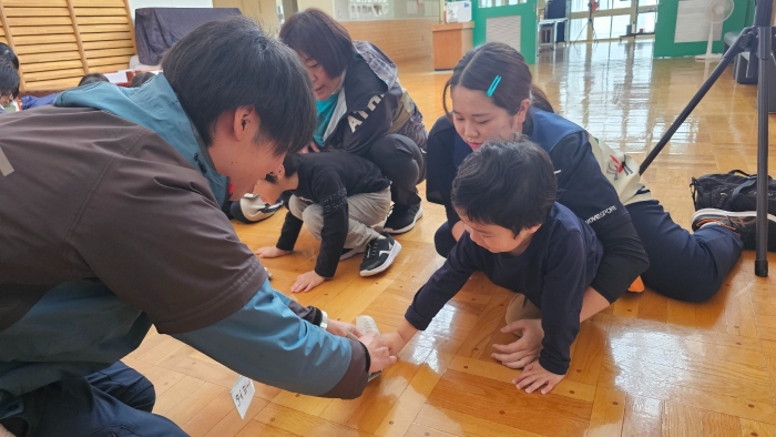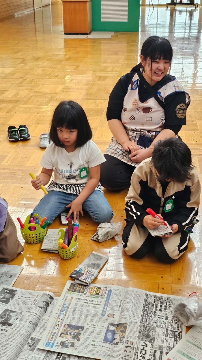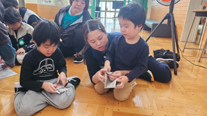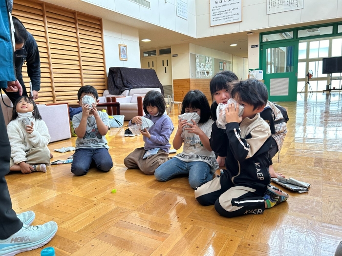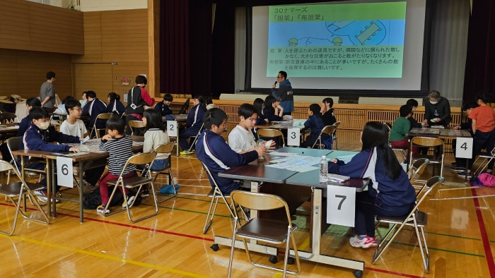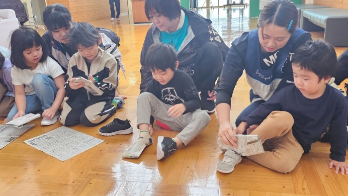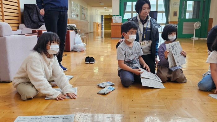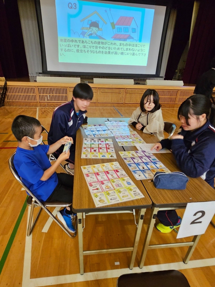 2次避難場所に着いた後も緊張感を崩すことなく,中学生の誘導に従ったり,防災・基地対策課の方の話に耳を傾けていた年長児の姿,場の雰囲気を感じ取り静かに座っていた年少児の姿がありました。避難訓練後は,ネイパル厚岸の方を講師に迎え,防災学習に取組みました。幼稚園・小学校低学年は『新聞紙を活用したスリッパ・コップ工作』,小学校中高学年・中学生は縦割班で『防災カードゲームを通しての災害時の対処法』を学び合いました。