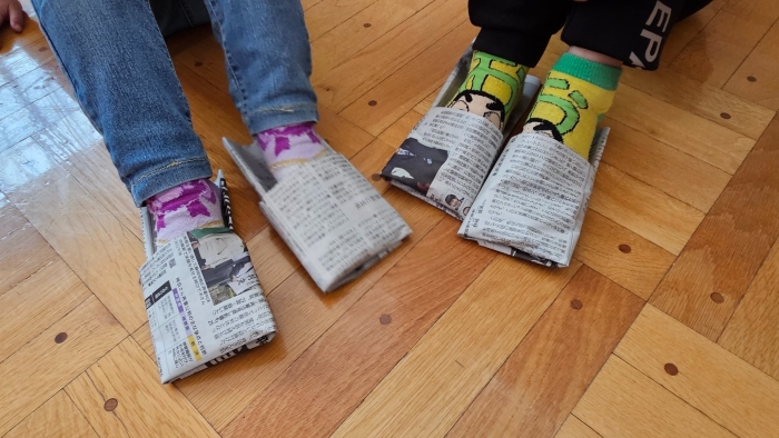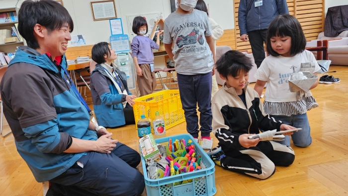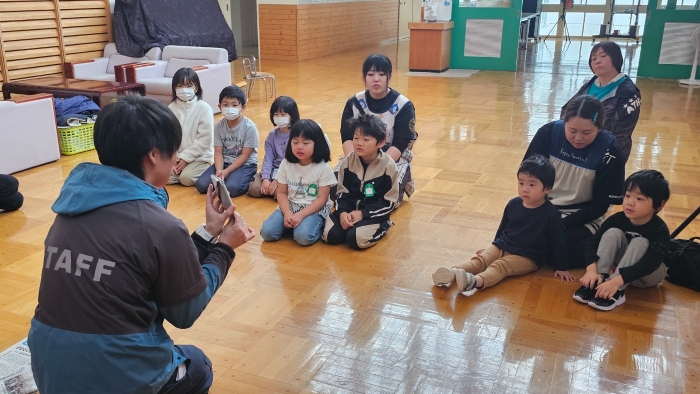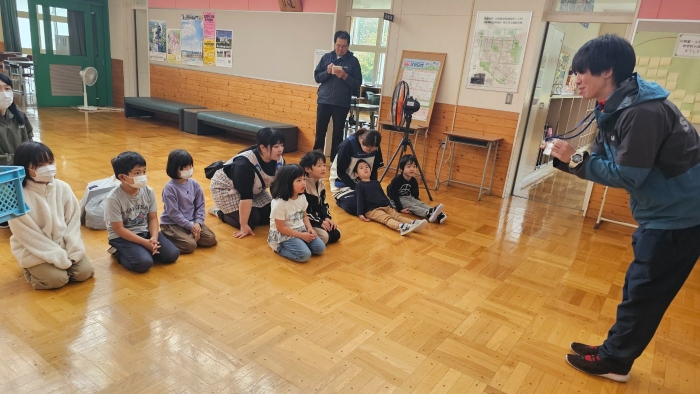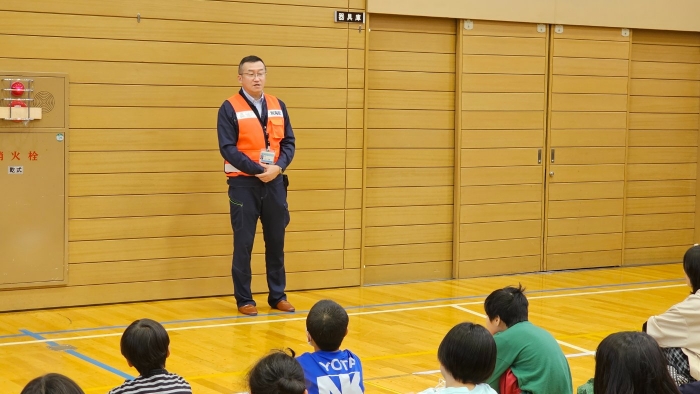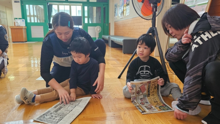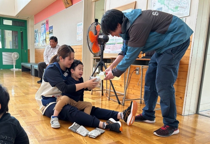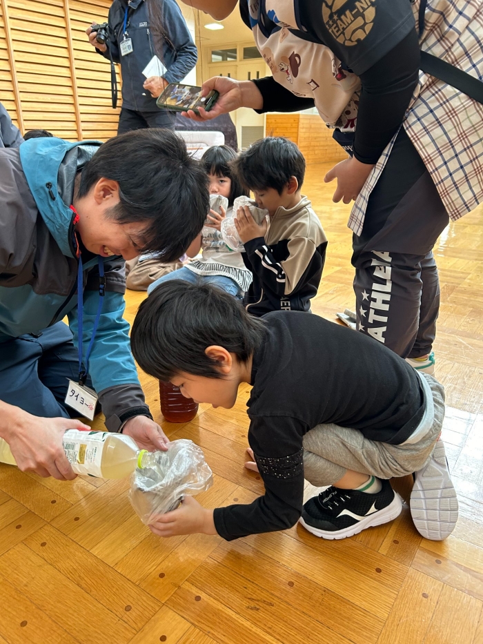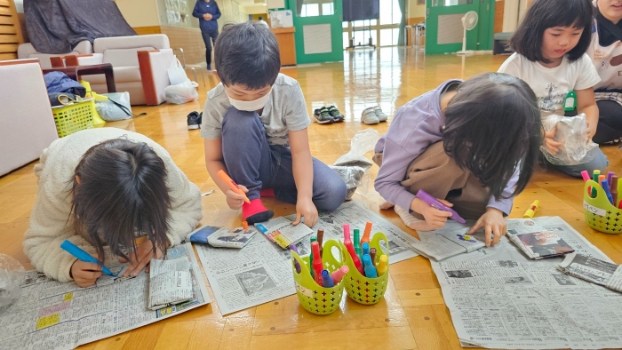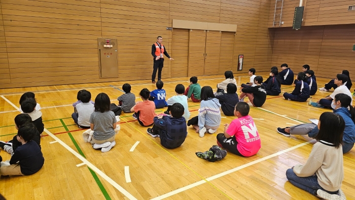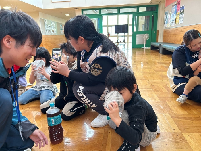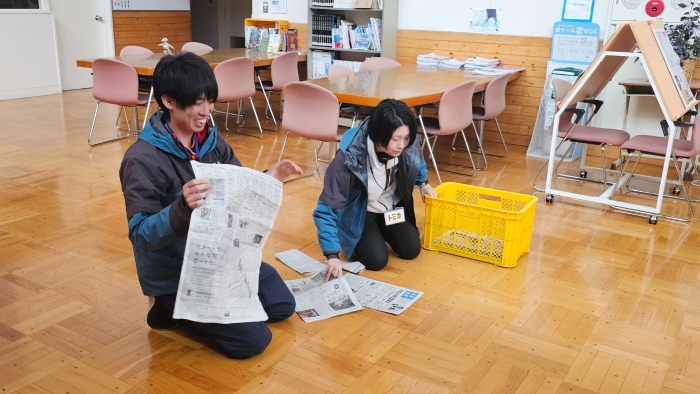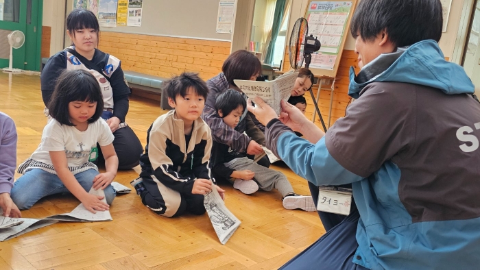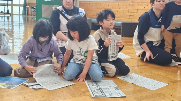 2次避難場所に着いた後も緊張感を崩すことなく,中学生の誘導に従ったり,防災・基地対策課の方の話に耳を傾けていた年長児の姿,場の雰囲気を感じ取り静かに座っていた年少児の姿がありました。避難訓練後は,ネイパル厚岸の方を講師に迎え,防災学習に取組みました。幼稚園・小学校低学年は『新聞紙を活用したスリッパ・コップ工作』,小学校中高学年・中学生は縦割班で『防災カードゲームを通しての災害時の対処法』を学び合いました。