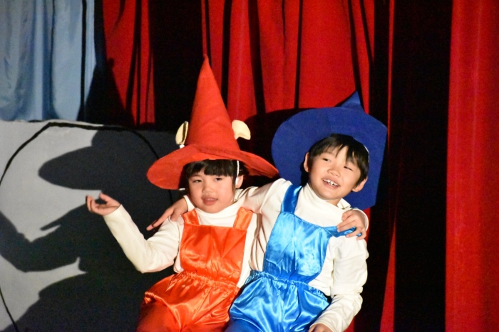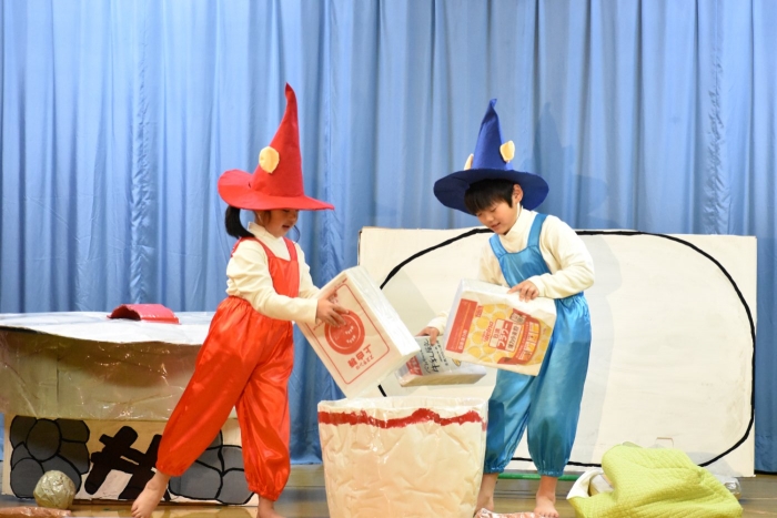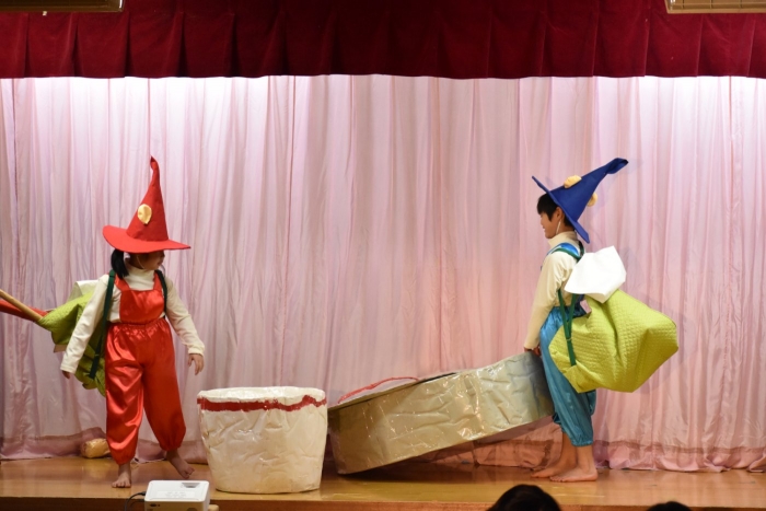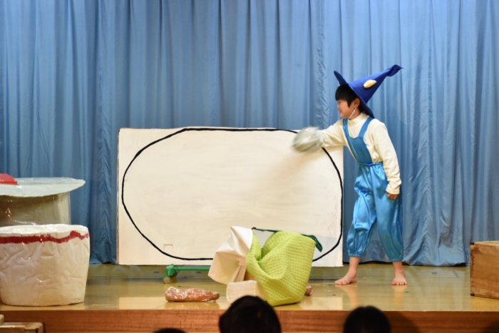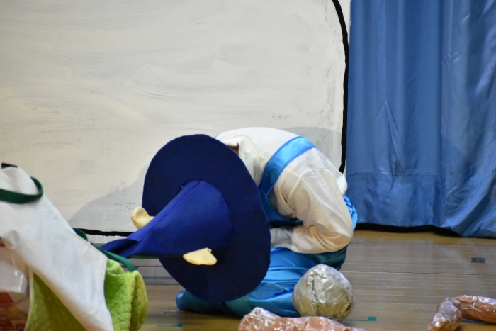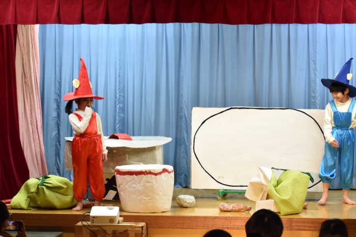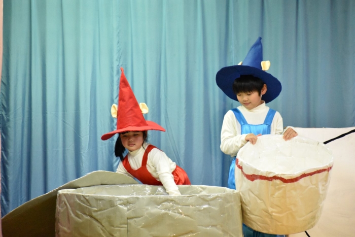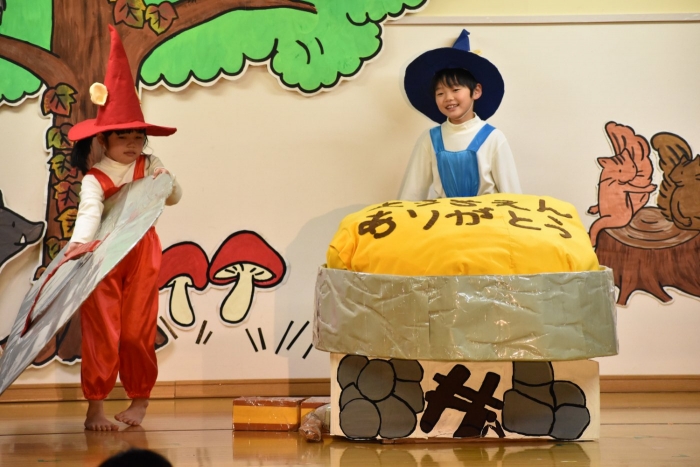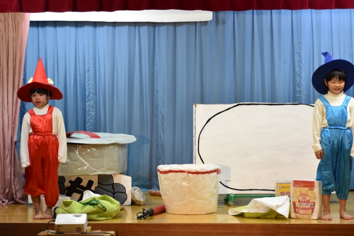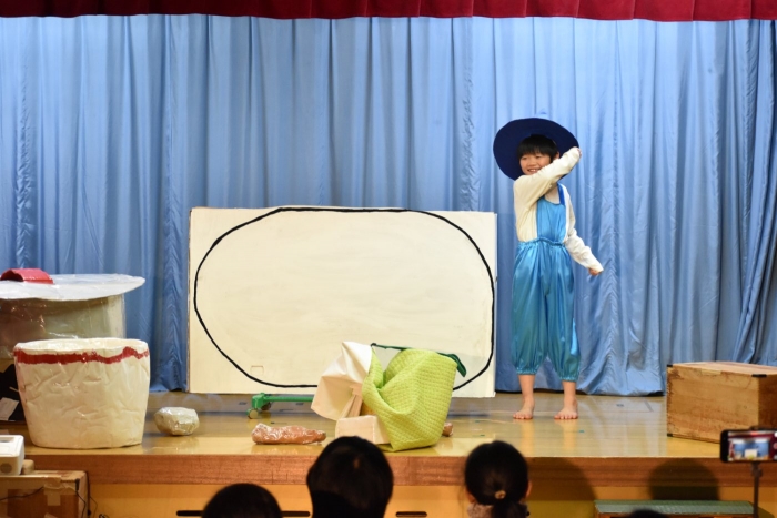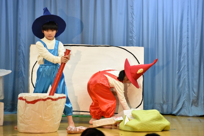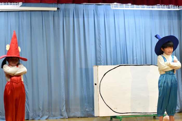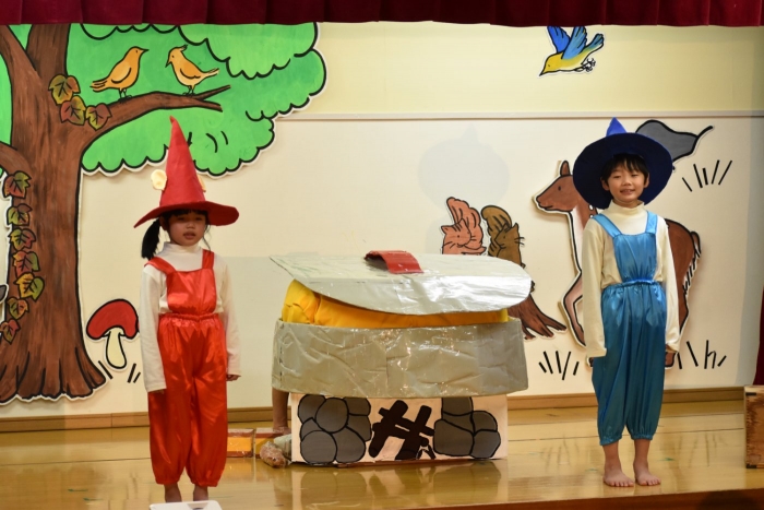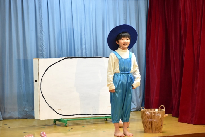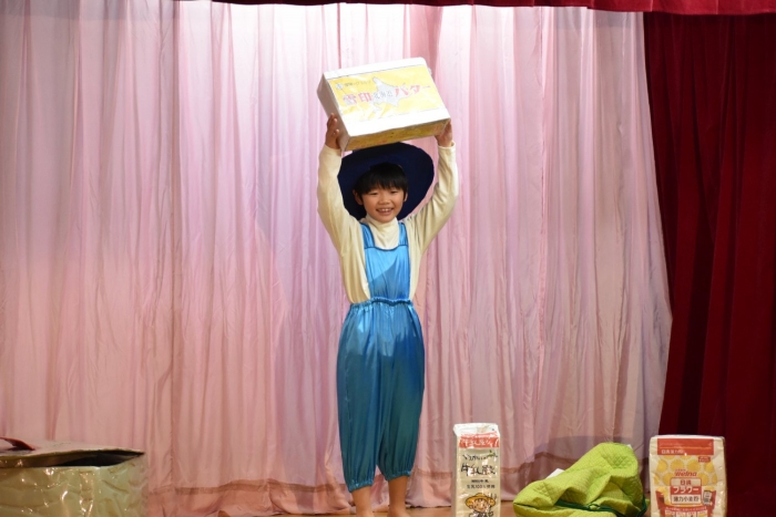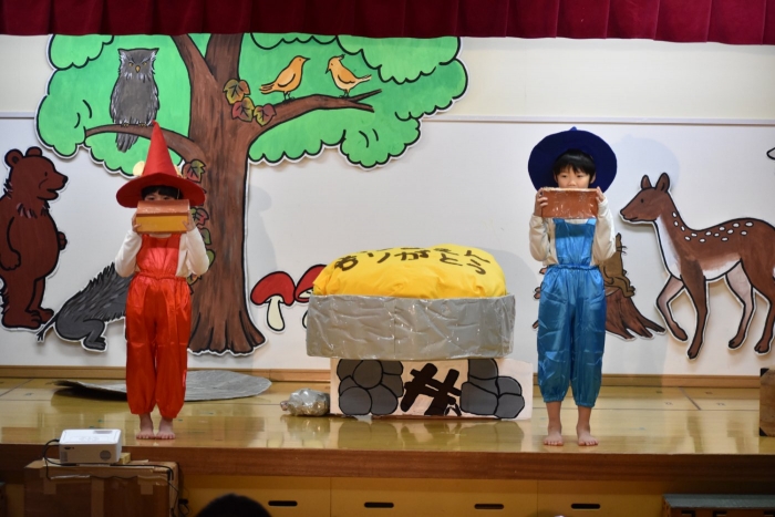 初めての言語劇に挑戦! セリフを覚えたり,観客に届く声で伝える難しさを感じたりしていましたが,「お客さんに楽しんでほしい」「面白いと思ってほしい」という思いをもって取組んできました。自主的に台本を持ち帰り,家の人と一緒に読み合わせ練習もしたそうです。絵本を見ながら小道具や大道具を作ったり,『ぐり』と『ぐら』になり切り,実際にカステラ作り(その模様を劇中でお届け)もしたことで,よりこの作品が大好きになったひまわり組。たくさんの思い入れをもって取組んできたことが伝わる劇に,会場全体が心を動かされていました。