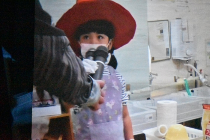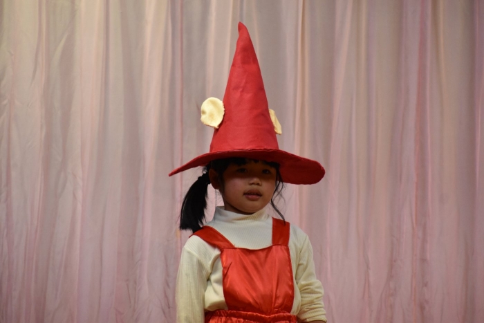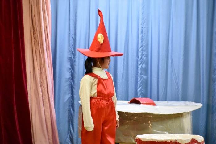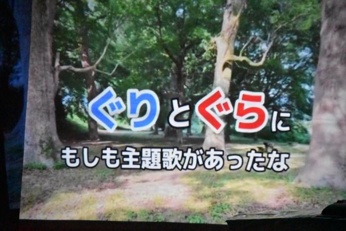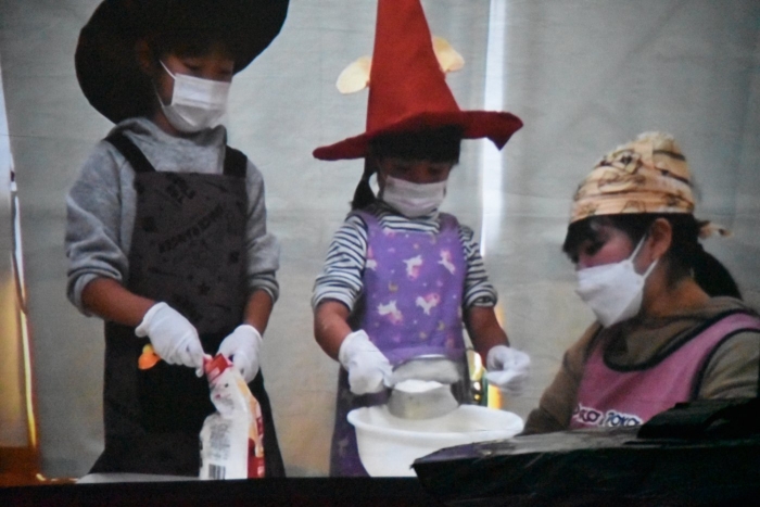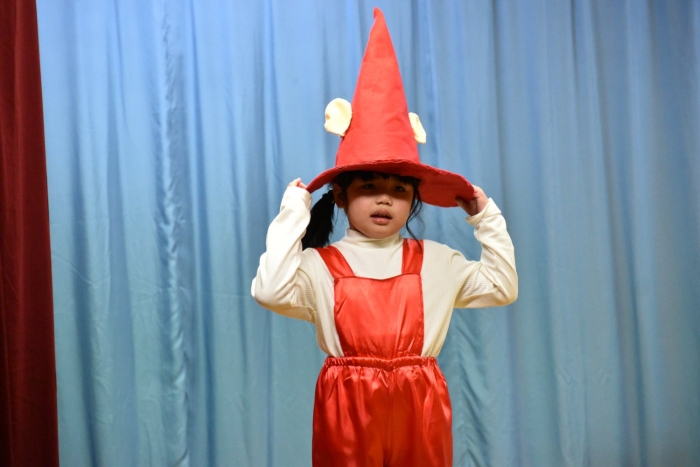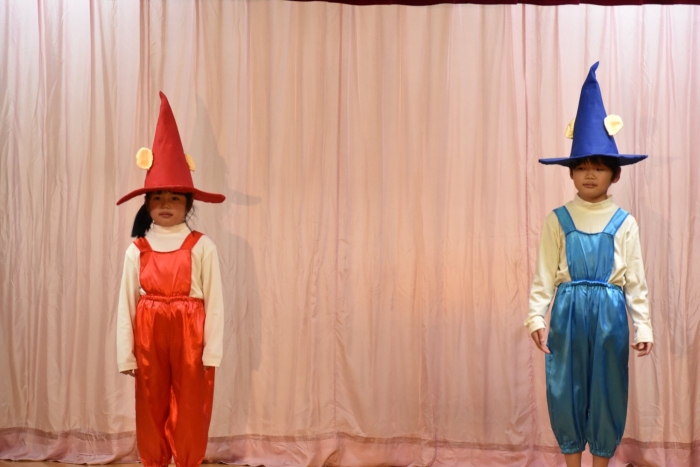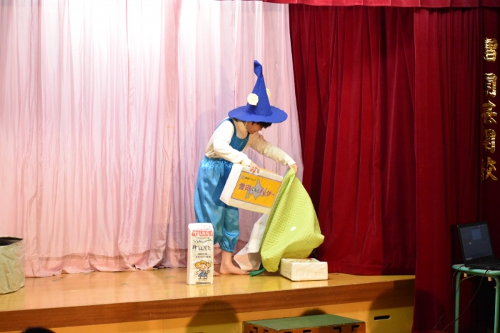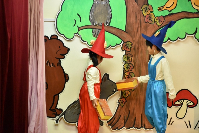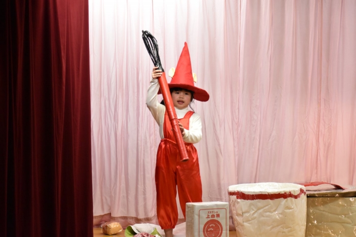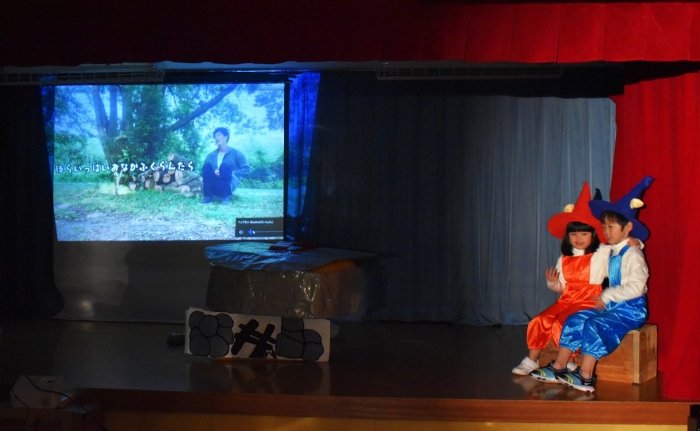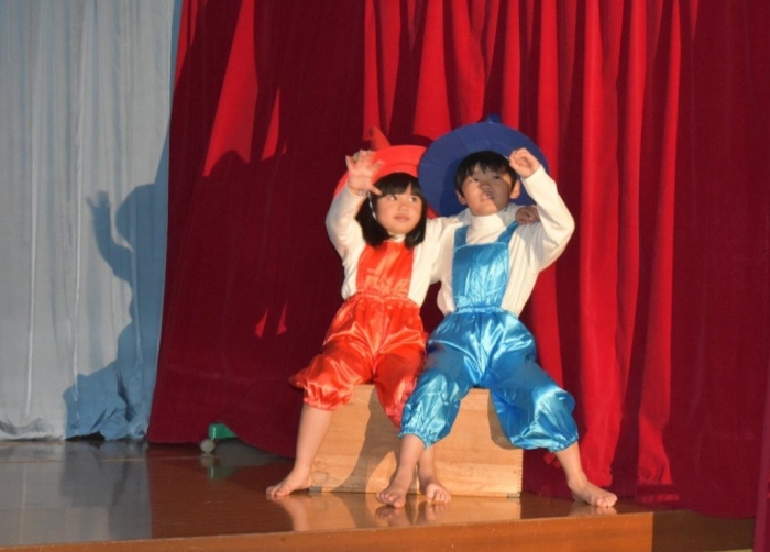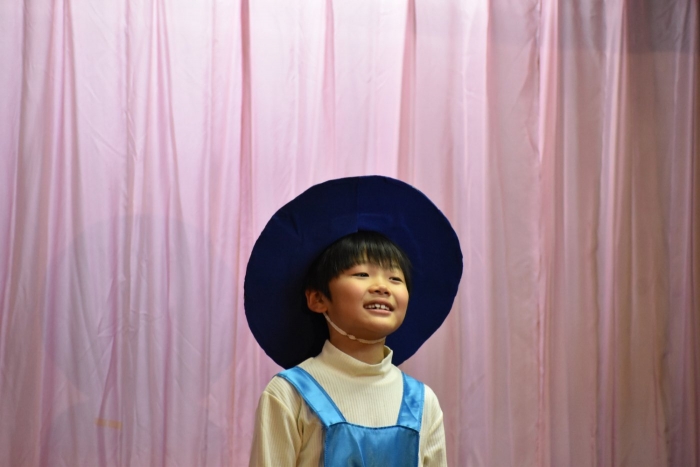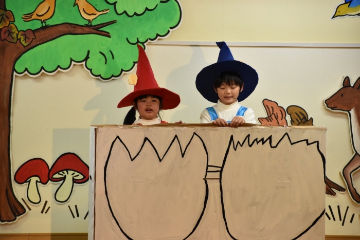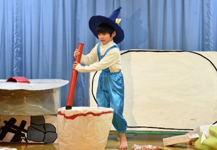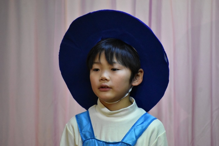 初めての言語劇に挑戦! セリフを覚えたり,観客に届く声で伝える難しさを感じたりしていましたが,「お客さんに楽しんでほしい」「面白いと思ってほしい」という思いをもって取組んできました。自主的に台本を持ち帰り,家の人と一緒に読み合わせ練習もしたそうです。絵本を見ながら小道具や大道具を作ったり,『ぐり』と『ぐら』になり切り,実際にカステラ作り(その模様を劇中でお届け)もしたことで,よりこの作品が大好きになったひまわり組。たくさんの思い入れをもって取組んできたことが伝わる劇に,会場全体が心を動かされていました。