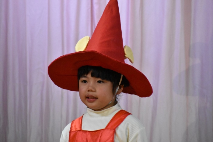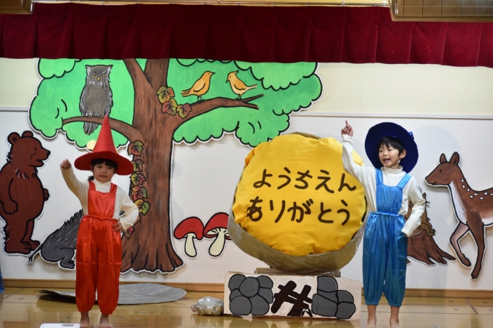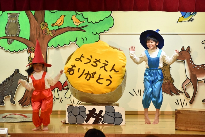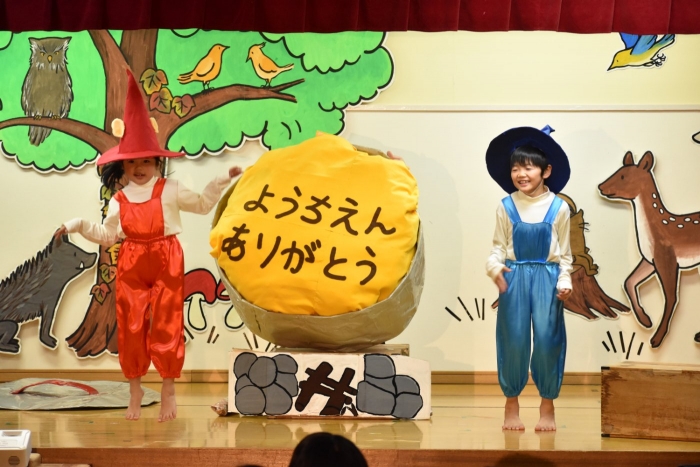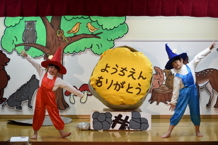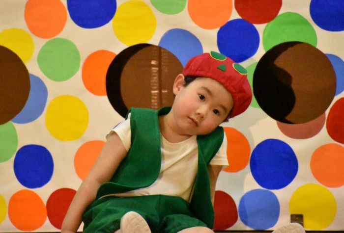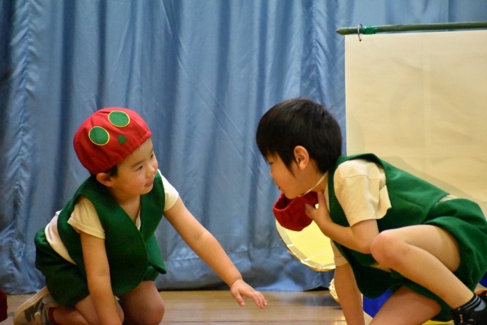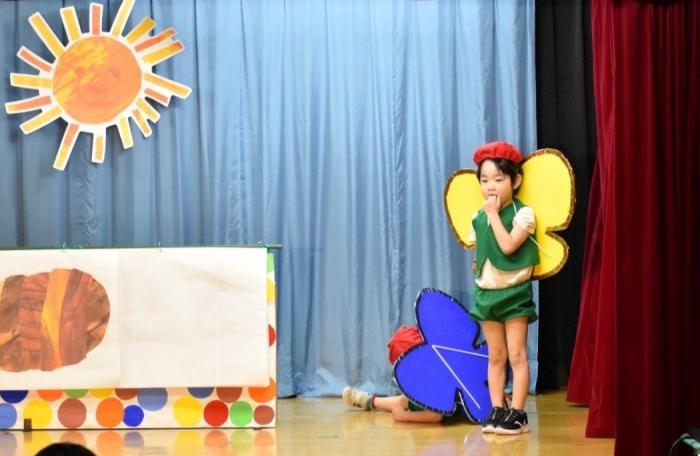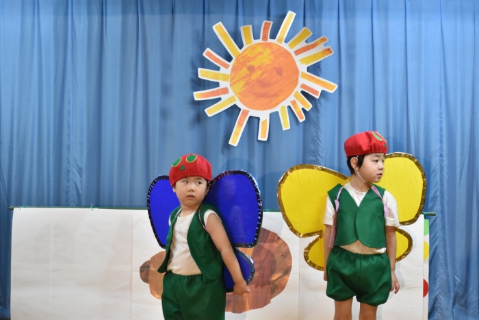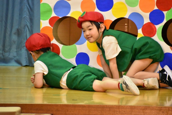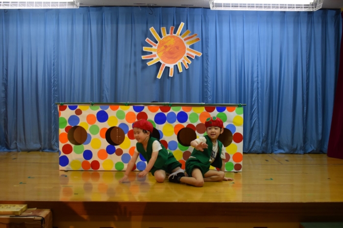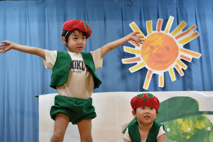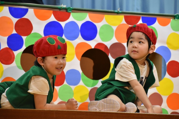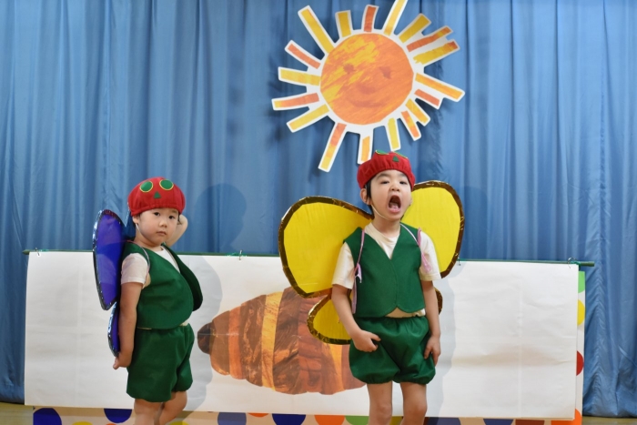 『はらぺこあおむし』の絵本や歌が大好きなすずらん組。絵本を観ながら熱唱したり,おあむしになって食べる真似をしたり,お昼寝のタオルケットを被り蛹に,開いて蝶になって楽しんでいました。初練習の時から,歌いながらあおむしになり切ったり,ステージでは客席の先生や年長児に笑顔で手を振る余裕まで(^^♪