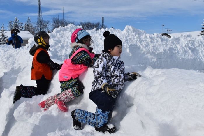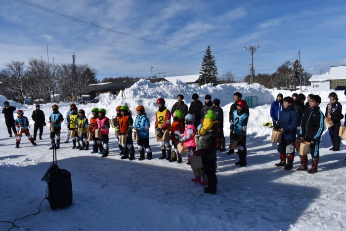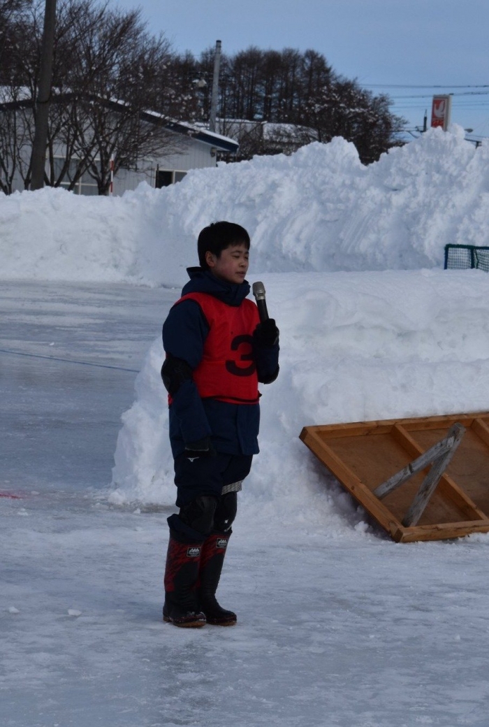 年長組は,閉会式まで参加しました。4・5・6年生,中学生の見事な連携プレイを間近に見て,目を輝かせていました。 そして,本場仕込の長靴アイスホッケーを子ども達に伝えたい!と,今年もお父様方が参戦!!  1回戦目は中学生有志と,2回戦目は全校児童と対戦したのですが,好プレー,珍プレー,大人げないプレーが続出で,会場を大いに沸かせていました。