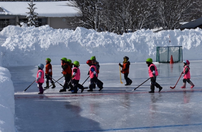 幼稚園では,年長組が1・3年生との合同チームで参戦, 年少組は応援参加をしました。今年初めての氷上ホッケーということで,早めに会場入りしてリンクで準備運動!  体が思うように動かないことも楽しんでいました。開会式でわくわく感を高め,初戦の中学生対決に刺激を受け,親しみのある1・3年生と一緒のチームということもあり,会場の雰囲気にのまれることなく参戦していた年長組です。転びそうになったり,途中でボールを見失いそうになったりしながらも,懸命にボールを追いかけ食らいついている姿に逞しさを感じました。年少児も,大好きな年長組の姿を目で追い,一生懸命応援していました。