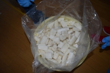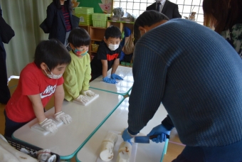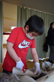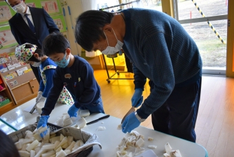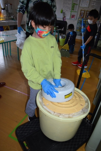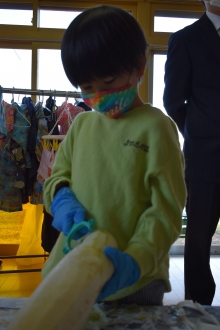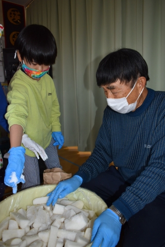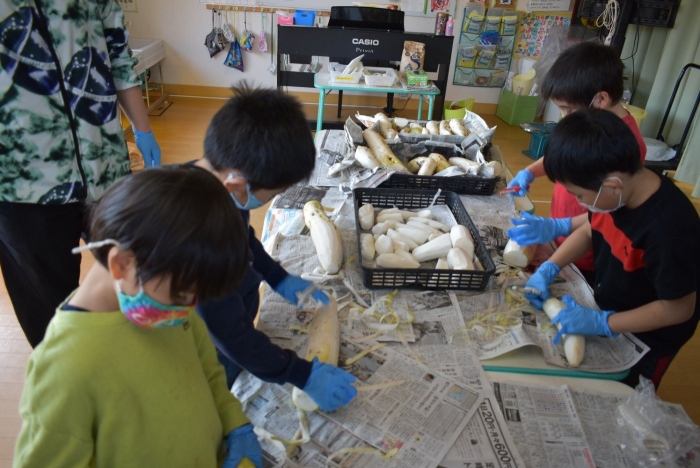 本日の工程は,ピーラーでの皮剥き,包丁切り,切った大根への塩振り,おもし乗せ。大根の量に驚きながらも,ピーラーでの皮剥き作業&包丁での切作業を頑張りました。 公開保育週間で,中学校の先生方も漬物作りの場面を参観。ハラハラ,ドキドキしながら子ども達の様子を見守っていました。