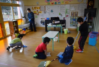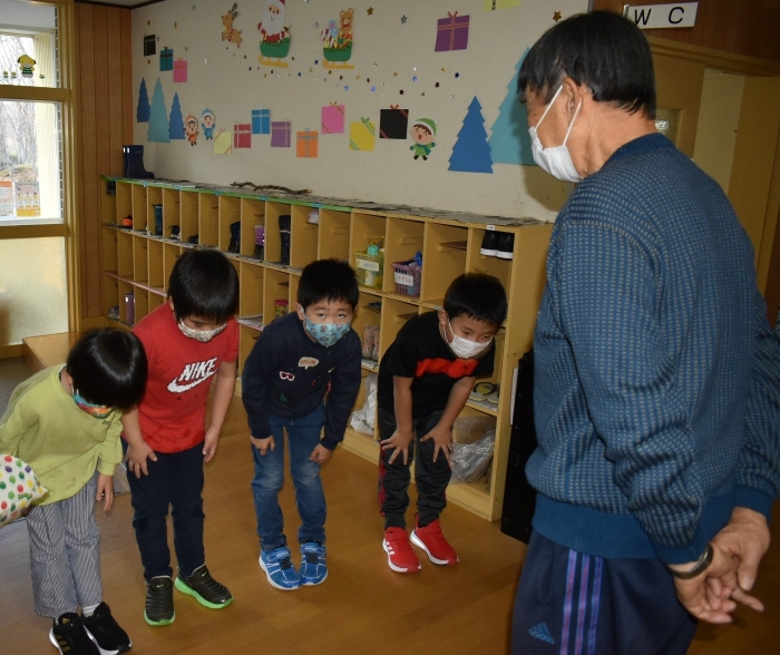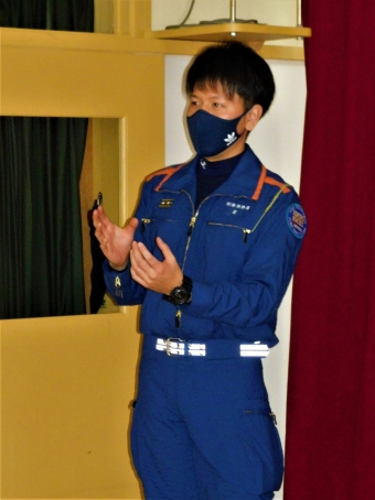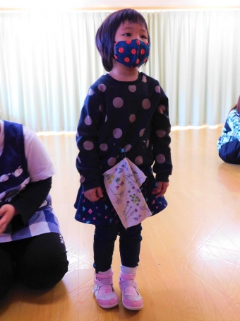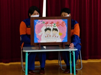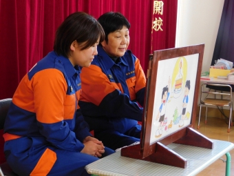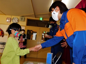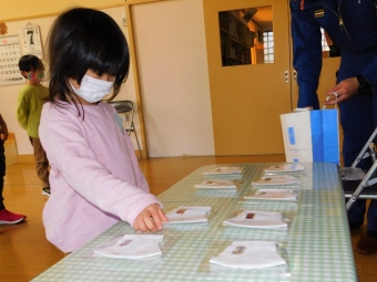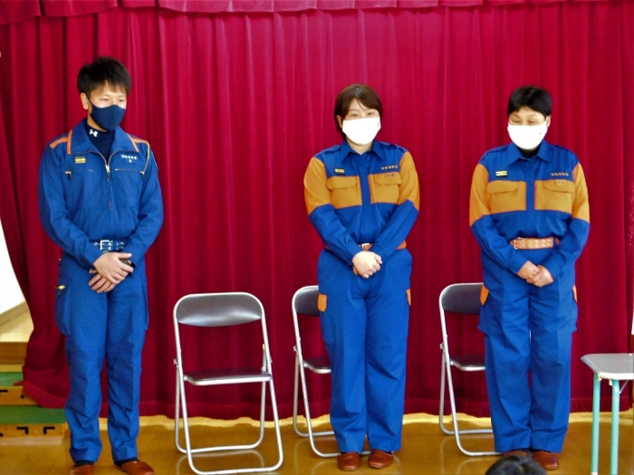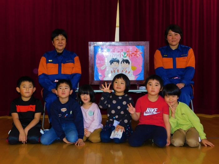 別海消防署職員,別海消防団女性団員の方が,防火活動の一環で来園。 女性団員の方による防火紙芝居の読み聞かせ,そして,消防・救急車のワンポイント付の手作りマスクをプレゼントしていただきました。 調理や暖房など,日常生活の中で活用されている便利な火,でも一歩使い方を誤ると災害へ…。子どもが一番気を付けなければいけないのは『火遊び』,大人のいない所で火を使わないことを約束しました。