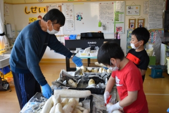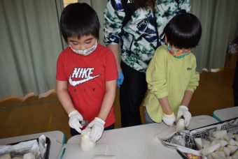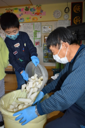 野菜栽培や幼児教育アドバイザーとしてもお世話になっている畑中先生を講師に迎え,本年度も年長組『漬物作り体験』を行いました。使った大根は25キログラム! 畑中先生の畑で採れたものを有り難くいただきました。