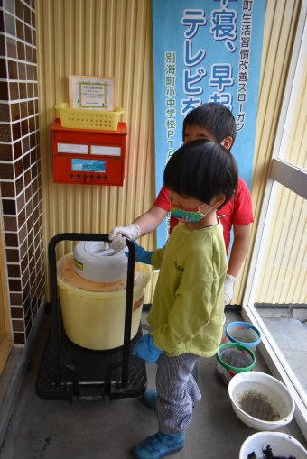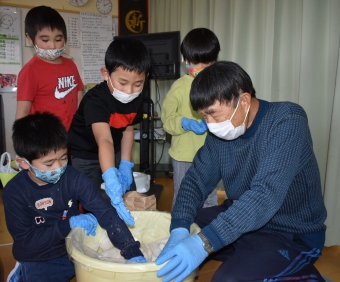 用意した漬物樽(2斗樽)いっぱいに詰まった大根を見て,何とも言えない達成感を味わっていた年長組,その後の塩振りがかなり豪快でした(笑) そして,早くも味見することや,漬物作り体験part2(12/15(水))を楽しみにしていた子ども達です。