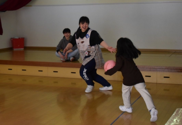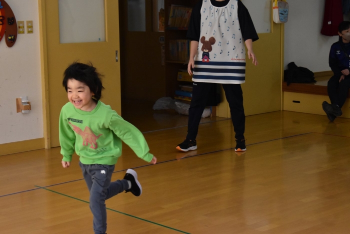 朝の遊びでは,園児たちが楽しんでいる集団遊び『かたき』を