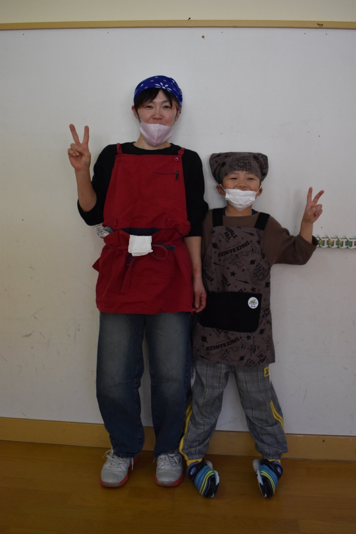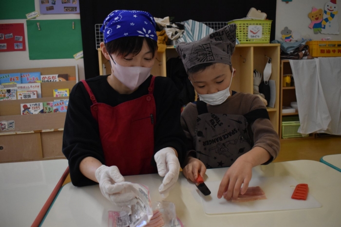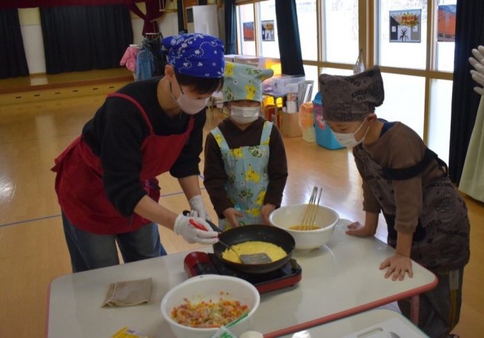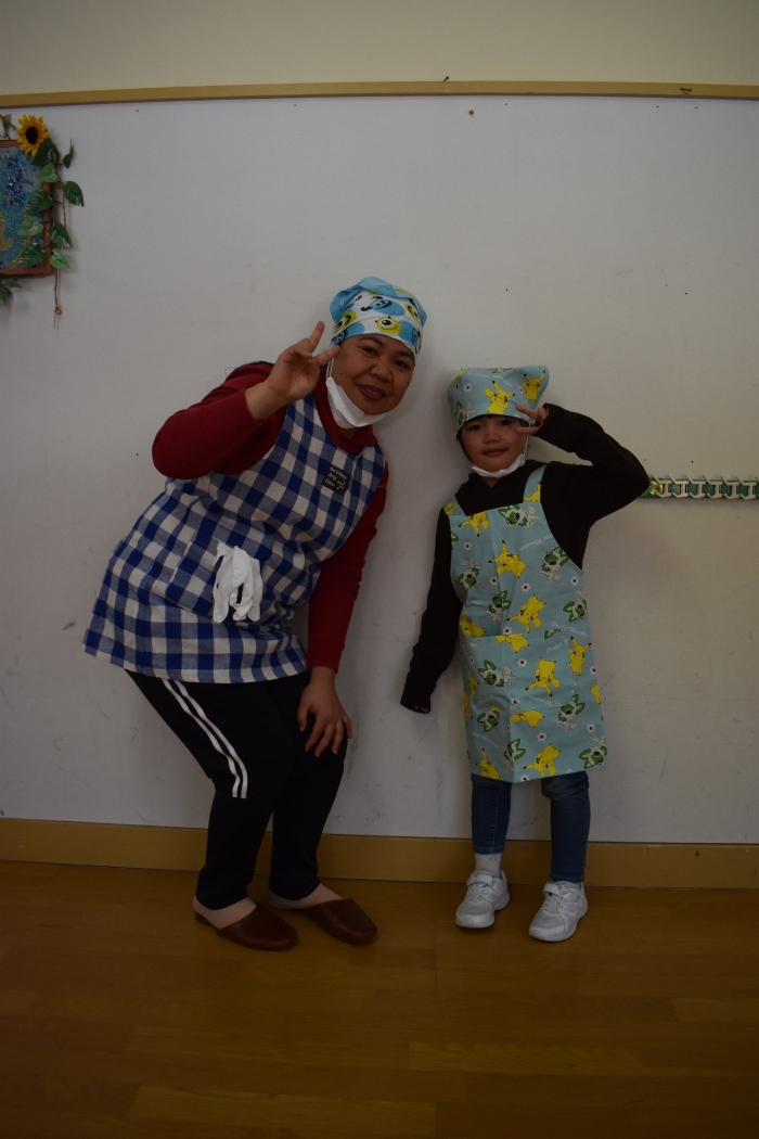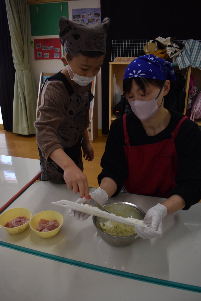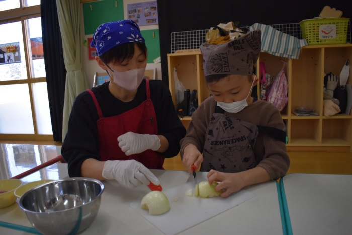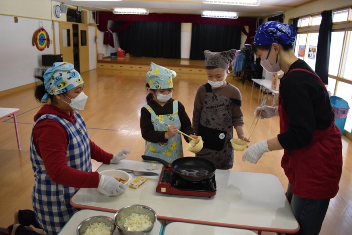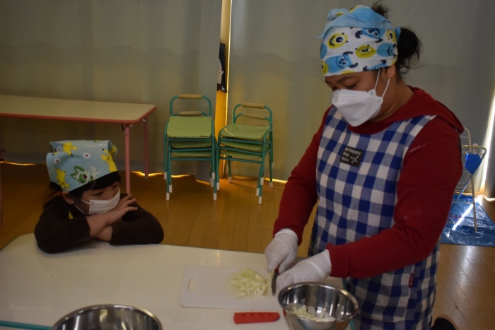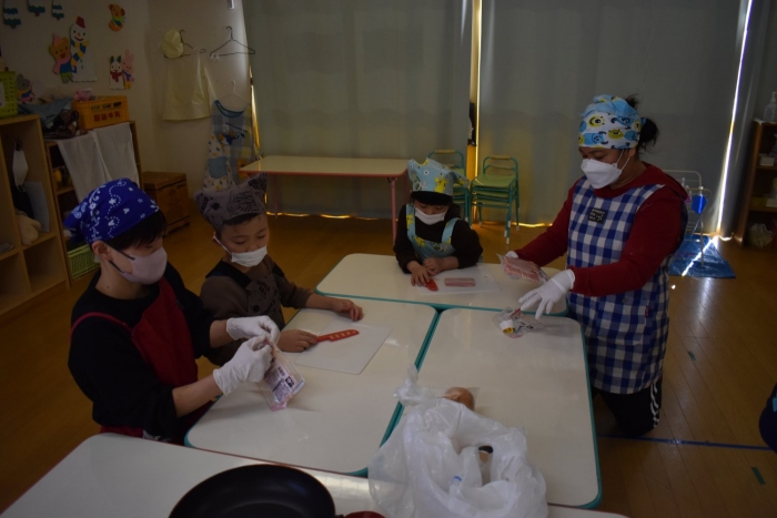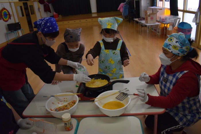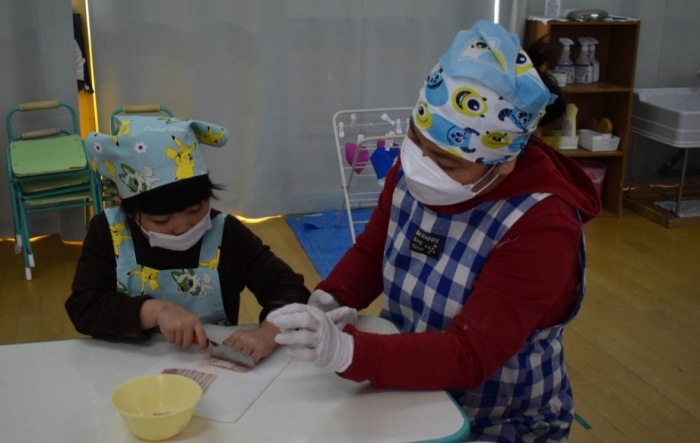 年長児が話題にした家庭料理のことをきっかけに,実現しました『年長組親子クッキング』