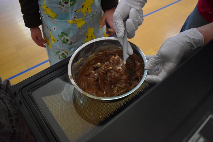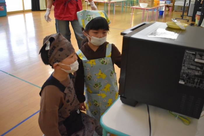 レンジの前で,チョコ,きび糖,無塩バターが溶けるのを じーっと観察