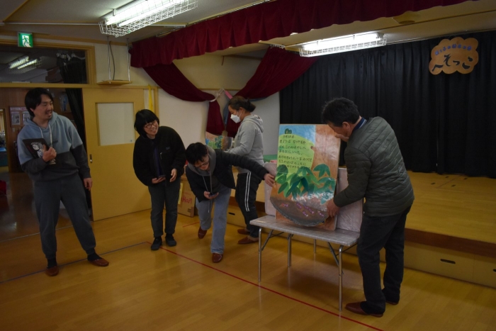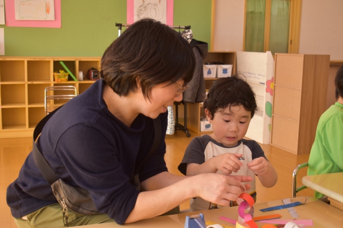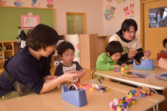 その会場を彩る装飾や年長組へ手渡すプレゼントを,お母さんや