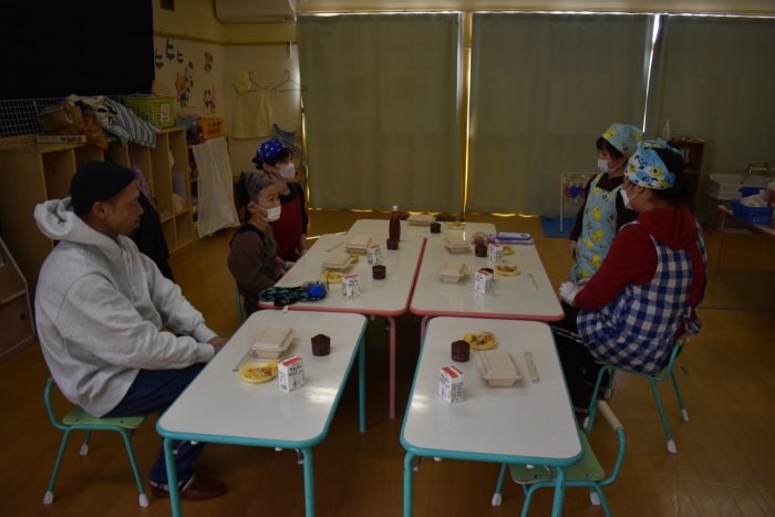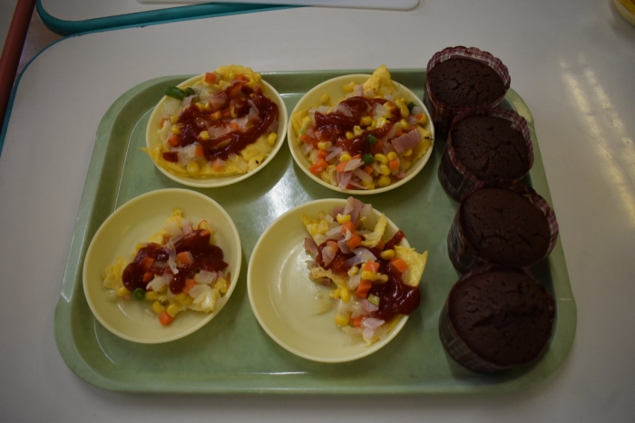 焼きあがったオムレツを,お母さん方が切り分けてくれます